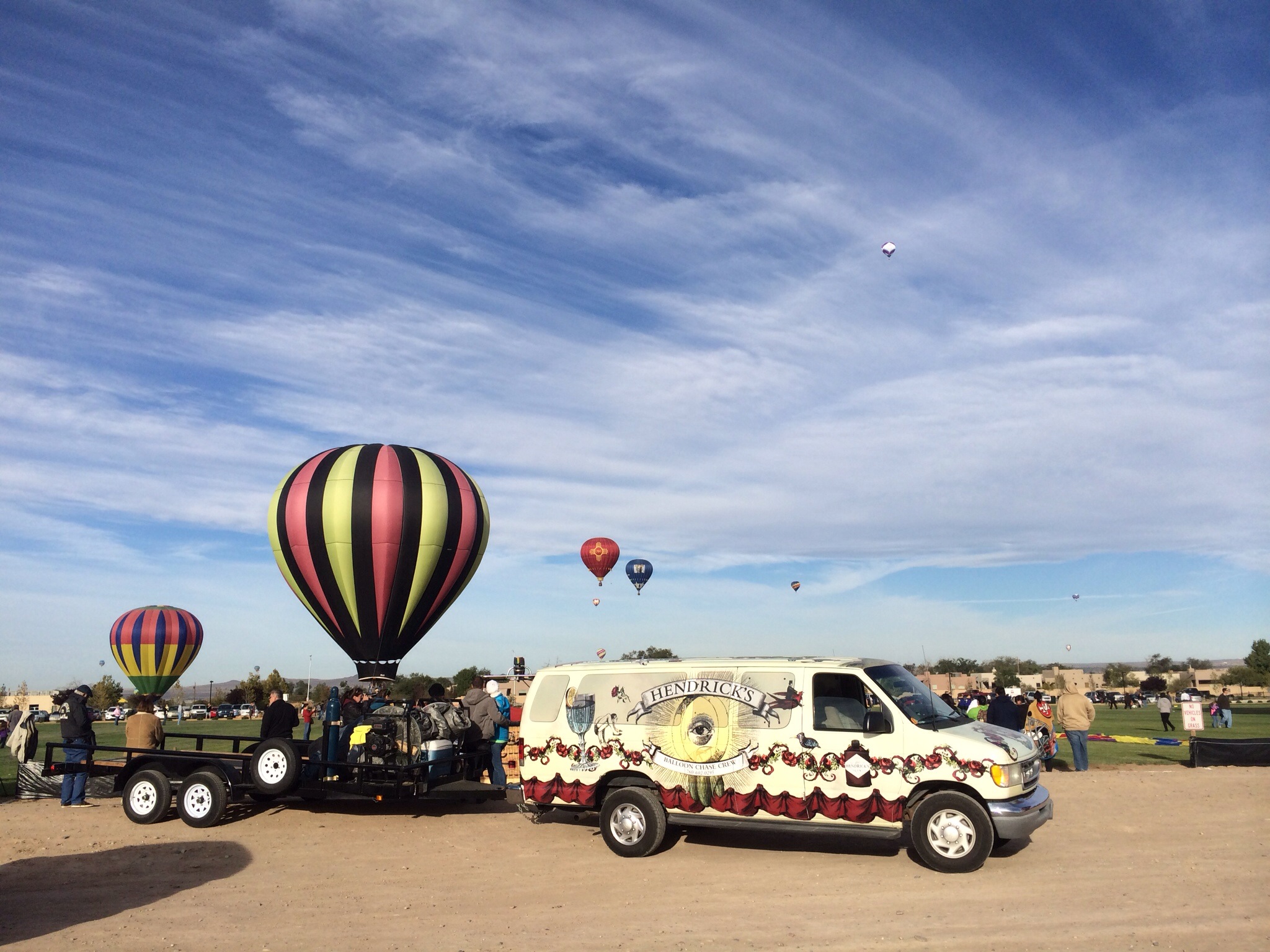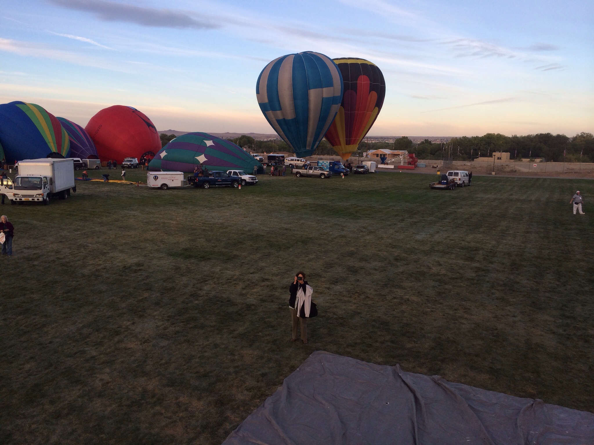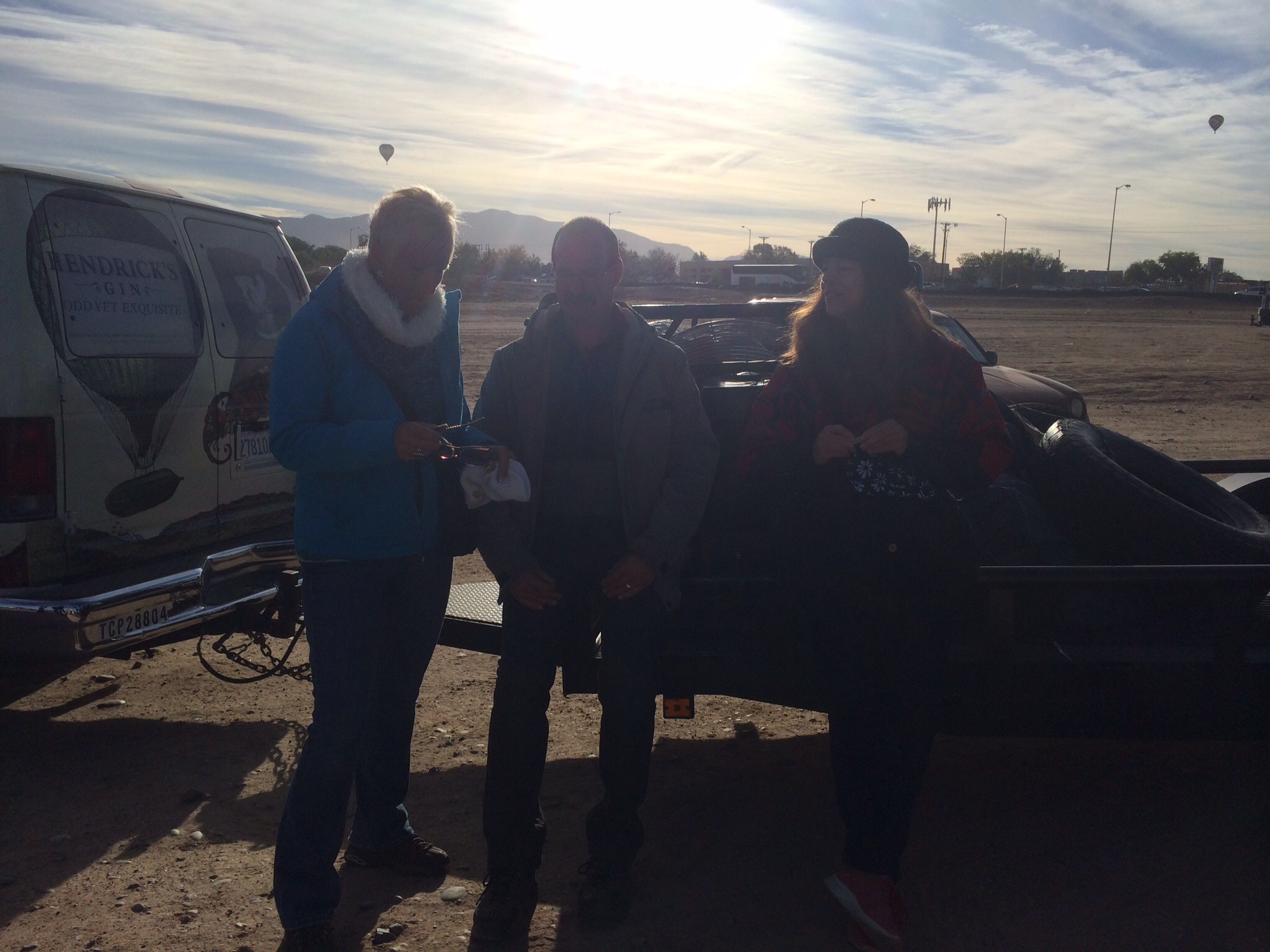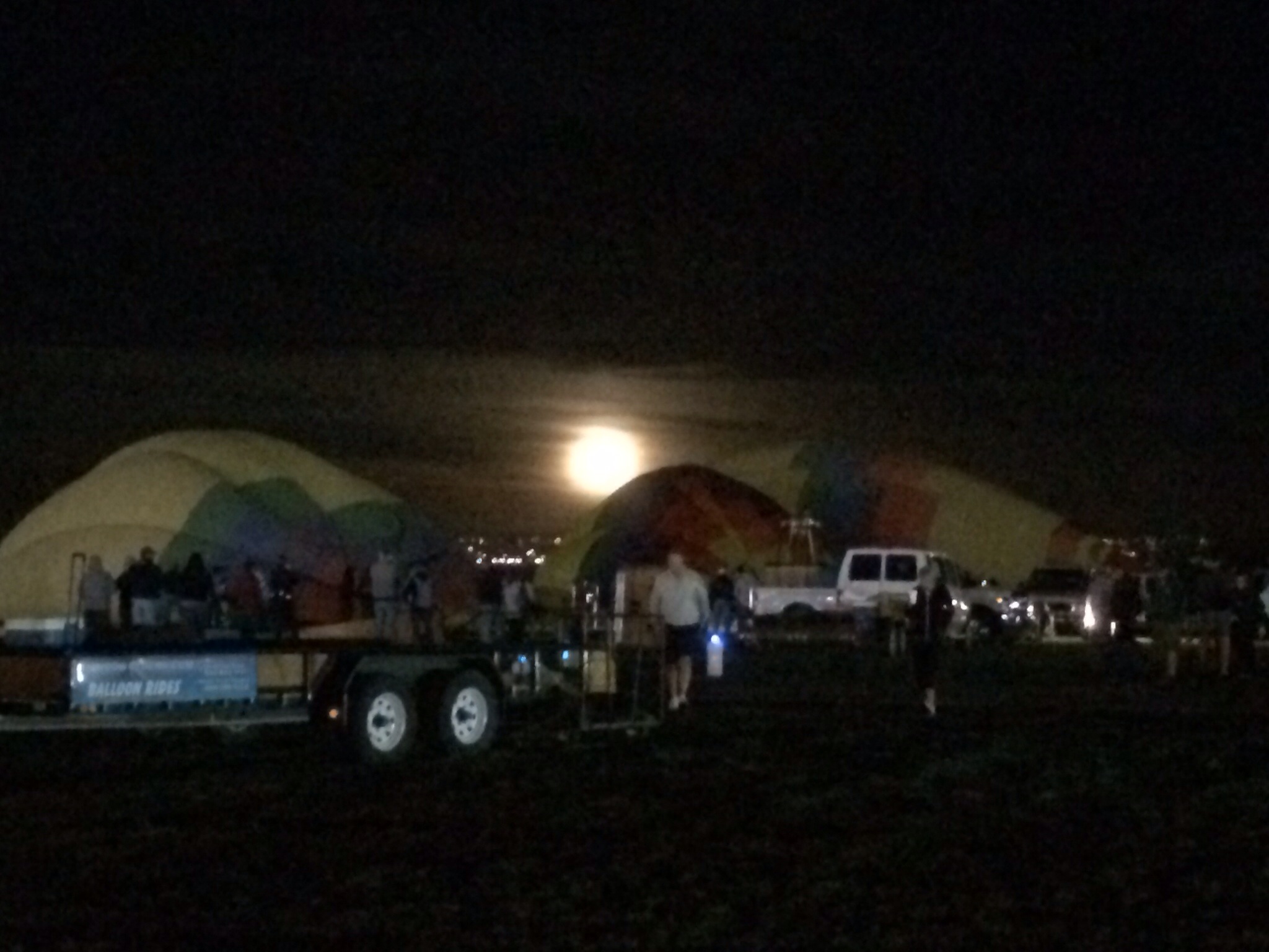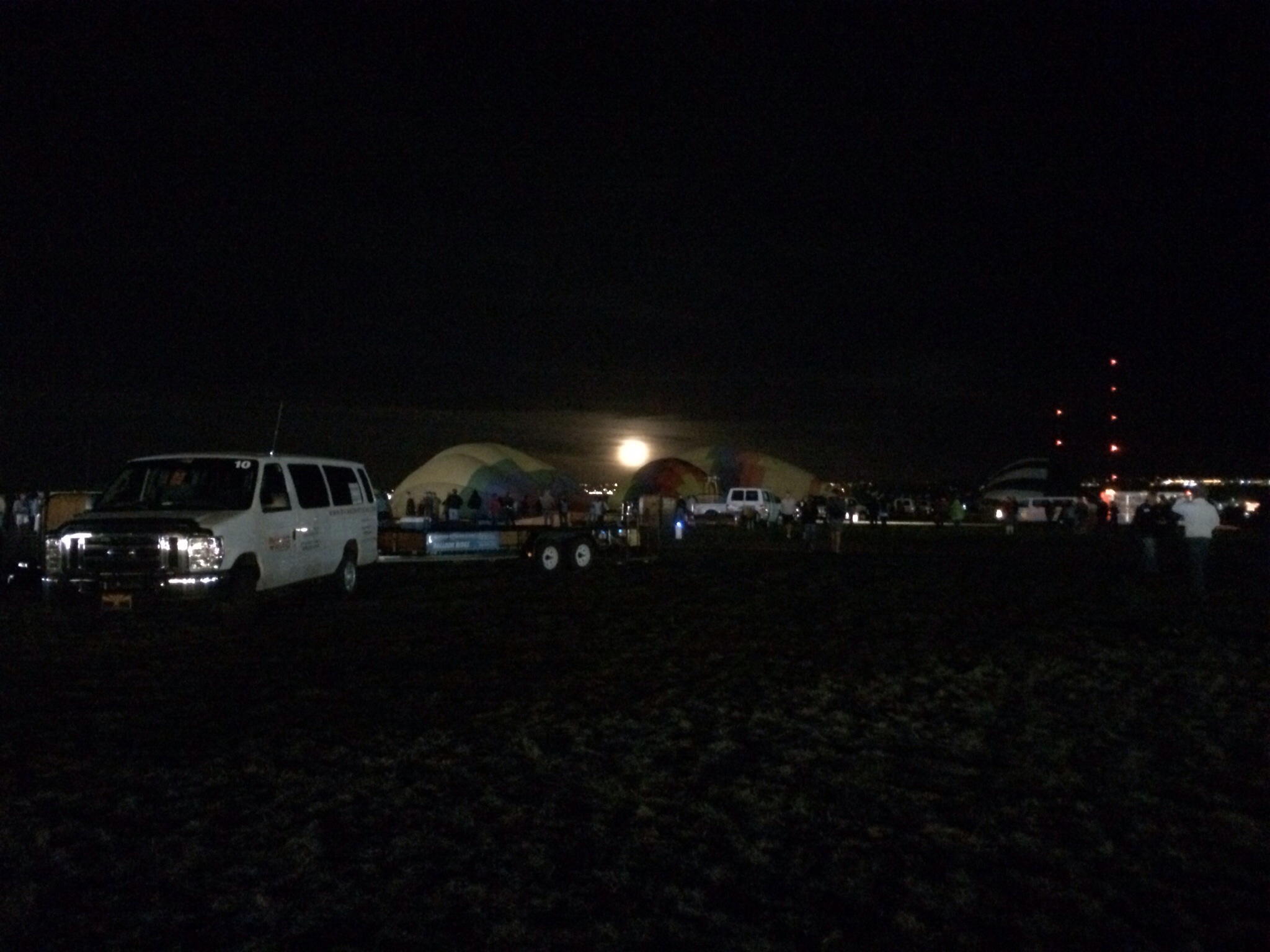 Up at 3:30 am and off to ABQ again with Celia (bless her for driving us around), Colin and Wendy. Way fewer people so we were in early and got signed in for our ride. Found out we were to be with Pilot Pierre Brunner in the Hendricks Gin balloon, oh the irony. I do love my G&T and it is the only screen printed balloon with matching chase vehicle. It is also one of the larger ones. First we watched the few dawn patrol and then got excited as the bright moon shone over the filling balloons. This was a very good sign!