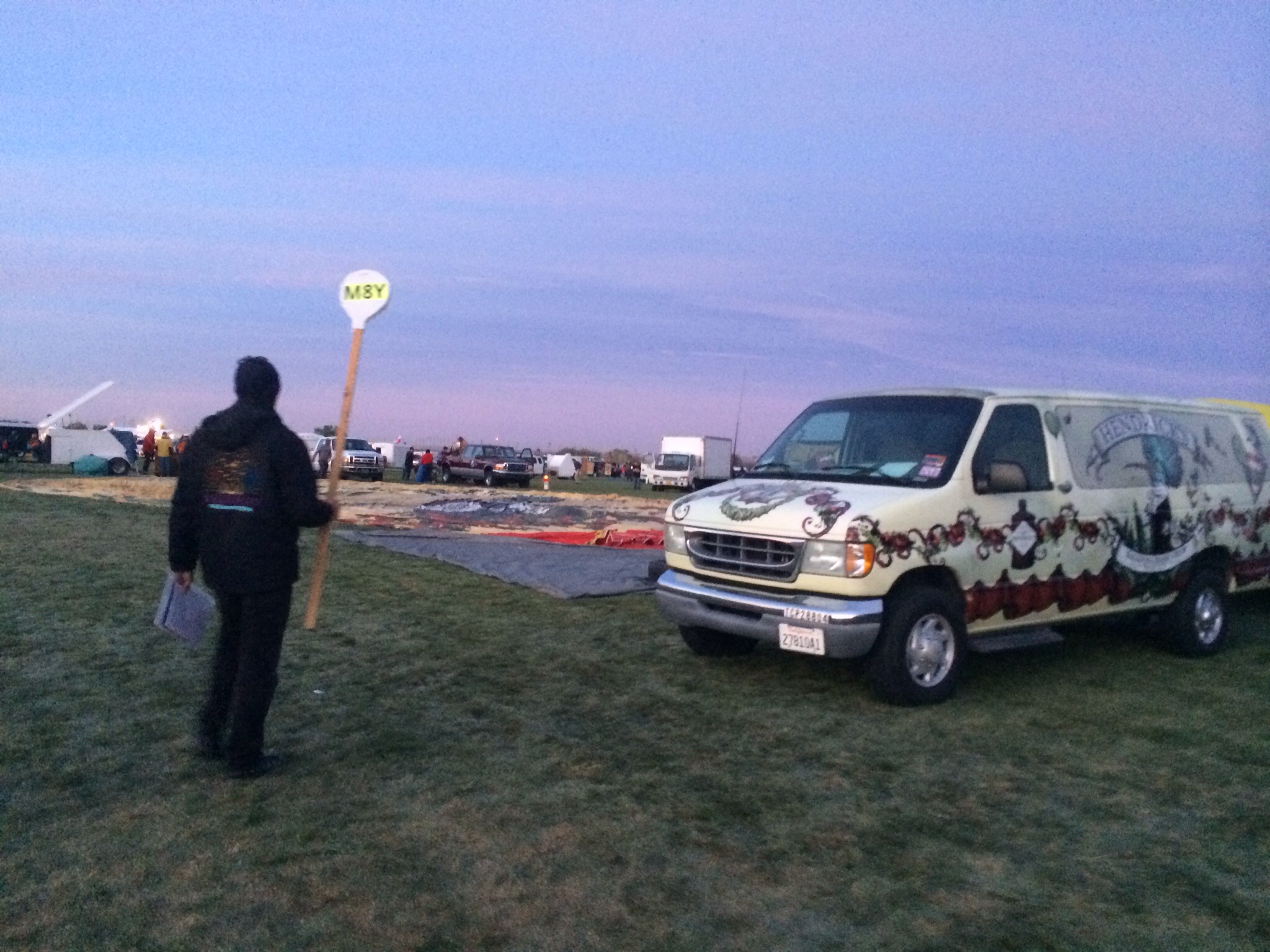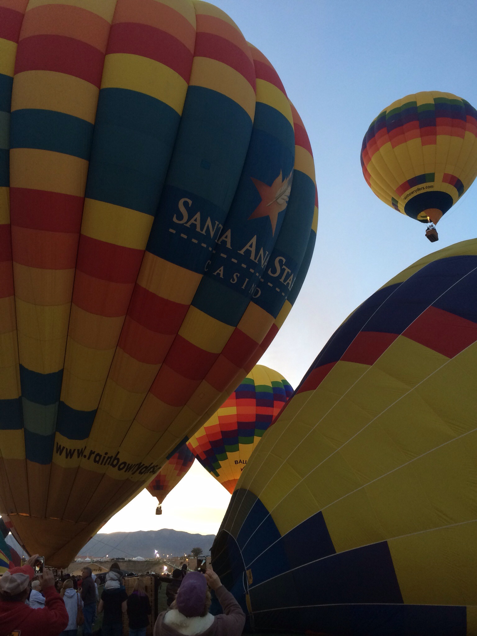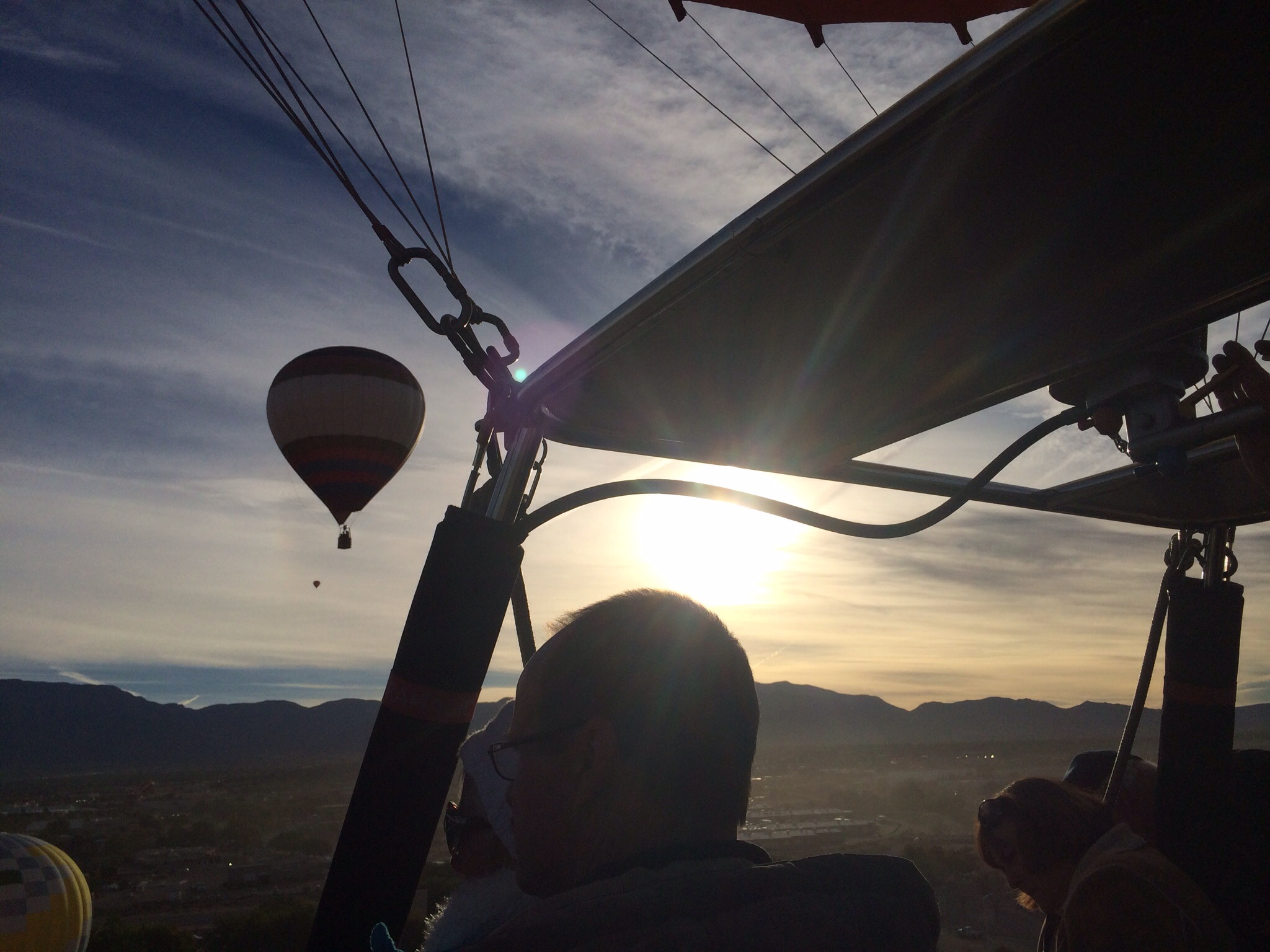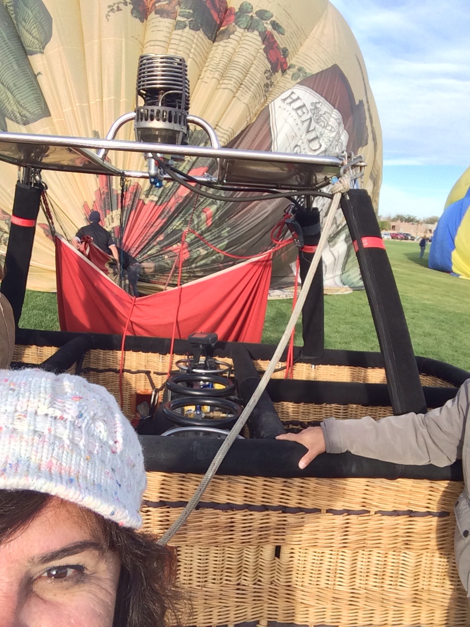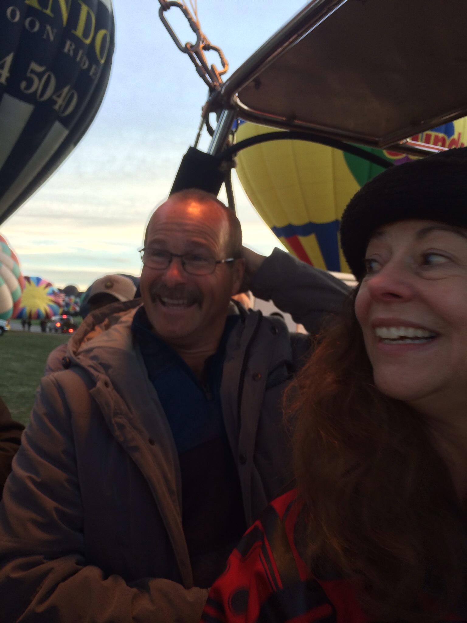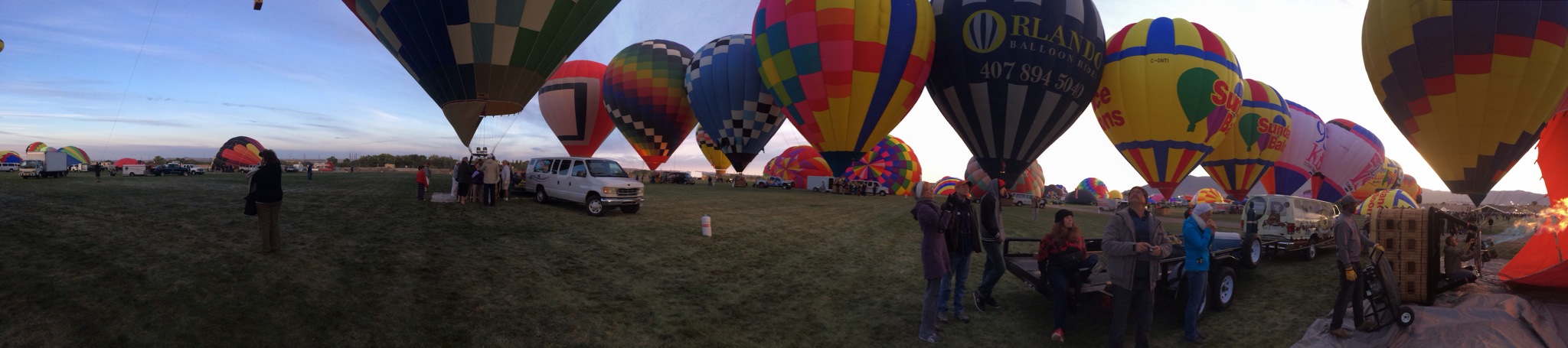 Up at 3:30 am and off to ABQ again with Celia (bless her for driving us around), Colin and Wendy. Way fewer people so we were in early and got signed in for our ride. Found out we were to be with Pilot Pierre Brunner in the Hendricks Gin balloon, oh the irony. I do love my G&T and it is the only screen printed balloon with matching chase vehicle. It is also one of the larger ones. First we watched the few dawn patrol and then got excited as the bright moon shone over the filling balloons. This was a very good sign!