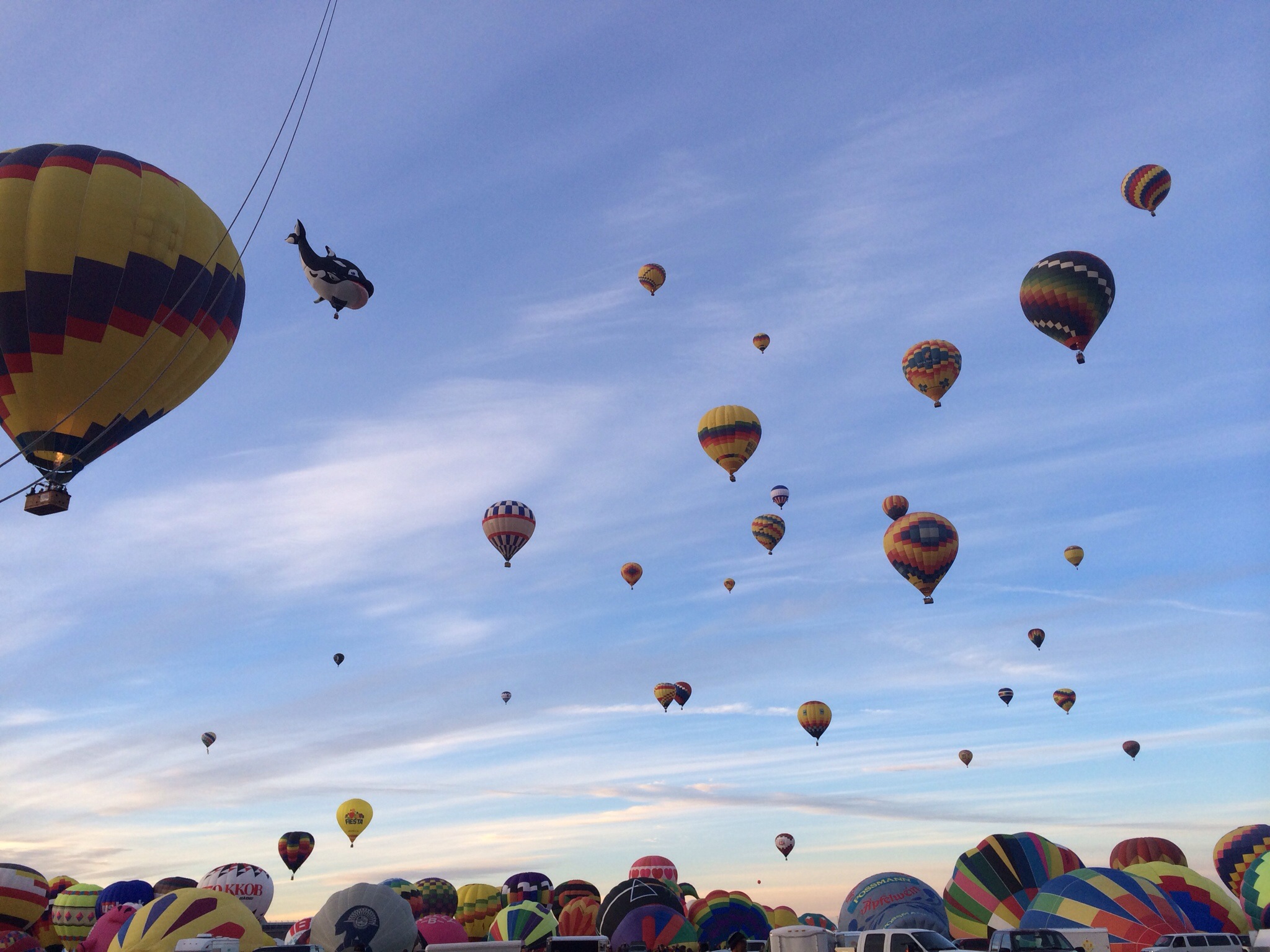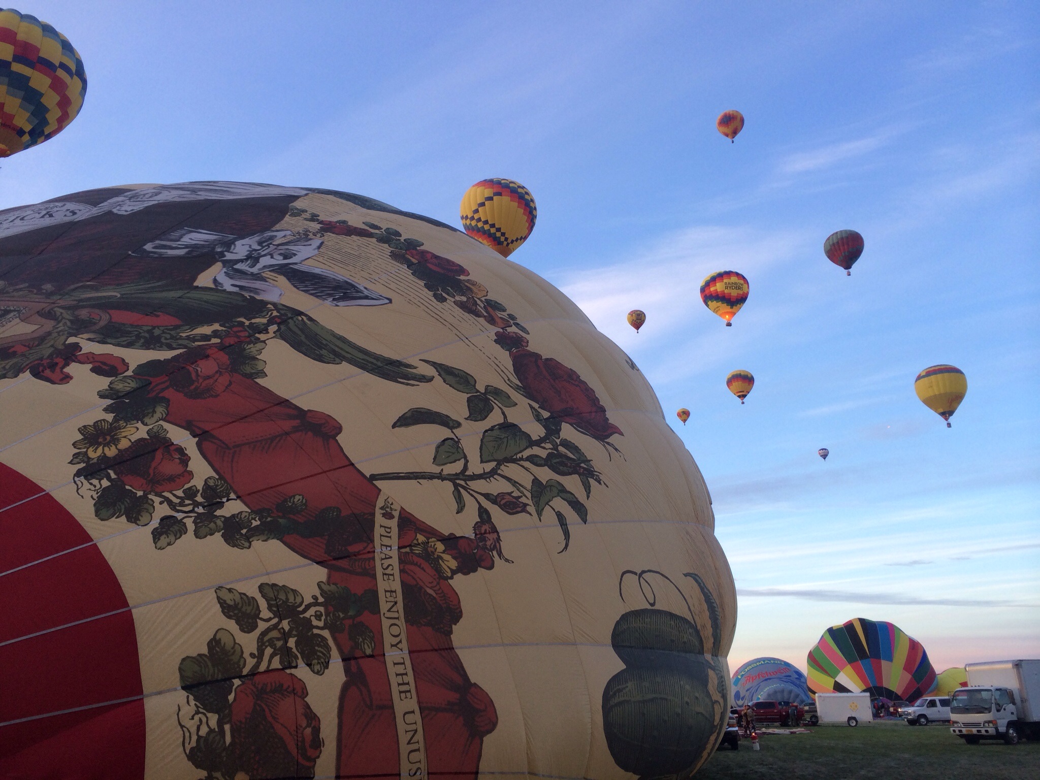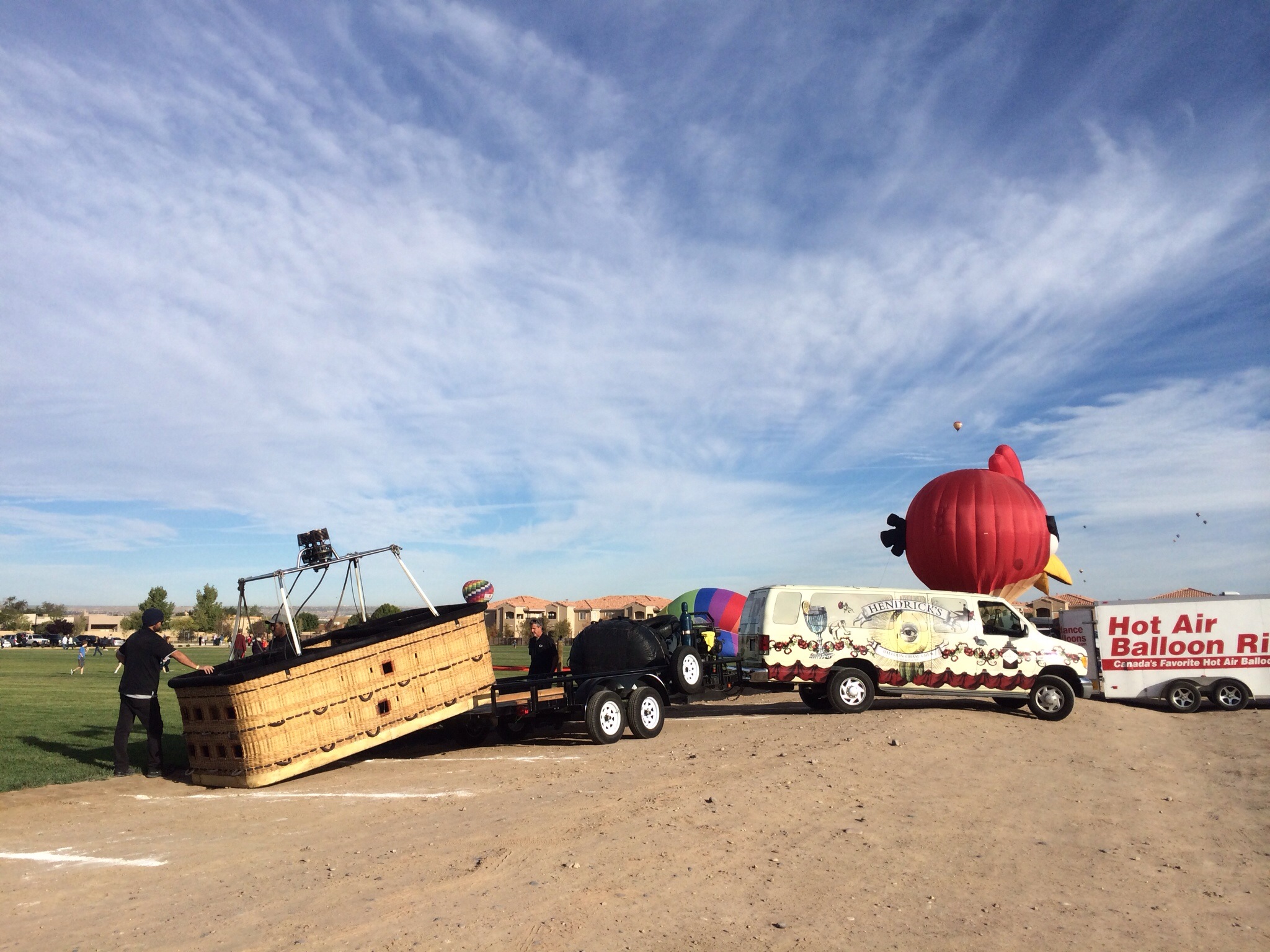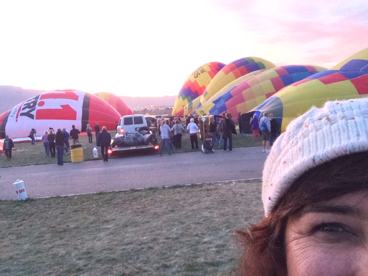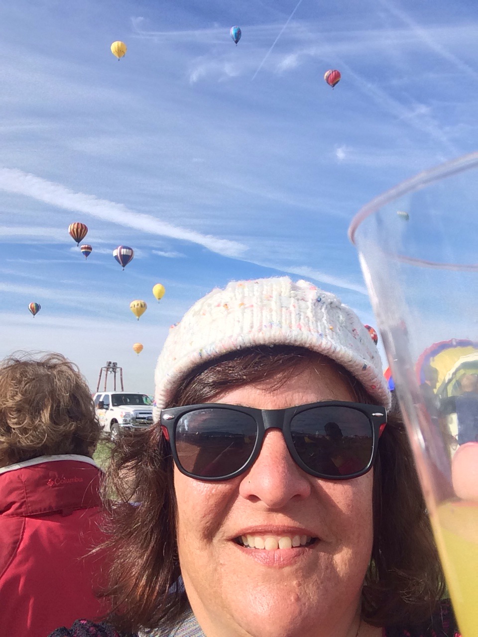 Up at 3:30 am and off to ABQ again with Celia (bless her for driving us around), Colin and Wendy. Way fewer people so we were in early and got signed in for our ride. Found out we were to be with Pilot Pierre Brunner in the Hendricks Gin balloon, oh the irony. I do love my G&T and it is the only screen printed balloon with matching chase vehicle. It is also one of the larger ones. First we watched the few dawn patrol and then got excited as the bright moon shone over the filling balloons. This was a very good sign!