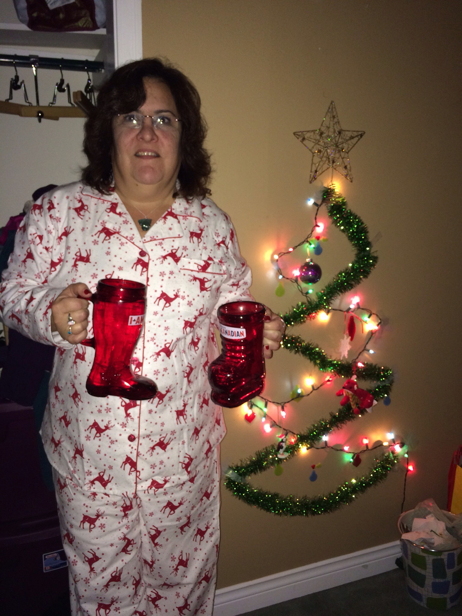 arrived at her home where she had reversed the tradition and gotten me pajamas for Christmas Eve. How sweet and thoughtful. She made popcorn while I made juice which we drank out of glass boots. I can’t wait to see everything in the daytime. It was a little bit chilly but no snow on the ground. I am still up at 2:15 am as it is only 9:45 at home… So much for getting my sleep patterns fixed, oh well. Merry Christmas Eve!