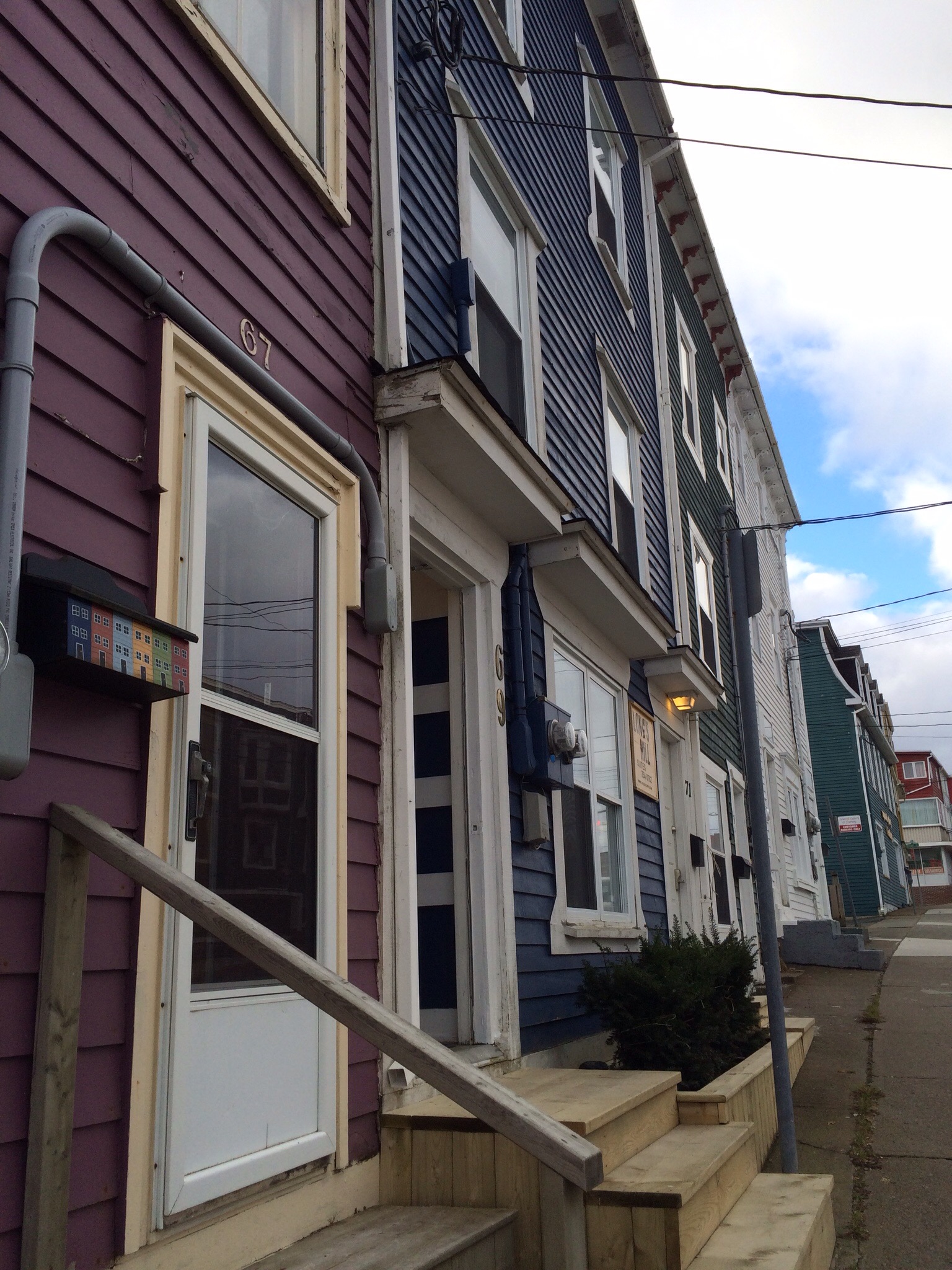 Ashlée was off to work early so I puttered doing laundry, etc and decided to text Nancy to see if she could cut and colour my hair. Of course she said come on over this afternoon so I got ready and walked the 20 minutes or so down to Oliver’s where Ashlée works to get her car. What a treat that walk was. St. John’s is a maze of roads with row houses right up to the sidewalk. The newer ones have been designed to blend well with the old.
