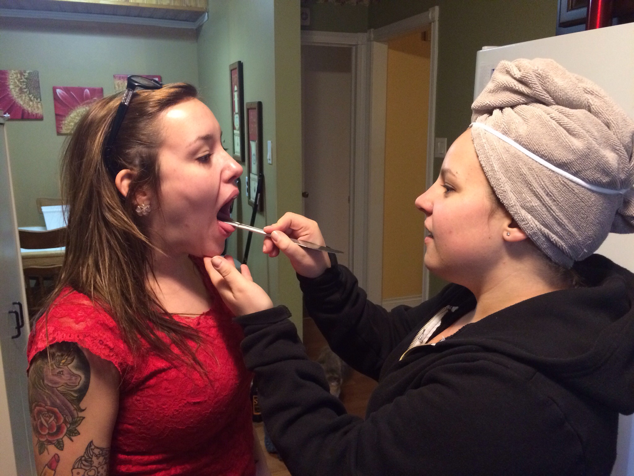 Ash diagnosed her roommate with a knife for a tongue depressor (strep throat)
