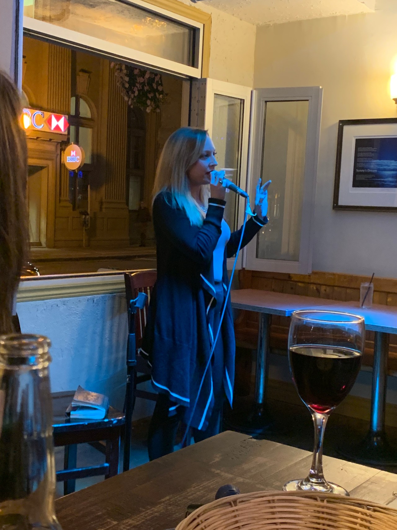 So much good talk and belly laughs. I couldn’t believe my good fortune to find Oban scotch at double for single price until 8. At 8 we were asked to move seats as the comedians were about to start. A loud mouth guy at the bar turned and started heckling us and I realized in a flash that I knew him from Victoria, back before 2010 when I lived on Salt Spring! I gave him a bit of guff and then finally said he ought to recognize me and there was a sudden ding, as the penny dropped. Seems Dave was here on his honeymoon and was going to be onstage last tonight.
