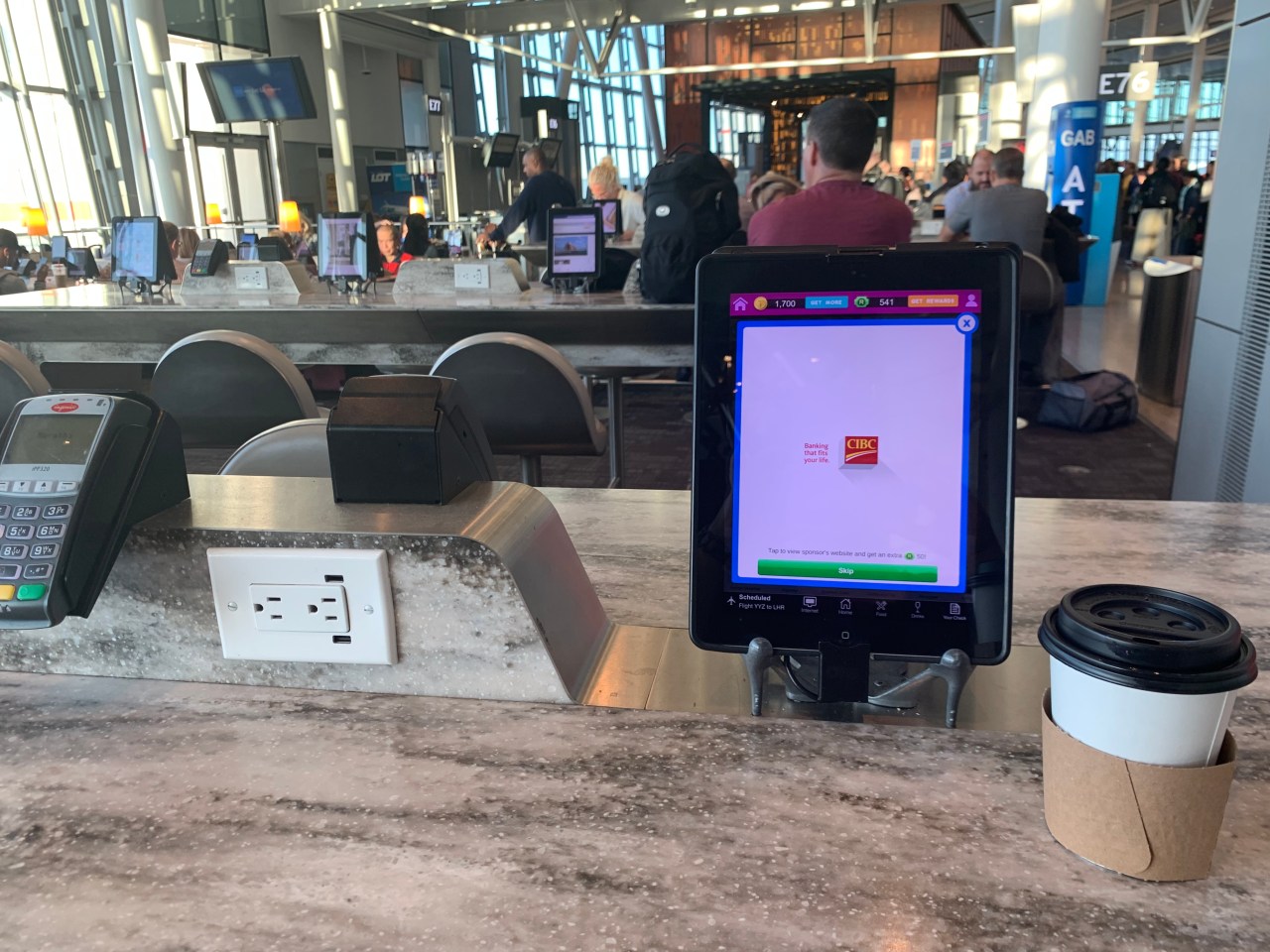 When we arrived I had no idea where to go and just started out walking until I made my way to the right gate. Toronto has everything there. It’s like a mall of specialty shops. Grabbed a medium coffee and small bottle of water for $7! And settled at the iPad lounge. What a brilliant idea although I’d be happier knowing they were cleaned regularly.