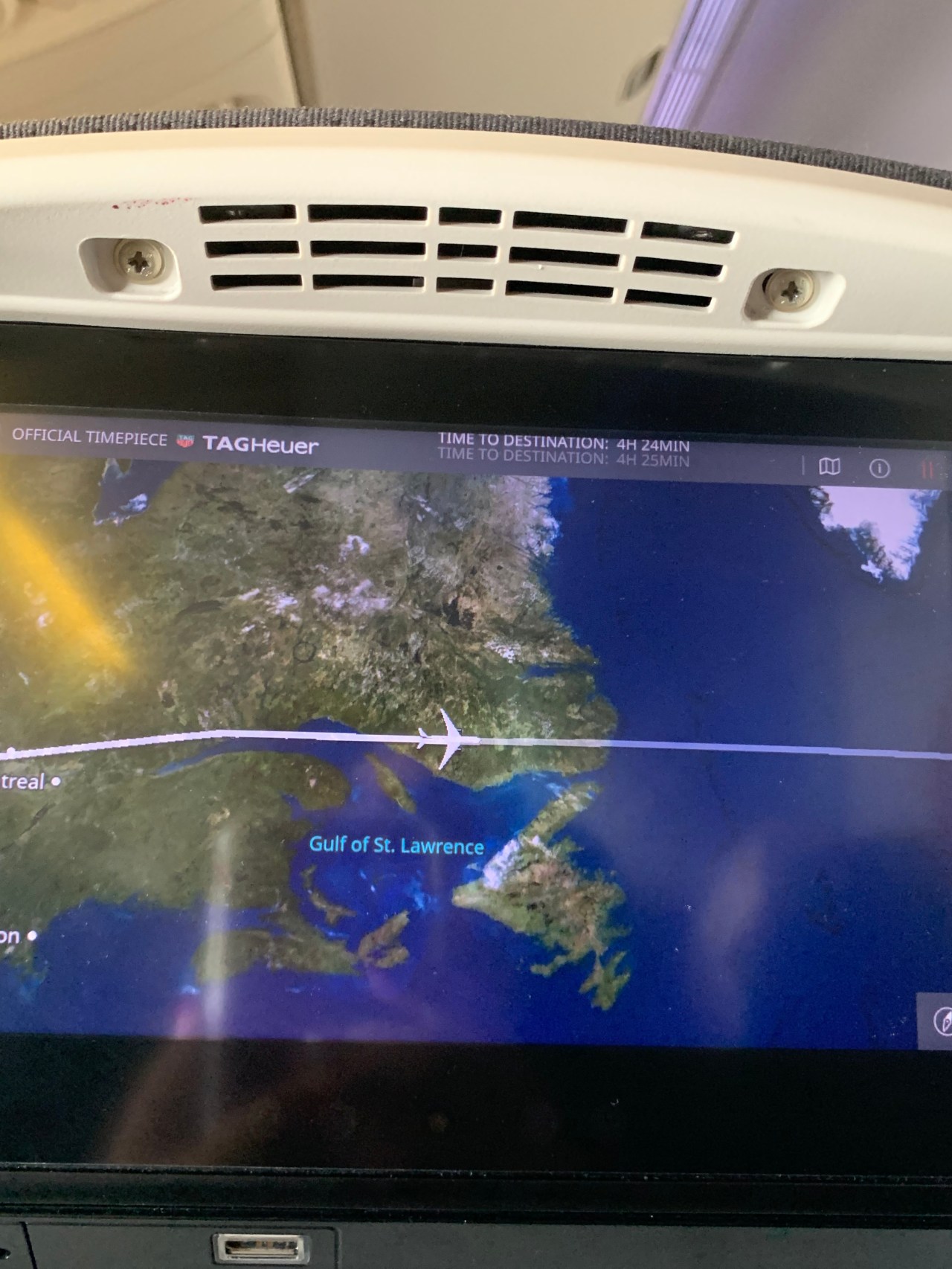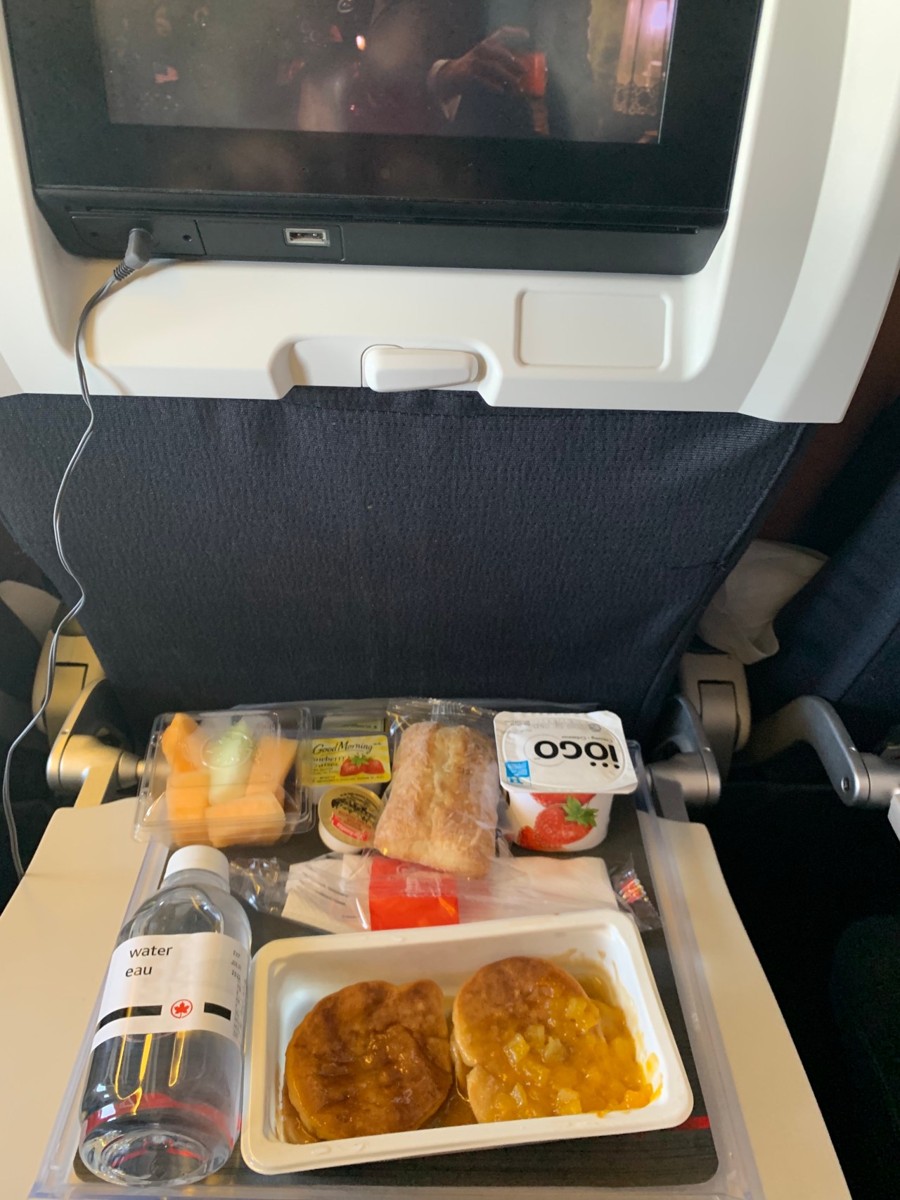 I loved checking where we were at at any given moment. Breakfast was a choice of pancakes or omelette (with peppers so allergy ruled that out). Was quite tasty but we were quite the trio all trying to eat as the guys on each side of me had big shoulders too. We had to coordinate movement and I can tell you that man spreading is real.