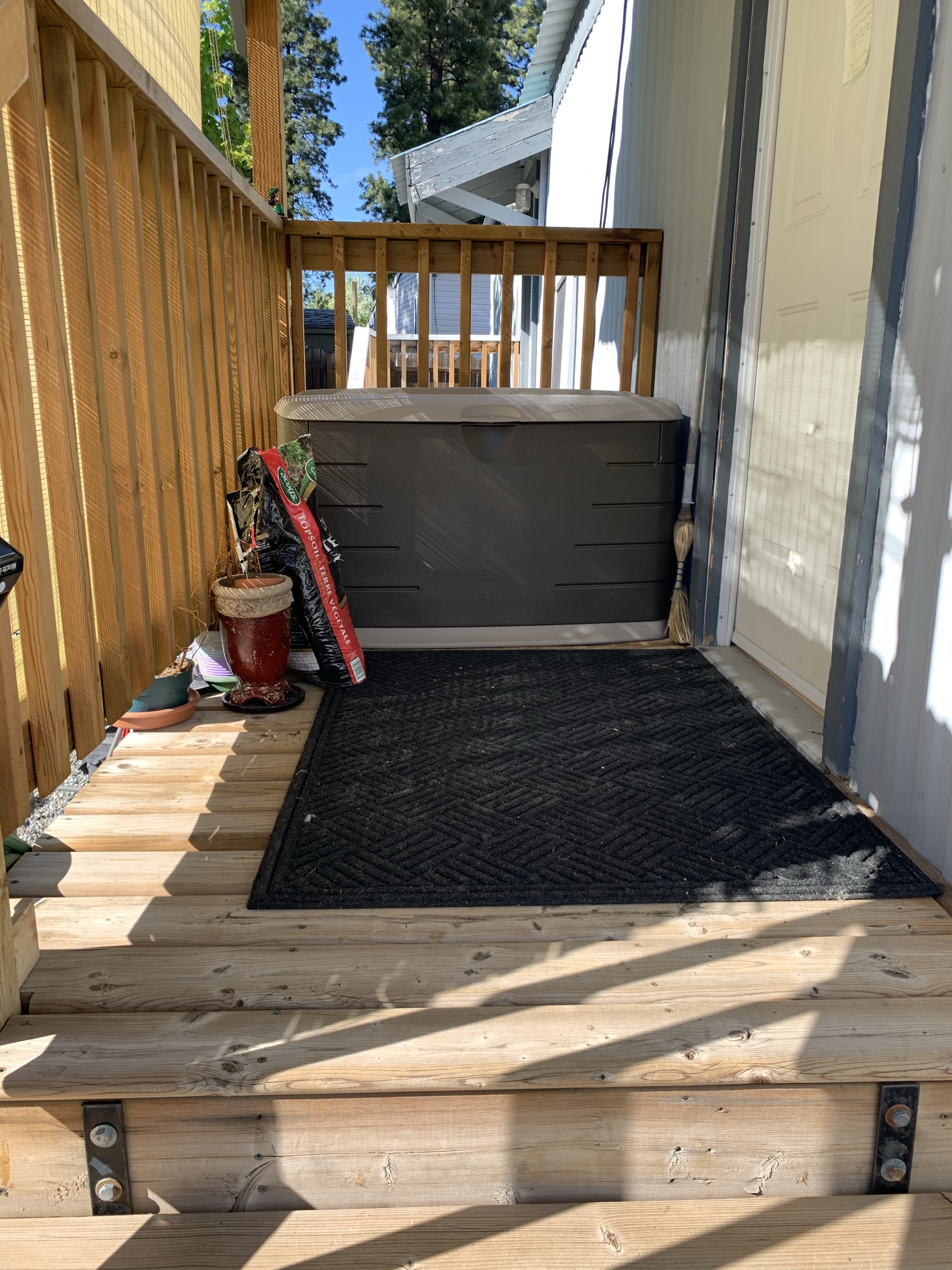 One of the stops I made when I was out the other day was at Home Hardware to pick up this deck box I got on sale and it is the perfect seat and storage for my motorcycle helmet and recycling. Once I got it allllllllllllllllll together I was thrilled that I had measured correctly and it fits there perfectly, tidying up my porch. Alllllllllllllllllllllllllllllllllllso, no more recycle blowing in the wind.