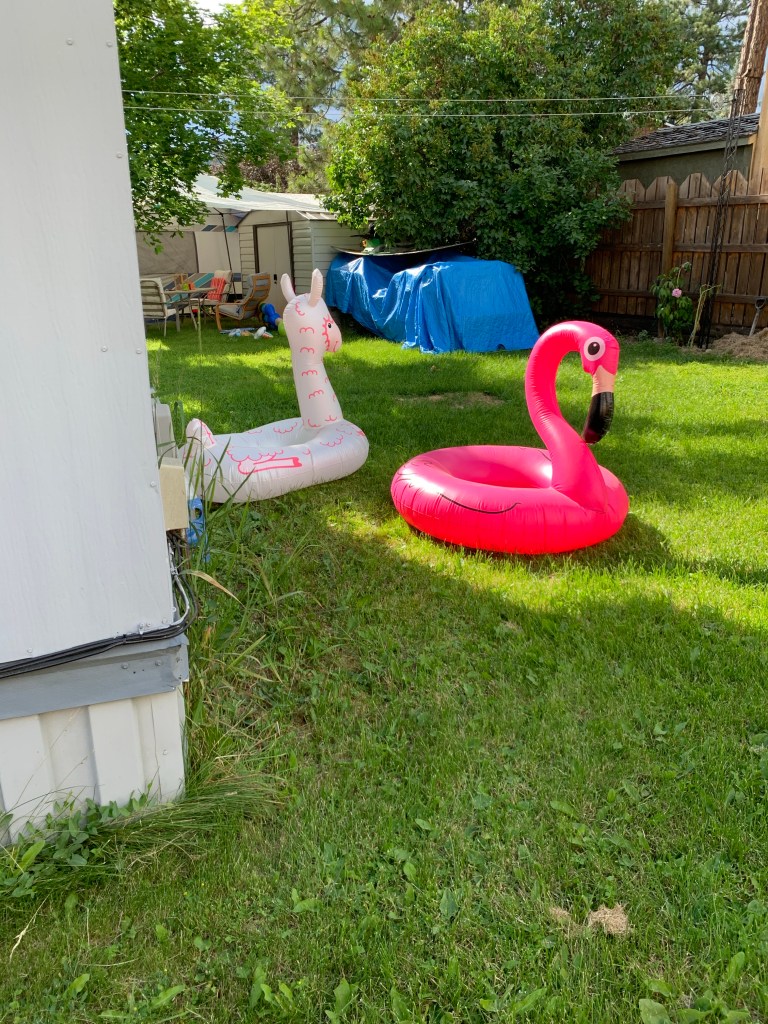 We all had BBQ together and played many rounds of crib. At one point the wind picked up and the rain started and I remembered I had intended to secure my pool toys so I popped back home. I parked and walked down the back side of the trailer. As I rounded the corner it was if they were busted trying to escape and froze there. They had made it a good 20 feet together.