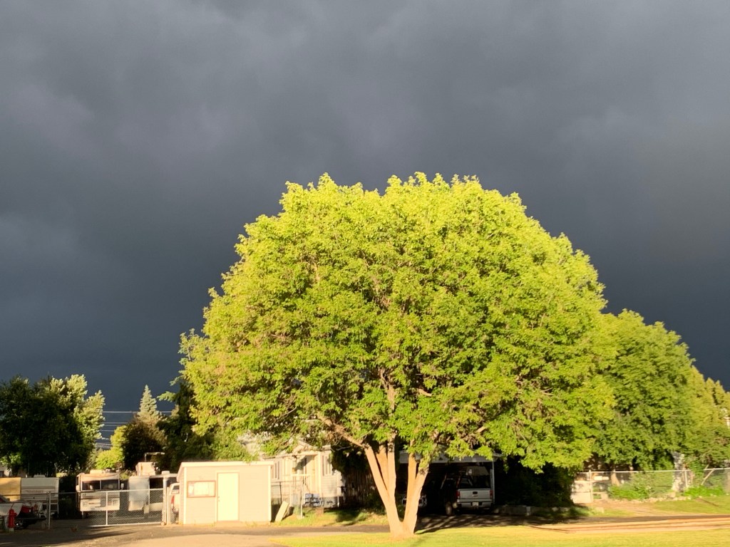 The sky was ominous this evening but the sun was shining from the West and lit up the tree I love in our park. A happy sight to end the day on.