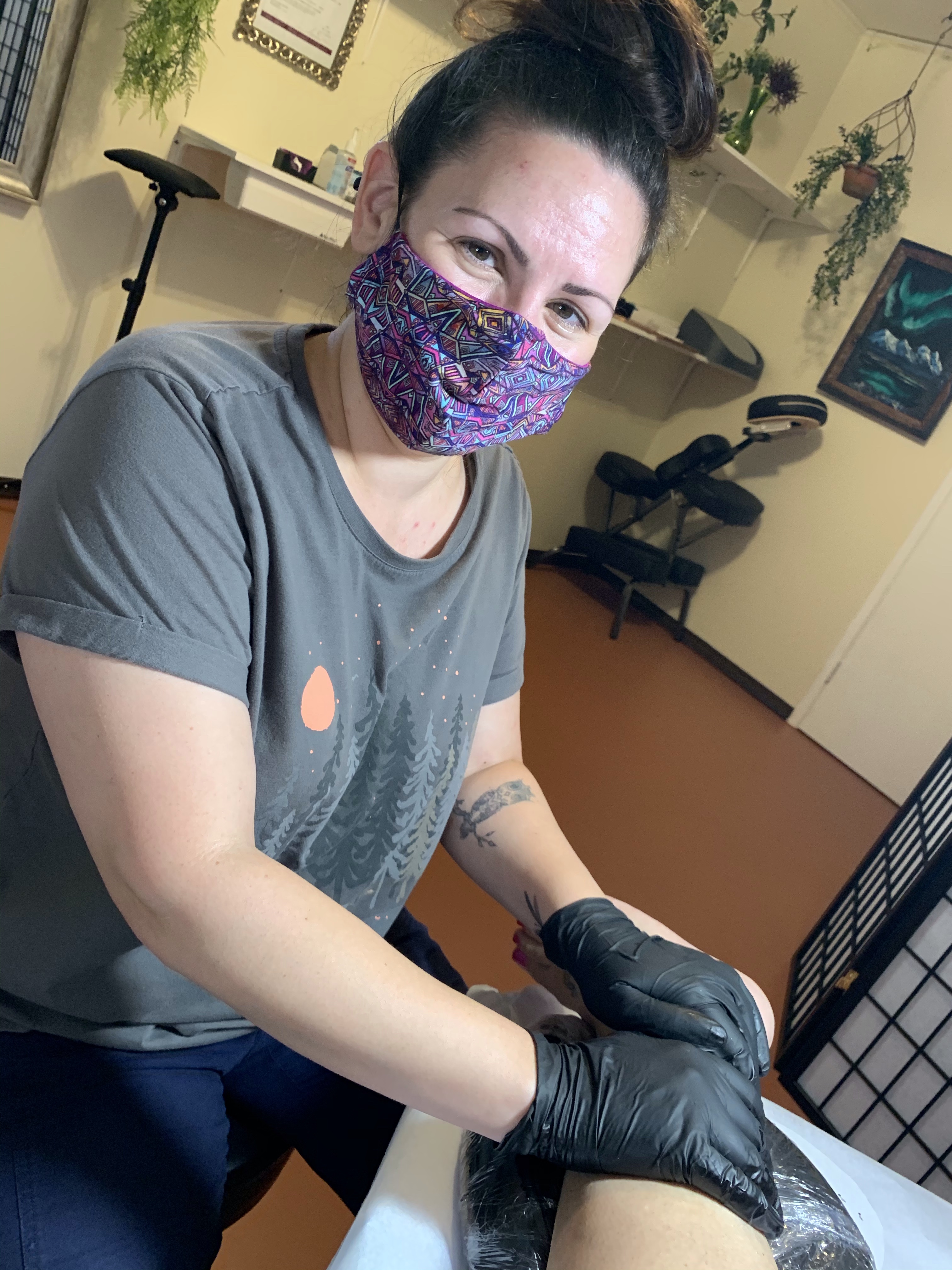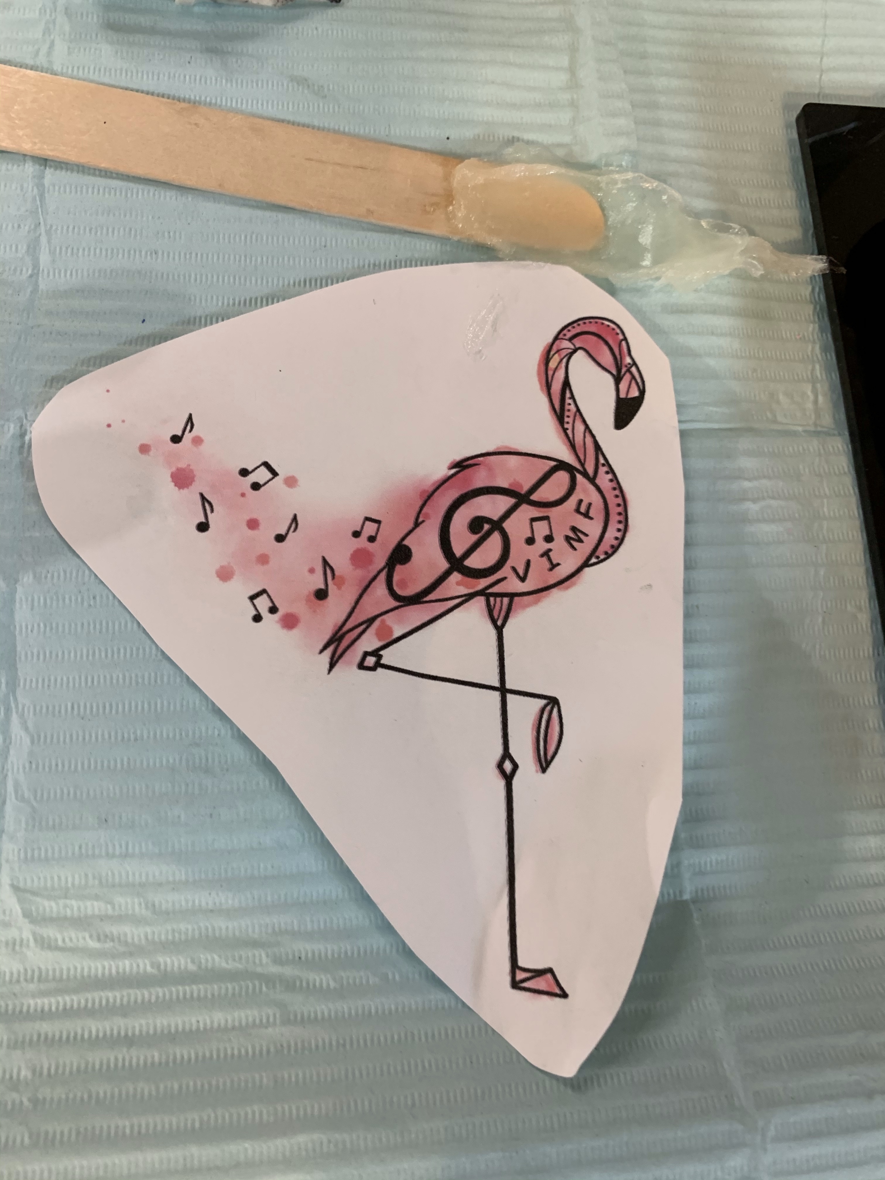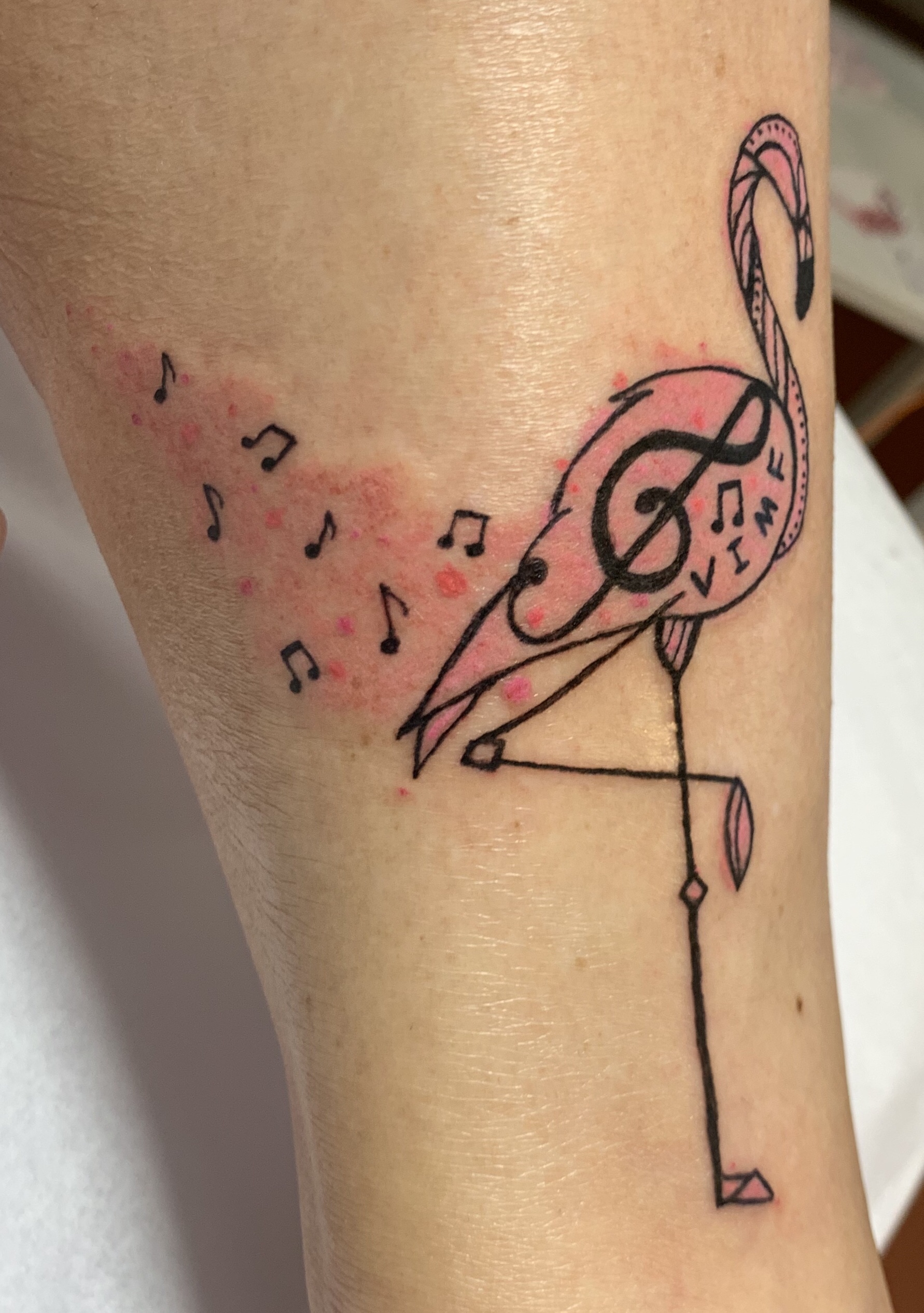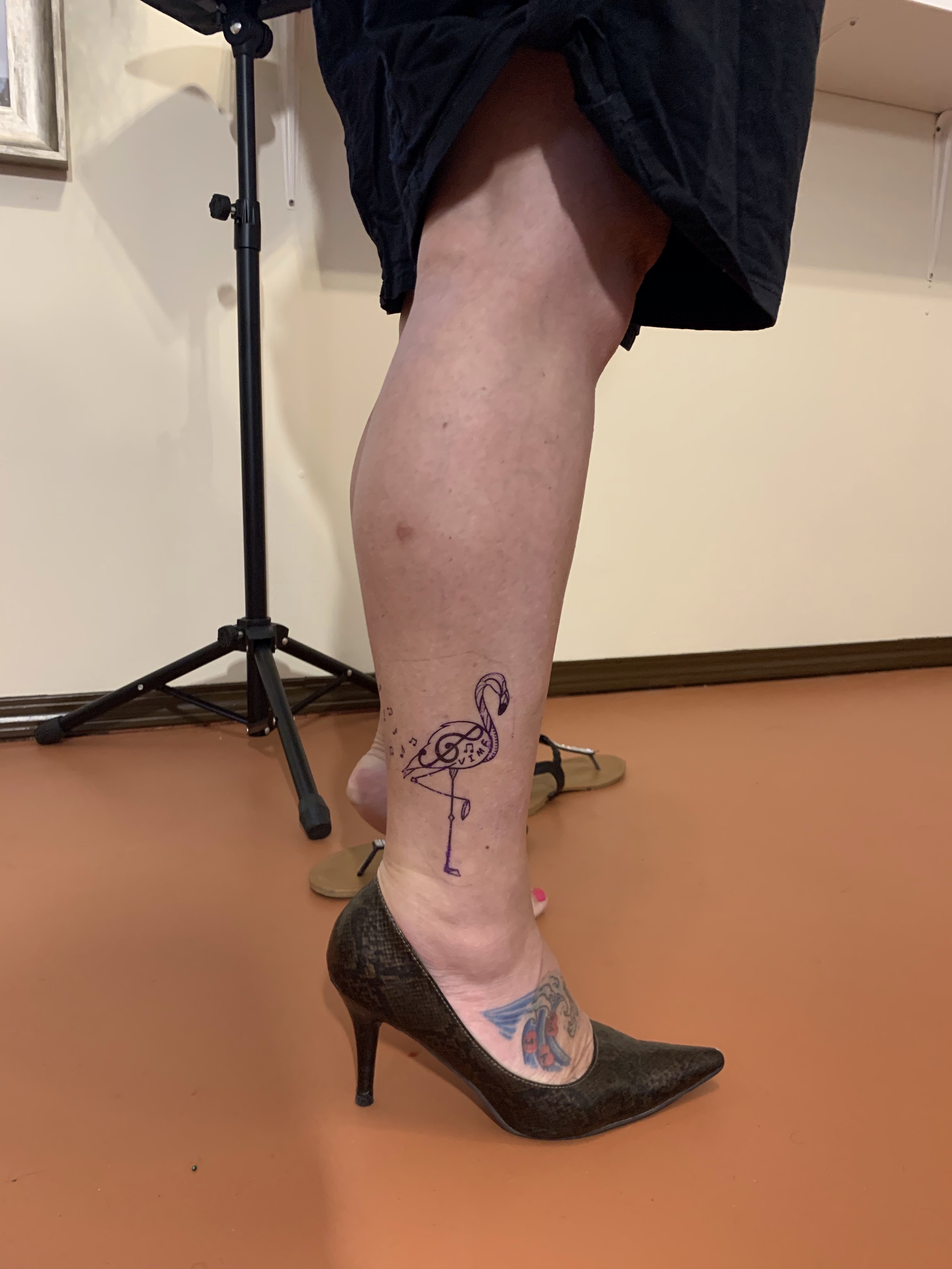 Which brings me to my tattoo. I was very excited to be able to share what I hoped for and have quick design revisions to end up with my Vancouver Island MusicFest tribute tattoo on my right leg just above the ankle bone. When I am at music fest I have a great deal of pink. I try to have everything is hot pink as I can so people can find me easily and my cart is decorated with that so no one will drive off in it. so, of course, that will include pink flamingos over the years, thus, that’s my choice for my tribute tattoo. it happens that last year was my 11th year at music fest, this is the missing year, but it is also my 11th tattoo. I chose to get it done by Kimberly Frixel who played my daughter in the tin woman as that’s when we became friends and since then she has opened her own business, The Tattooed Unicorn. we sat and chatted, she made some drawings, I adjust them and then suddenly I knew it was exactly what I wanted and today I went and spent 2 1/2 hours under her gun. She is new and takes longer but is also a little obsessive so I don’t have to worry as I think she is her own biggest critic and pays extraordinary attention to every little detail. I was very happy with the result.