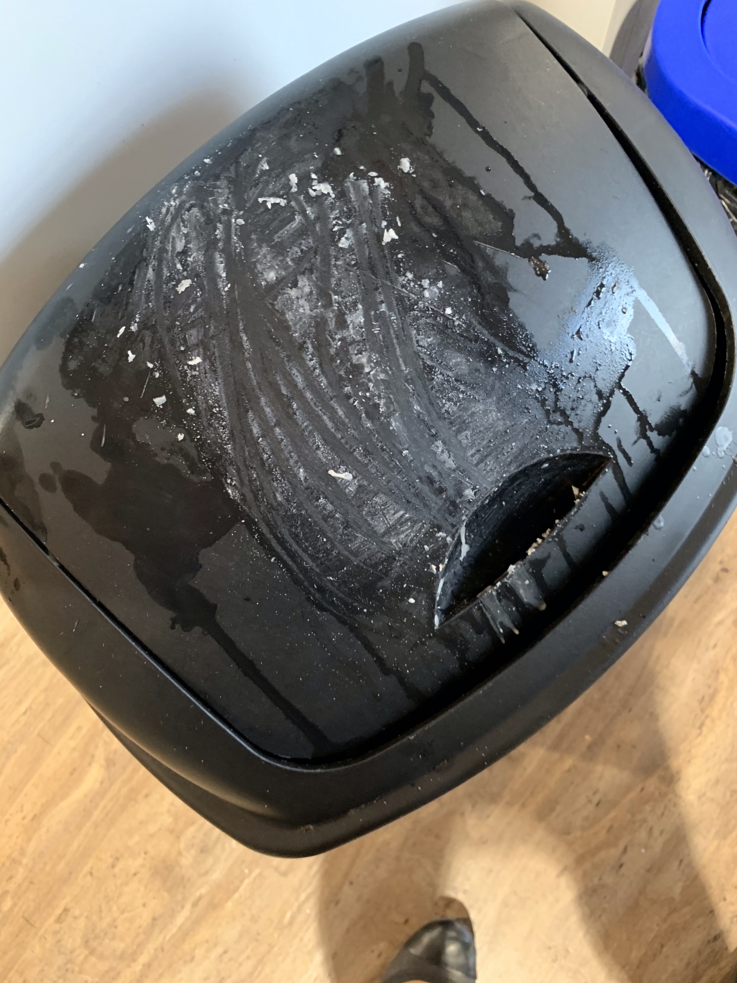 I worked a crazy long, eat between keystrokes kind of day and was stressed but grateful when it was time to race home, feed George And get to the theatre for final dress rehearsal. as I went to turn off my scentsy light I decided to empty the wax so there was room For a fresh scent. I intended to pour it into a coffee cup in the garbage but missed completely and had a big mess to clean up instead. Do you think they will notice!?