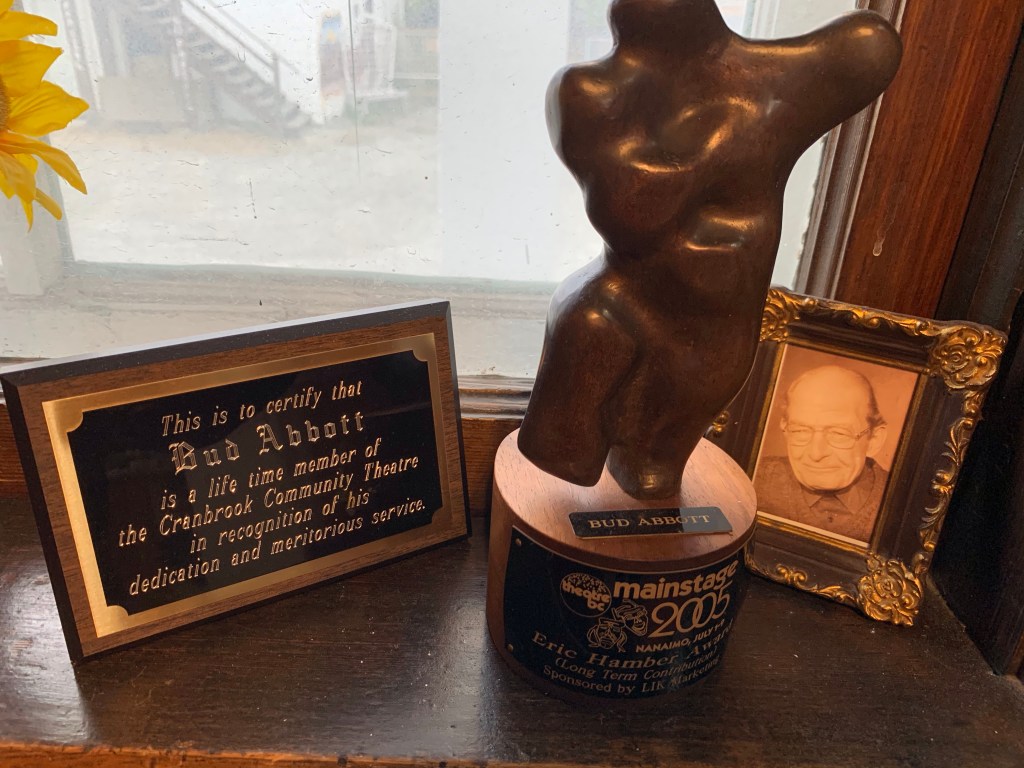 I committed myself to a deadline and this is one of the rare times that I am scared I am not going to accomplish it. Now, to be fair to me, I am re-entering information that was incorrectly done in the first place and all was not caught by the auditor which is frustrating for a bookkeeper. They should know more than me. It the bottom line, my Dad taught me my word and a handshake is a binding contract. Hmmm, I didn’t shake on it. I was busy at it when my alarm rang to head to the theatre. I needed to meet three guys to get all the Tech set for media night. So I shut it all down , didn’t even go home to eat or feed George and was there just before 6. I was honestly frustrated when 2 of the 3 didn’t show up and the 3rd was late. At least he let me know. As I waited I noticed this tribute windowsill to dear Bud. I am grateful he hasn’t been privy to some of the stuff going down.