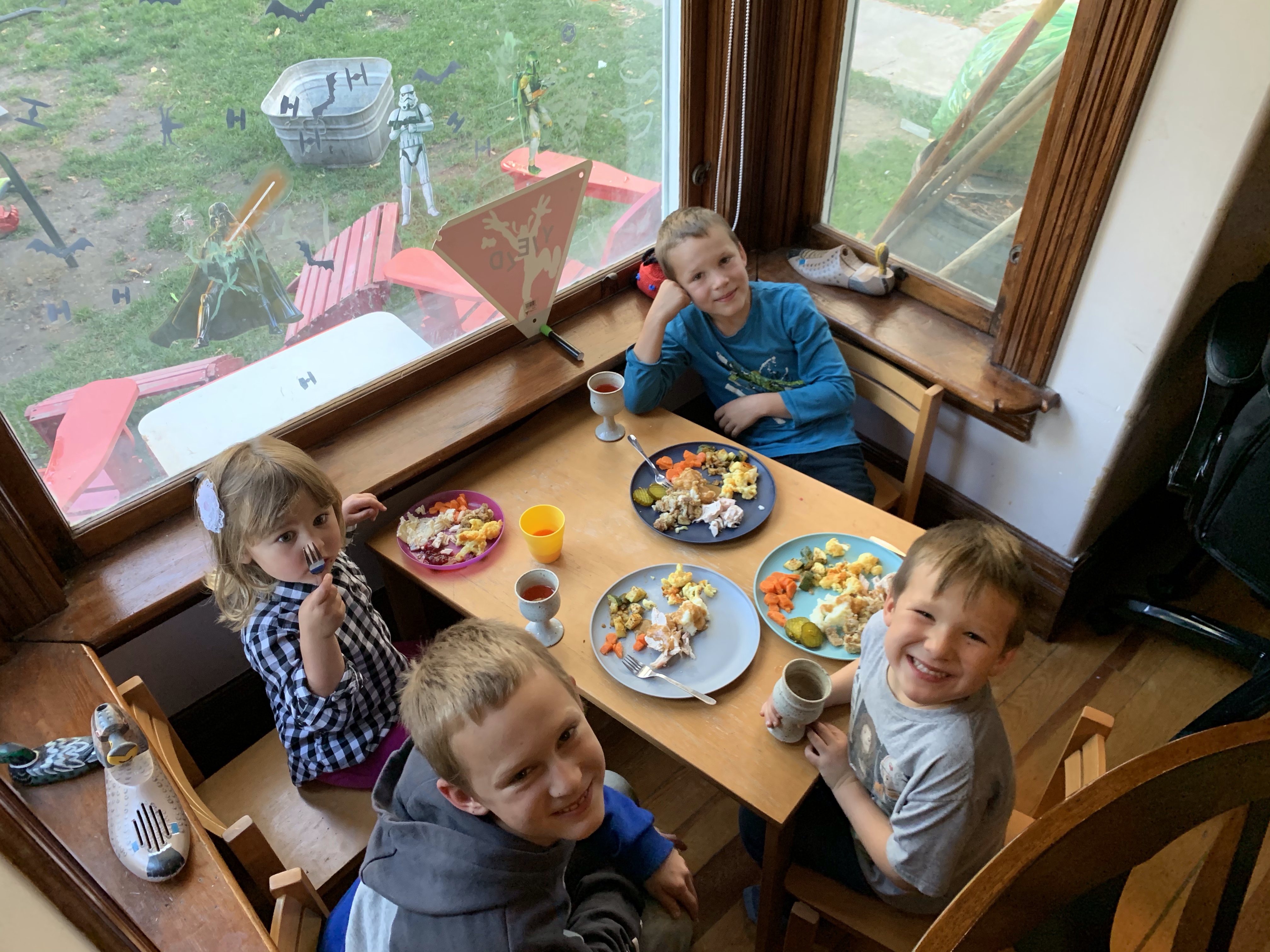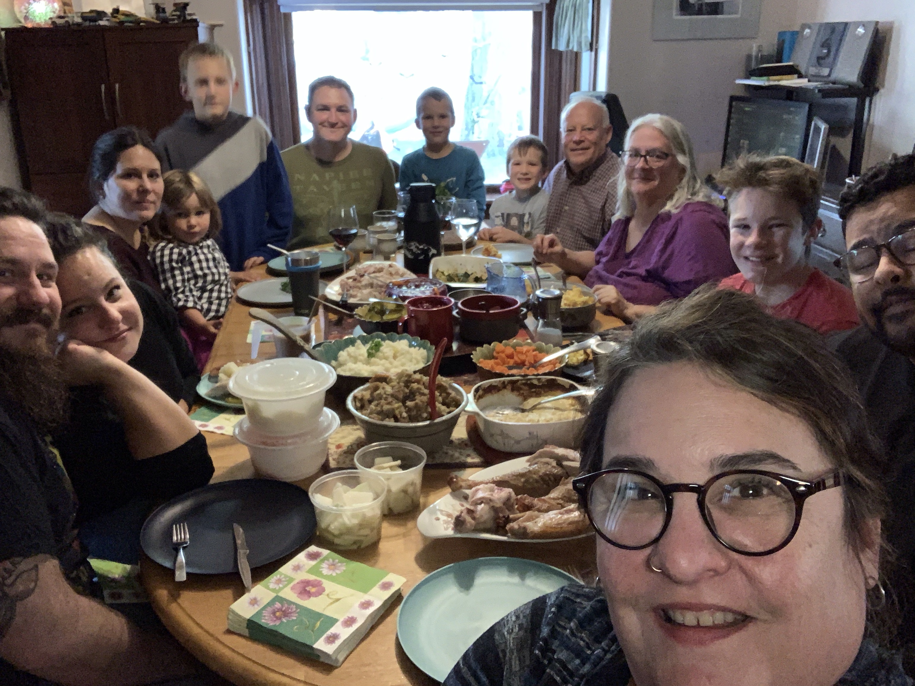 Afterwards we made a quick stop at the grocery store (which had an odd dessert) and then dropped me off to complete my mail in vote, and make more mini pumpkin pies which were ready just in time for Jake and Emmy to pick me up for.. wait for it.. turkey dinner at Rae and Rogers! There was some incredible food happening there and we had a great evening. There was much to be thankful for including spending time with all my kids, their partners and kids.
