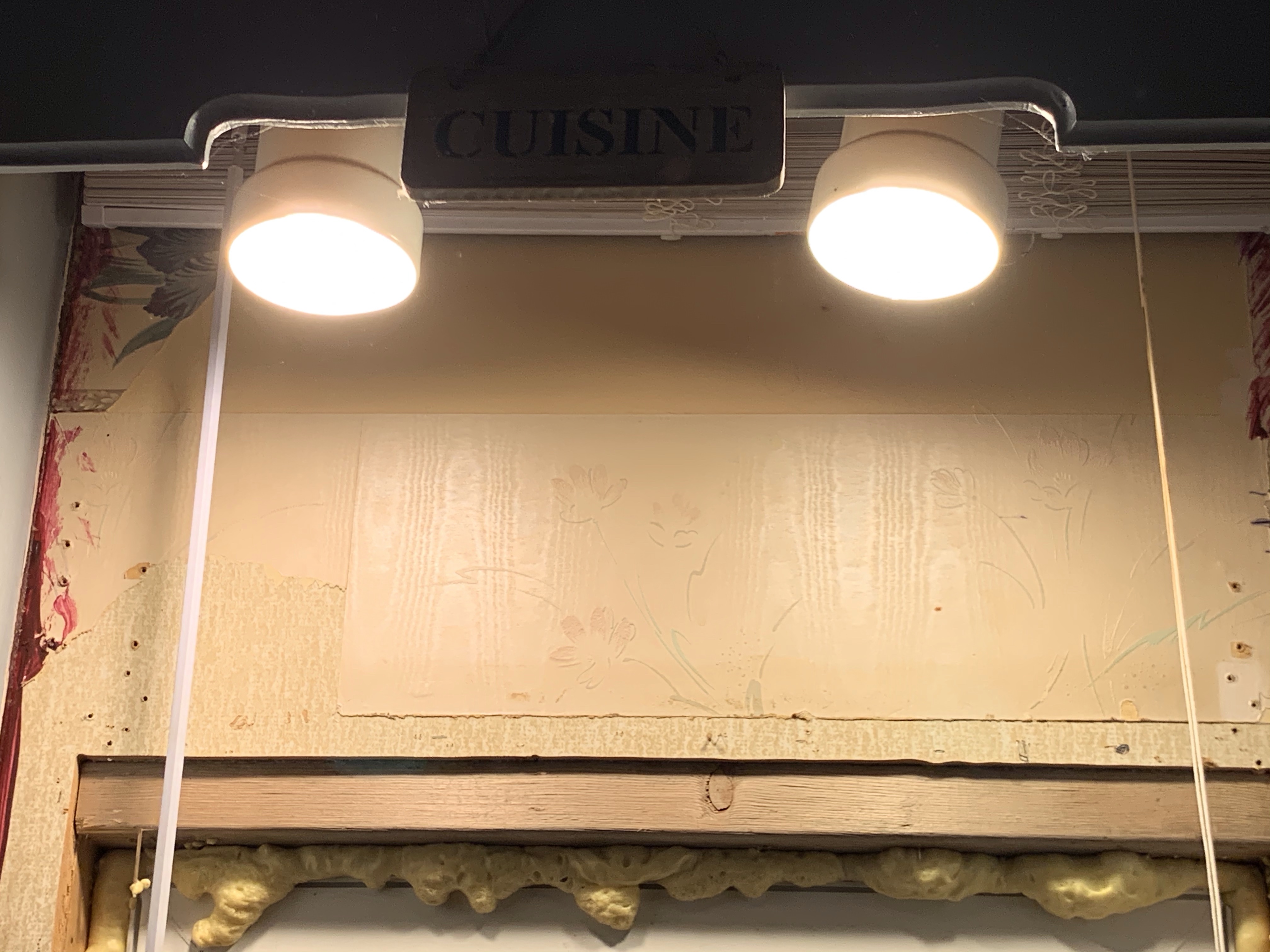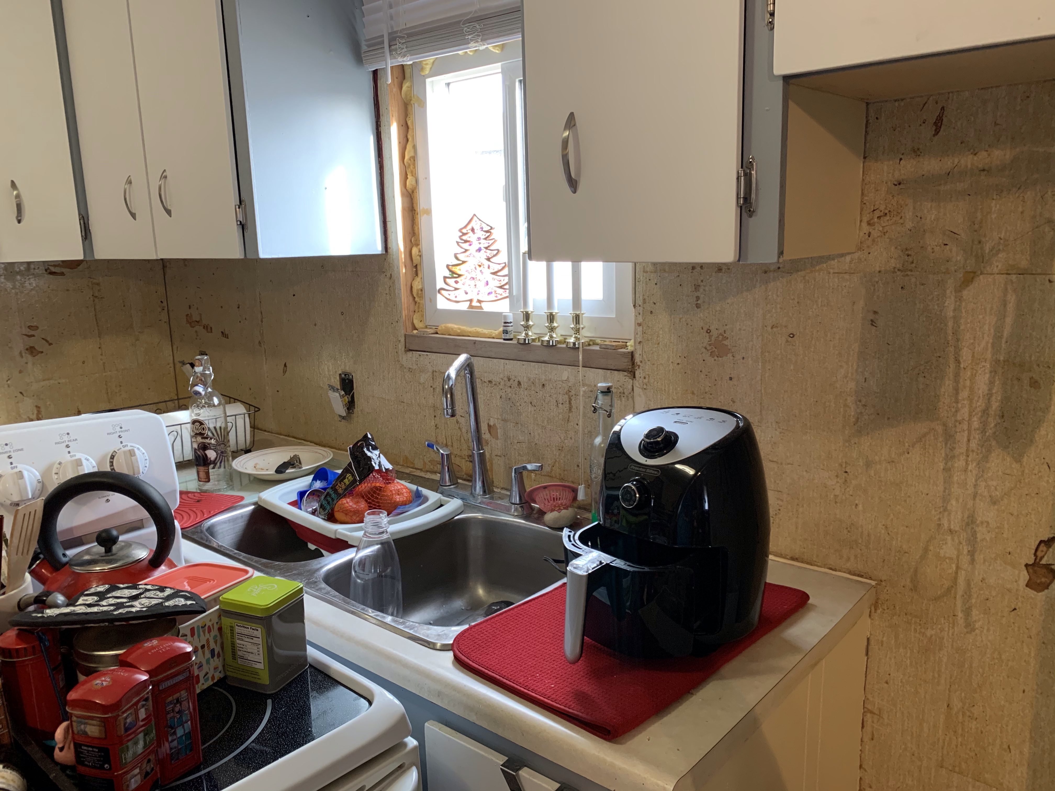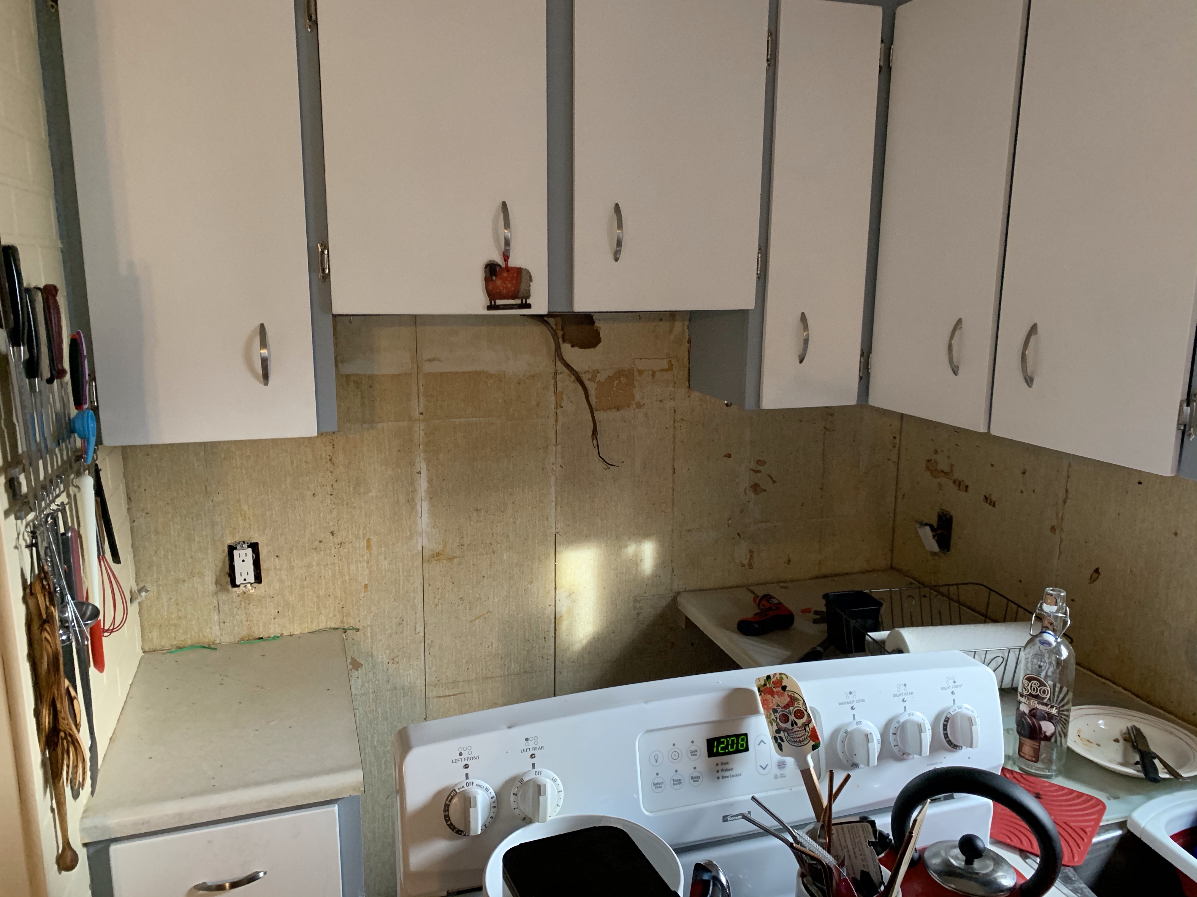 More stuff off the list today! Ripped off all the faux brick paneling in the kitchen, replaced the white range hood with the stainless one I bought for $10 and washed down the walls ready for the new countertops that are supposed to show up tomorrow. There were several layers of finish through the years. I was glad I recently charged my toque as it made it easy to install the range hood when I had my hands free. My vertigo really acted up when i was trying to look up to do it though.