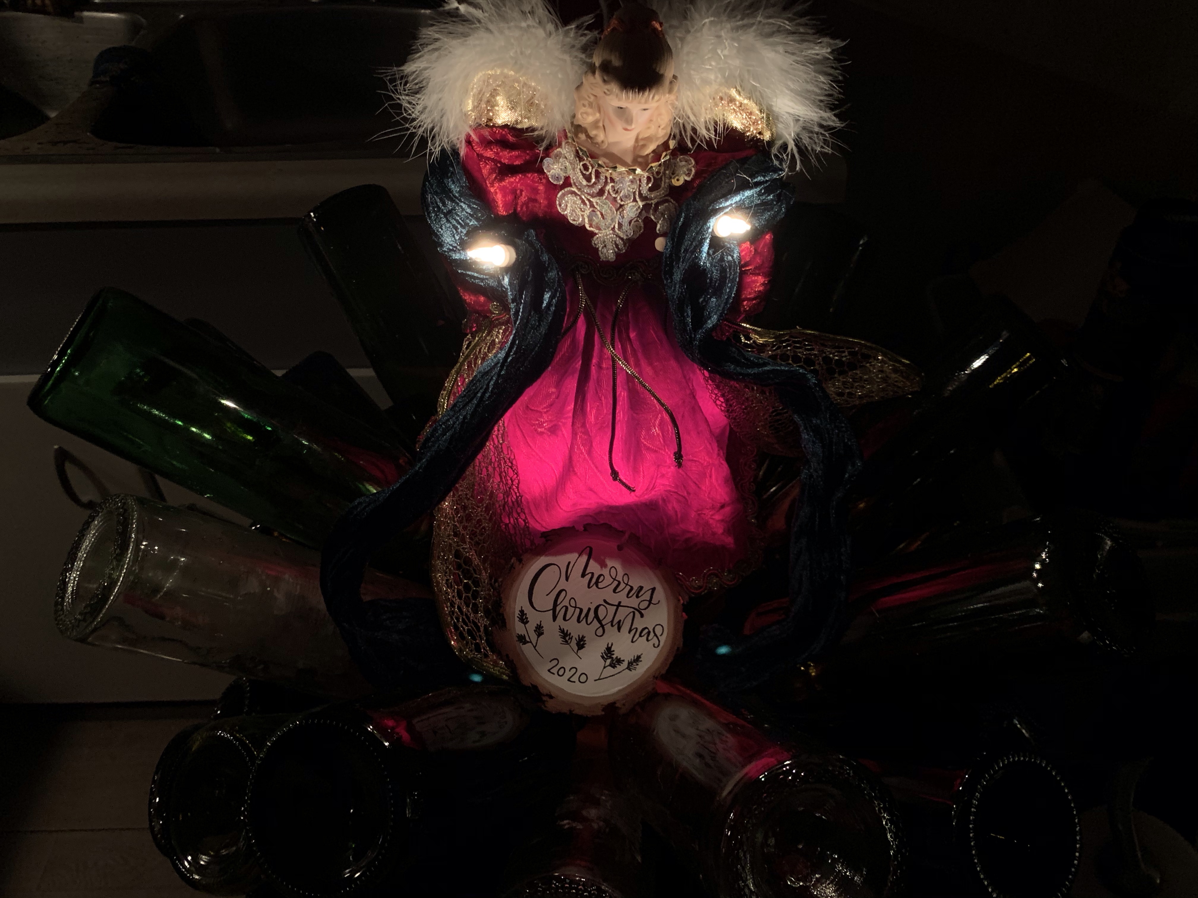 I came home and got busy cleaning wine bottles as Tuesday is bottling day. As I have a three different batches down I needed at least 90 bottles ready. I was short 26 so picked some up from Bill and Deanne’s (my first husband), Vanessa (daughter’s close friend and neighbour) and Roger (son-in-law) in order to have enough. Of course none of theirs were even rinsed so there was a lot of cleaning and scrubbing of labels. Once I was done, several hours later, I realized I had created my own Christmas tree so I grabbed my Angel and the decoration I bought yesterday for a quick picture. I love it!