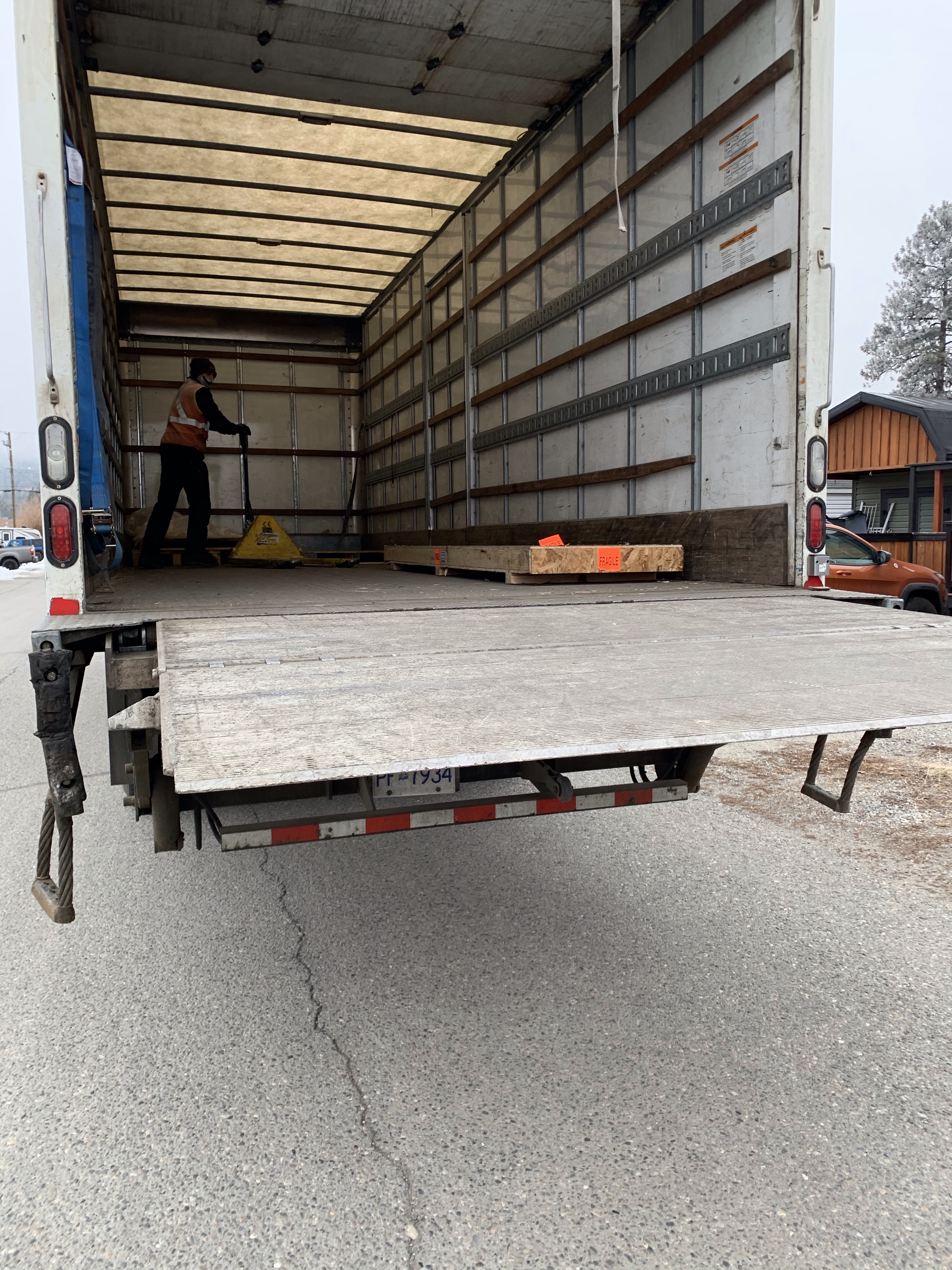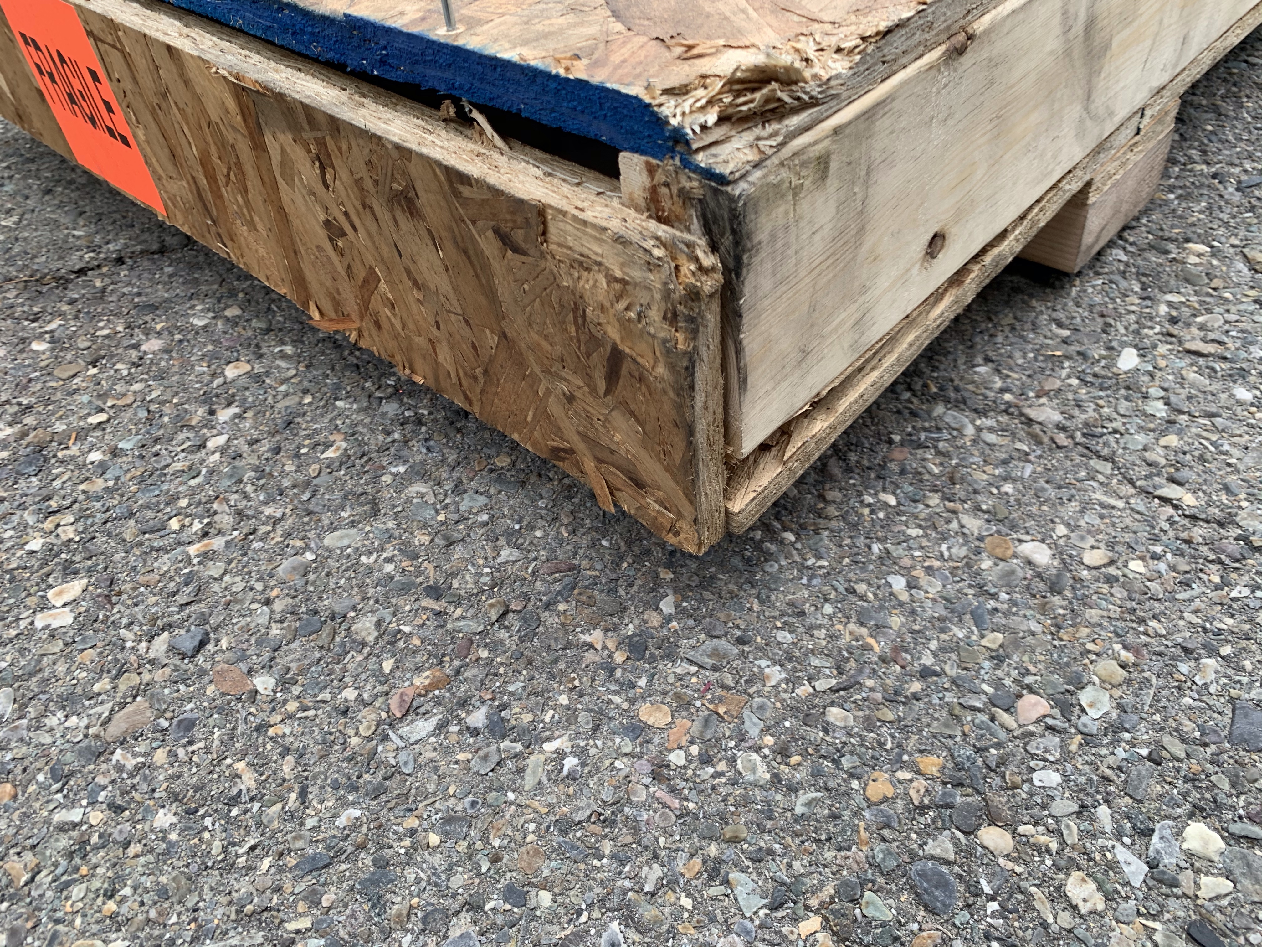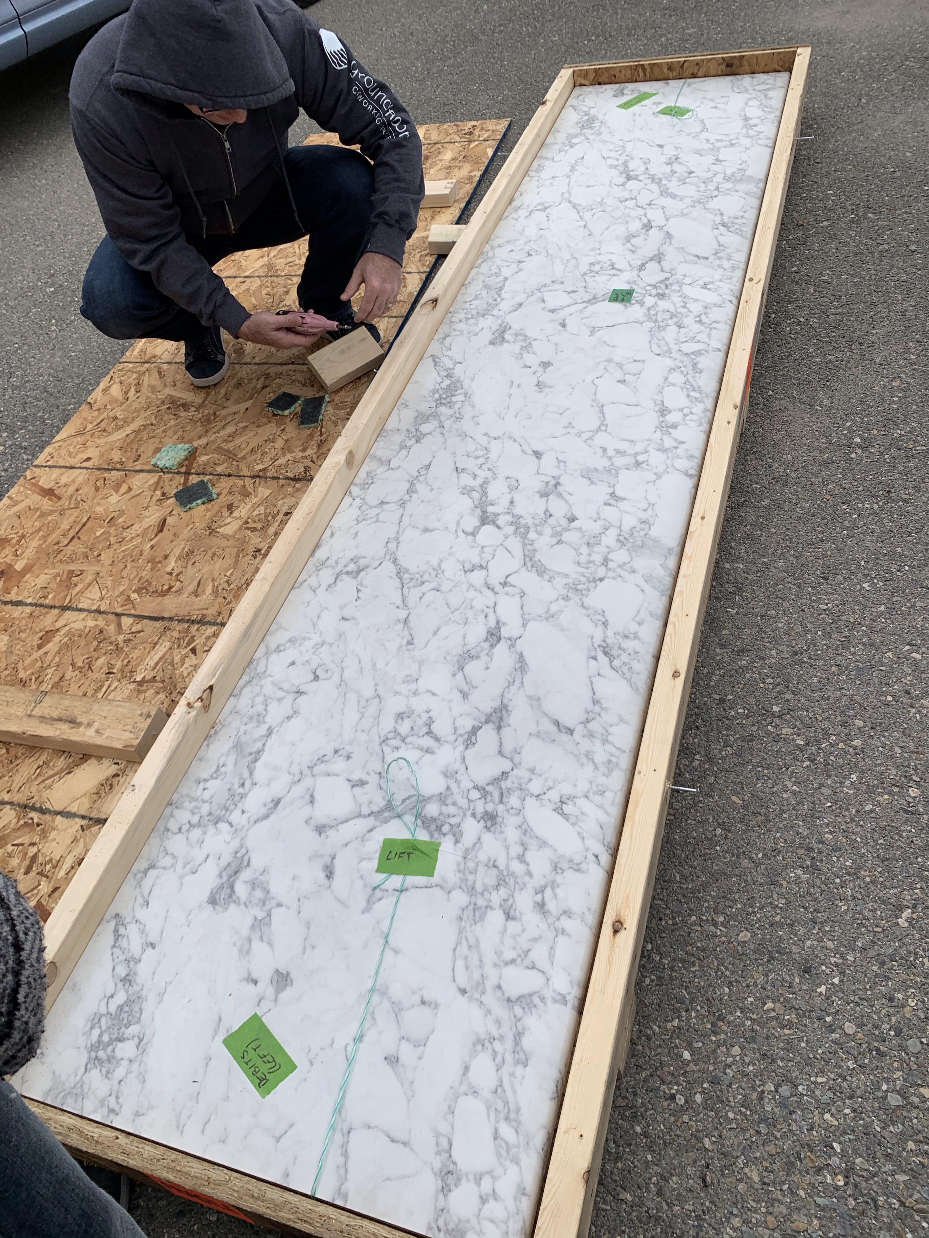 Finally just before 2 I got the call he was on the way. Sean and Aiden showed up to help unload and bring the countertop inside. I measured the crate as there was some argument over actual. There was a bit of damage that made me nervous but none to the top.