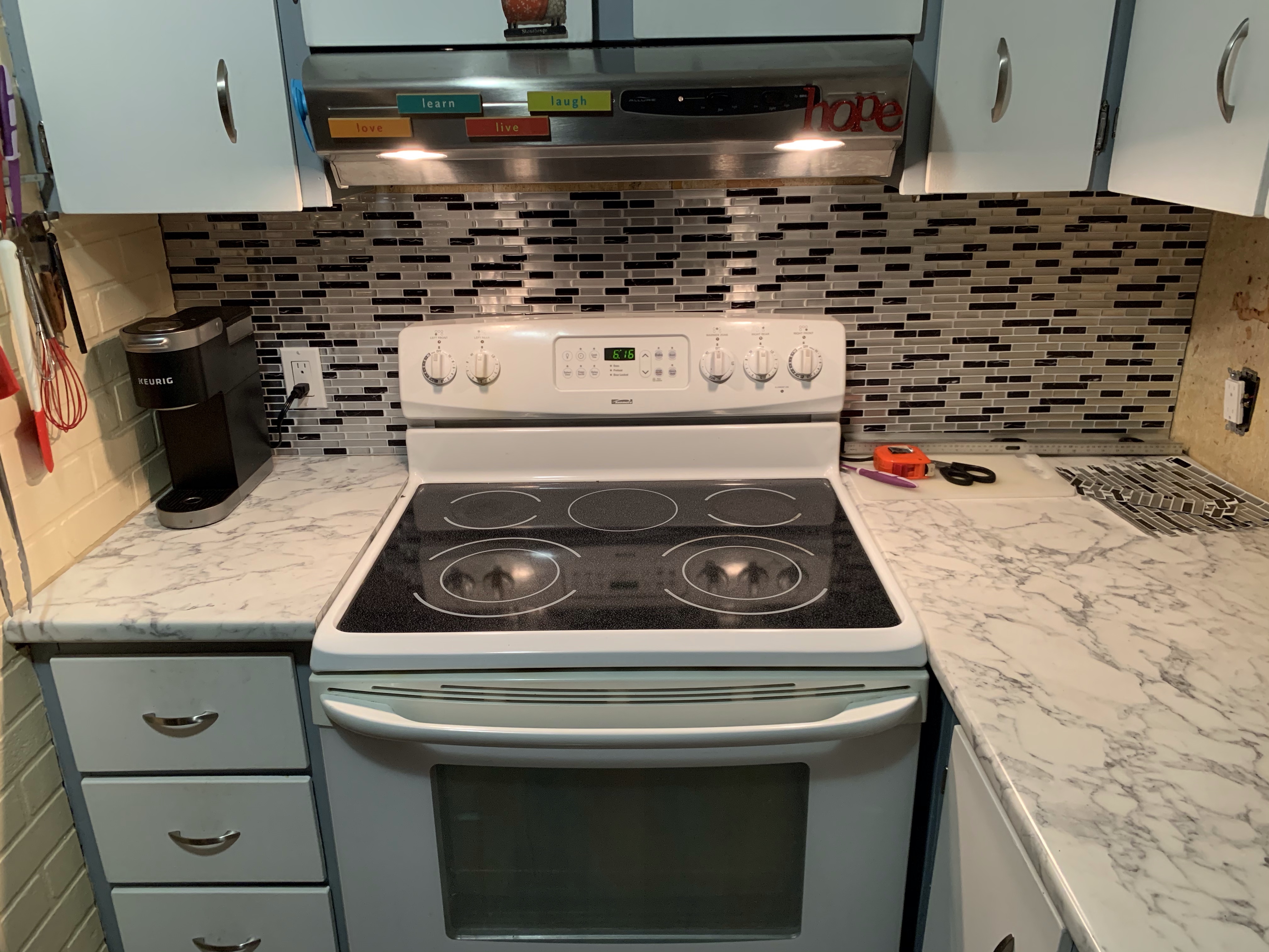 I came home and decided I just had to know what the tile would look like on the wall so I did the first stretch after shimming and screwing the countertop into place. I was very pleased with the results. It wasn’t too hard to do and I just have to figure out the trim I will use. Really can’t wait for the stainless stove and sink.