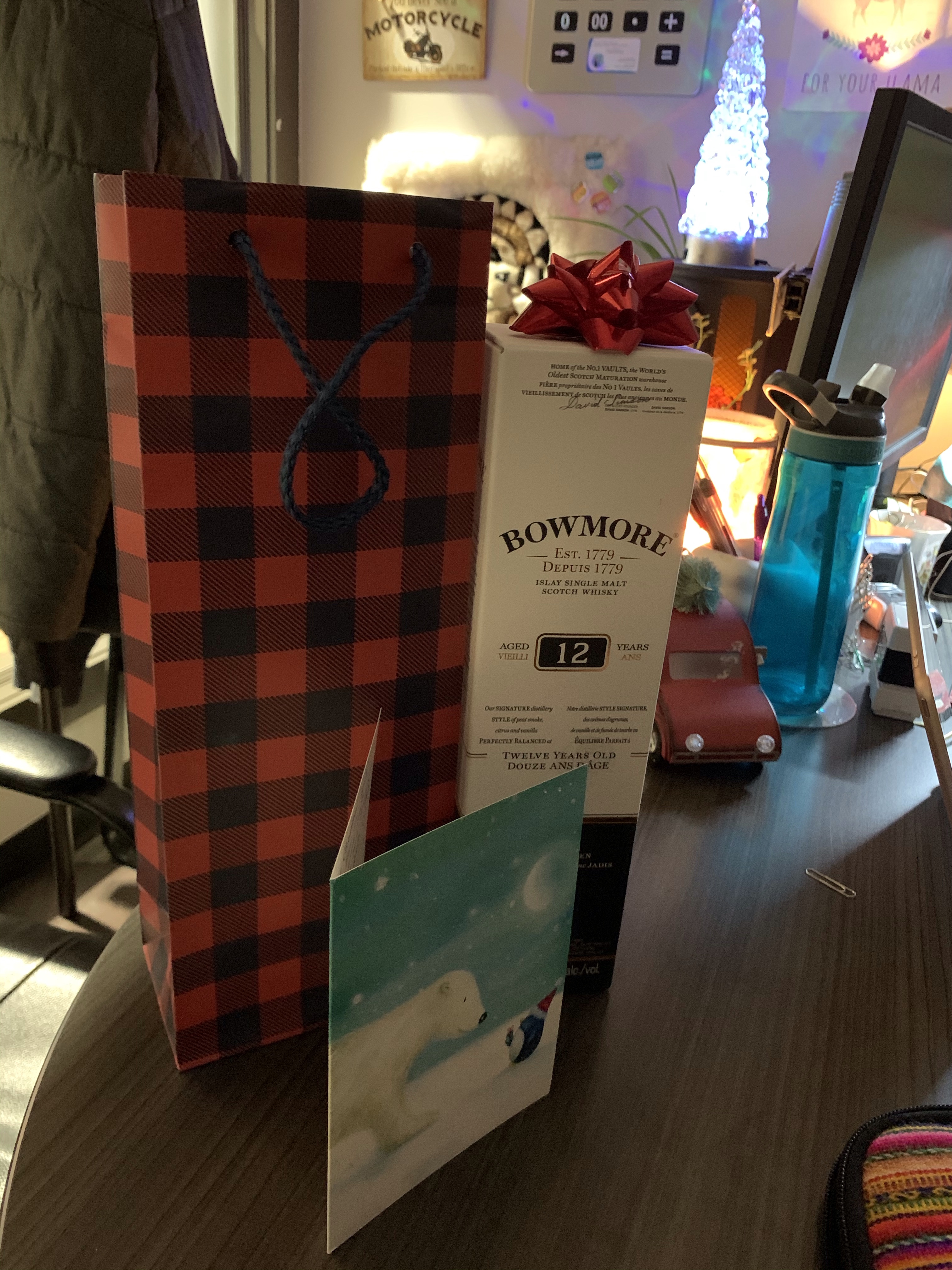 I feel as though I have been whiny and reactive at work and then a beautiful thing happened to perk me right up. The 4 people I do payroll for at CFEK popped into my office with a gift for Christmas, a delightful bottle of Scotch and more special to me, a card with lovely messages from each of them. They are so wonderful to make me feel a valuable part of the team. I also had gone to the mail this morning and there was a parcel from my cousin Debbi, and a card full of cash from my Mom. She had sent an envelope with cards for the kids so I was able to go after work to make the rounds and drop off. It was nice to have a small visit with them. I am making a plan to video chat with Emmy soon, I miss her terribly after spending every Thursday night with her for so long.