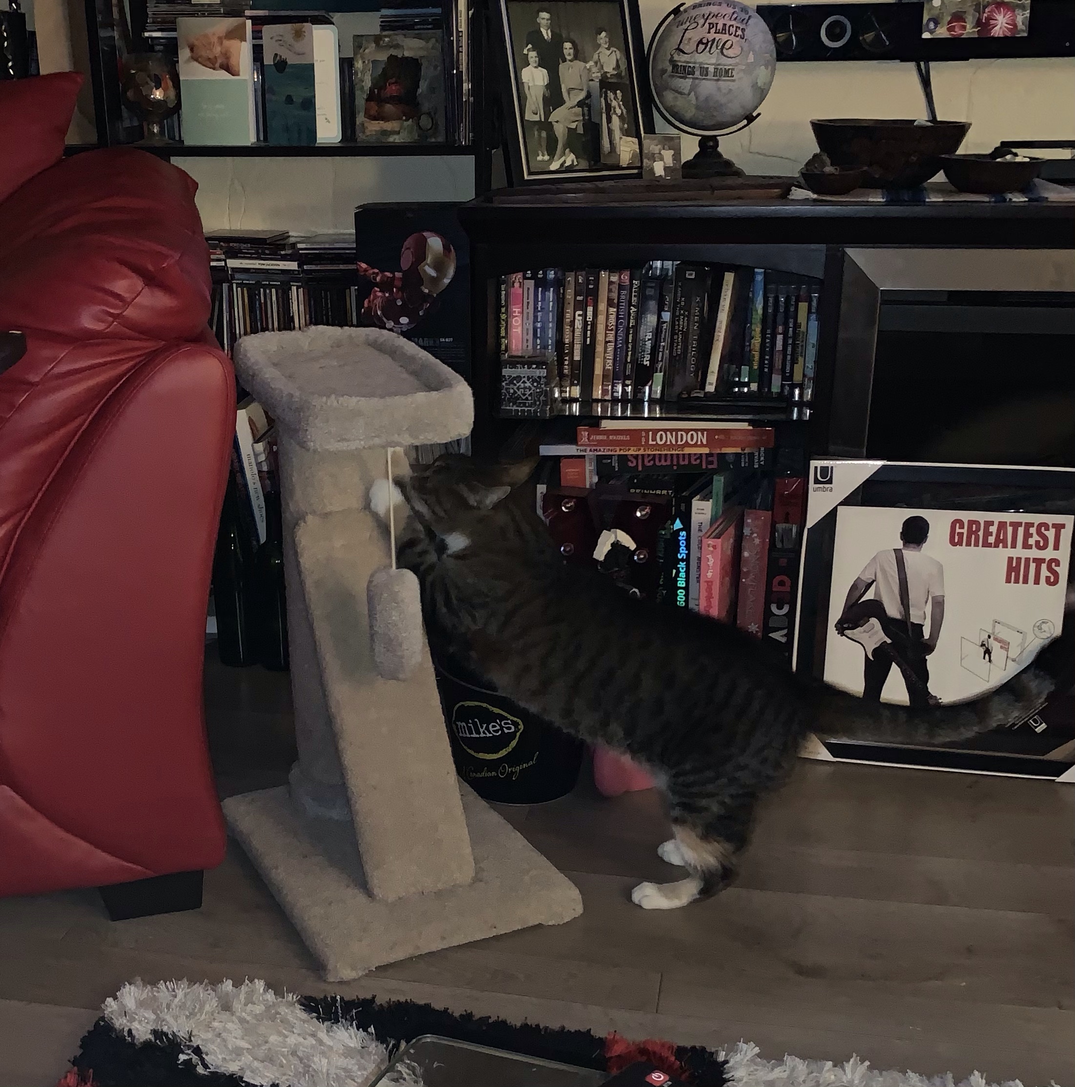 I was awoken by strong meows at 5:55 am. I am unsure still why Missy meows but I am pretty sure it is just her missing her previous bond. She seems to be settling in well though although I still haven’t found her spot. When I get home after work it takes her a while to come out from somewhere either in the den or my bedroom. Keri gave me a cat perch that her cats weren’t using any more and when I put it only 6 feet away from her own house she immediately scratched at it and claimed it as her own. She has been comfortably perched on it across from me all evening.