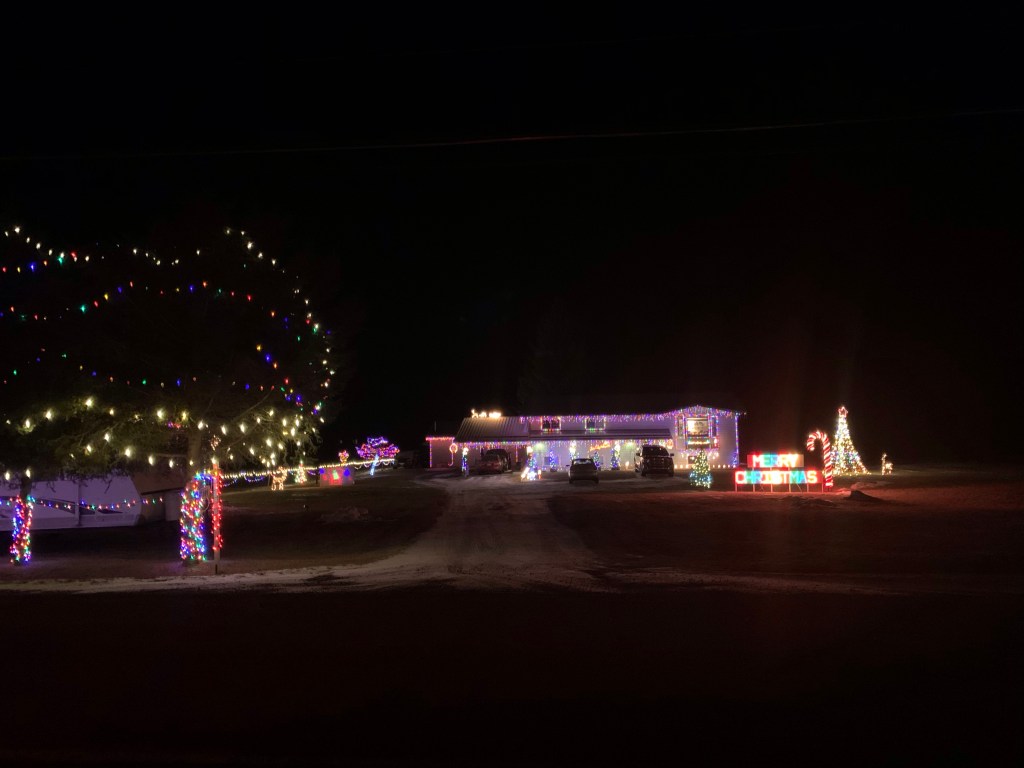 On the way home I pulled over and started the live stream of the CP Holiday Train on my phone so I could listen to the music on the way. As I was listening I passed through Jaffray which is one of the stops we usually go to to see the train come through and then race back to Cranbrook to see it there as well. There was a beautifully festive house I just had to take a picture of, right across from where it usually stops.