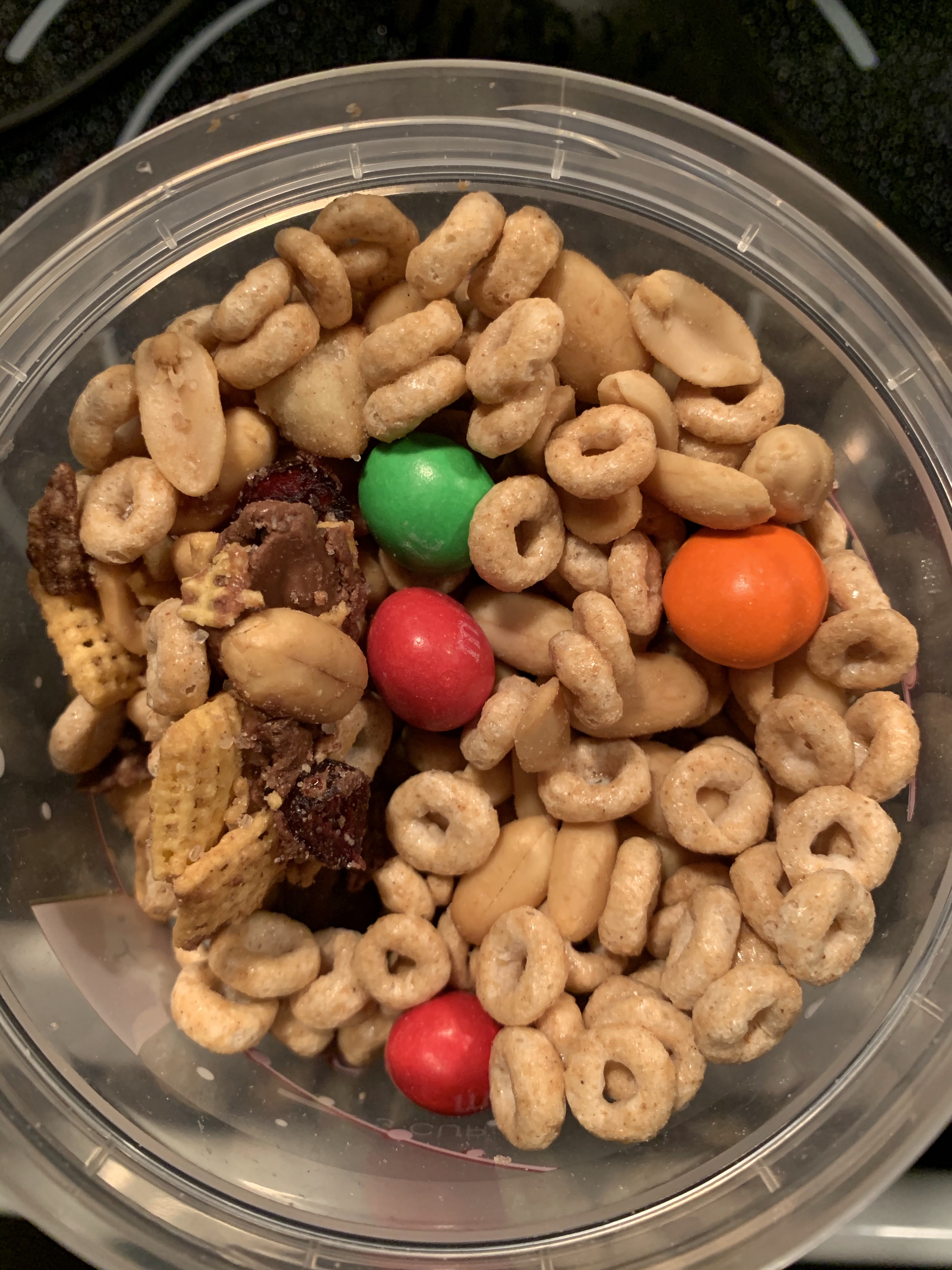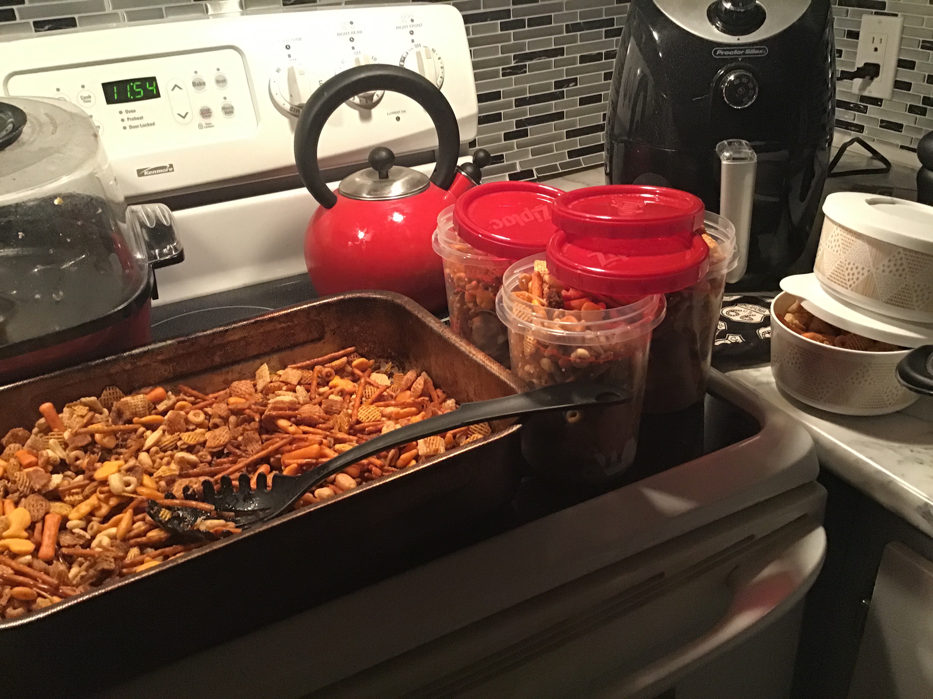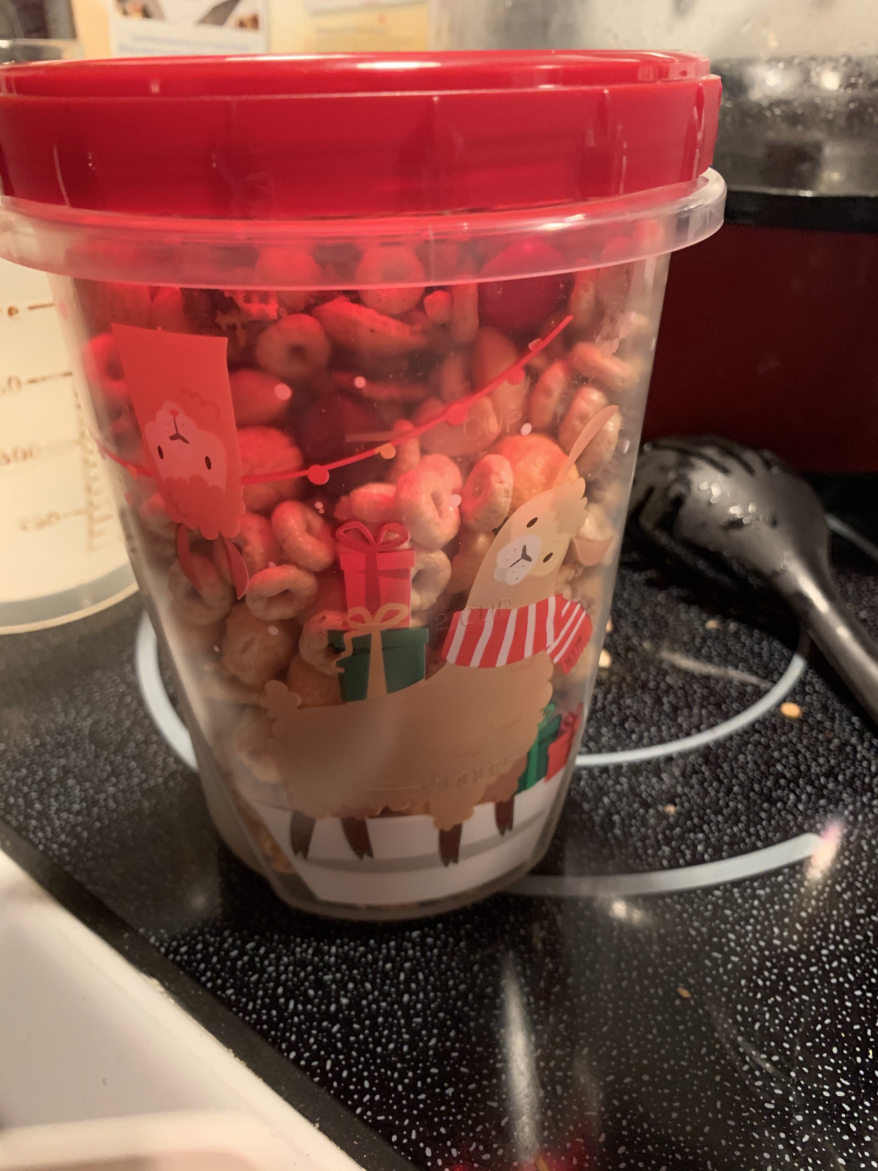 While that was cooking I began making savoury and sweet batches of nuts and bolts snacks for gifts. I have an unholy mess and no sink connected yet but Thursday is the last day at work for many of my co-workers so I wanted to get it done. I will make more for others soon. Some is also for my friend Diana who is also Emmy’s daycare lady. It is her birthday tomorrow and I will be sure to drop some off in some festive Tupperware just for her.