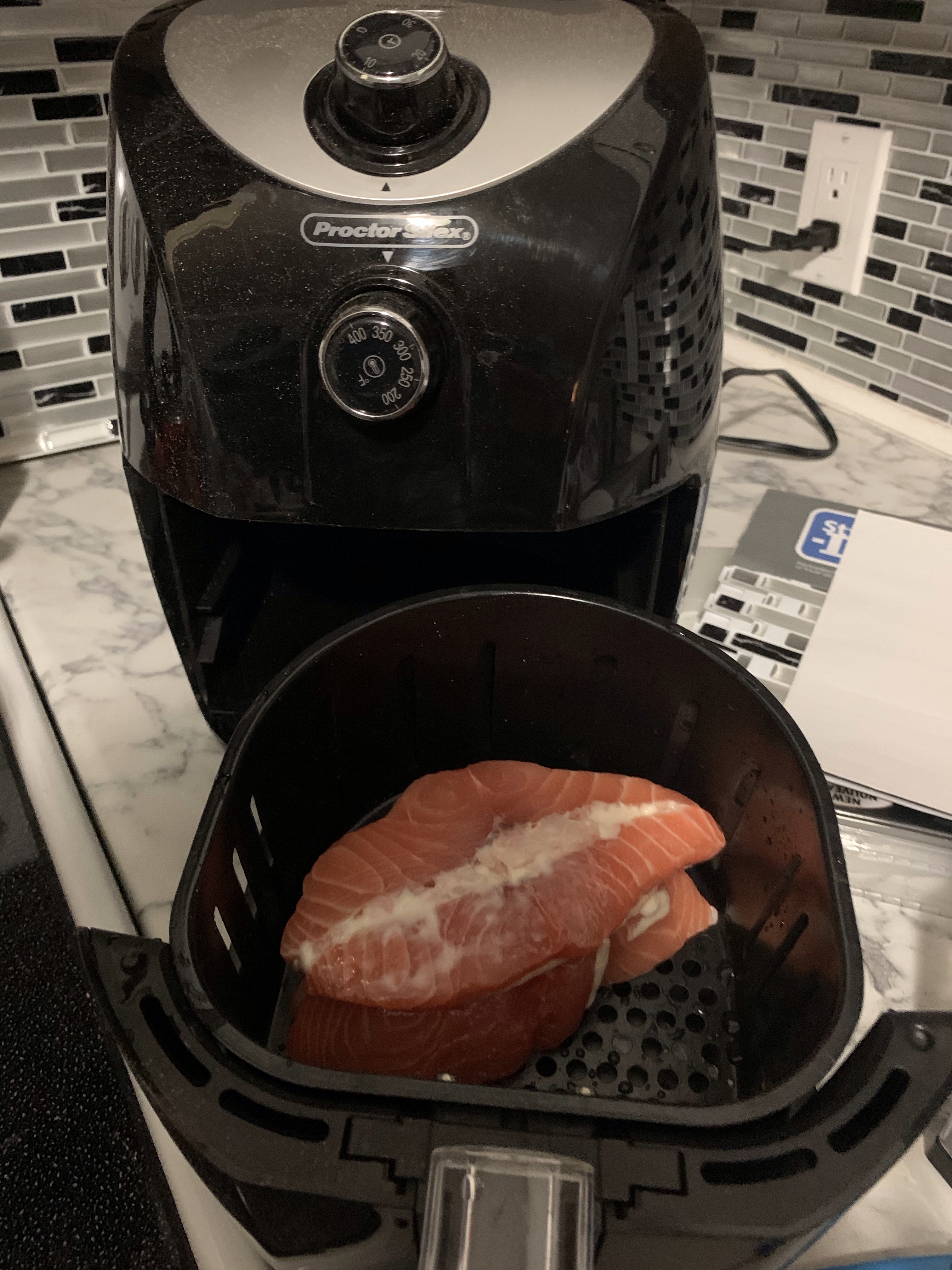 I came home and put the Atlantic Salmon and Shrimp Tourneda I had picked up in my air fryer. 15 minutes later I had perfectly done deliciousness.
