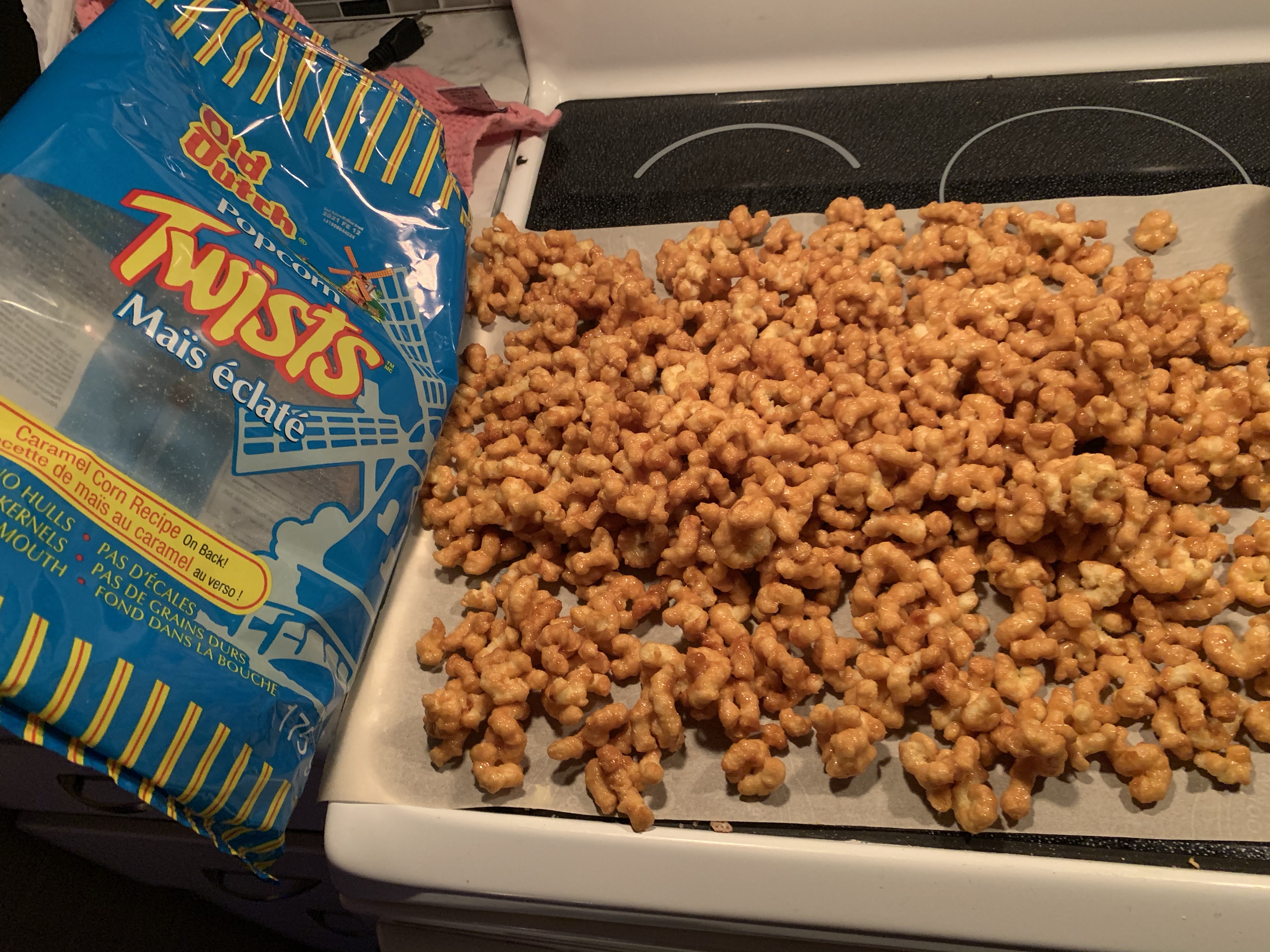 I didn’t get home until late and I was hungry. I put an almond crusted fish fillet in the air fryer and had it along with an Asian salad. It was so delicious and took all of 10 minutes. Meanwhile I made caramel popcorn twists. I think these may be a new addiction!