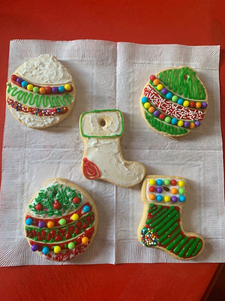 The best part of my day was picking up a tray of goodness from the Guedes household and bringing it to share with Ken and Ashlée. We decorated cookies. Ashlée did the top row, Ken the second and then mine