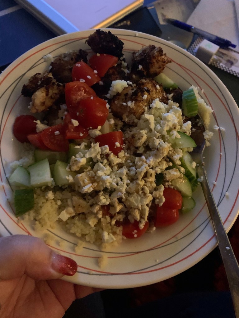 A client messaged she was making stew and could she bring me some tomorrow along with cheese biscuits. How sweet! I know what I am having for dinner tomorrow. I still am doing ok talking with clients but am otherwise still peopled out. Not depressed just low on energy and I use up bursts of it when on the phone. I stayed late to finish off some things and came home to make panko chicken nuggets in the air fryer and couscous in the microwave. Added cucumber and tomato and a bit of feta for a delicious meal but am really struggling with heartburn. I have half left for lunch tomorrow but I find myself far too aware of everything gastro now. I guess I really do fear further problems. I wish they knew why the ileus happened so I could just avoid that.