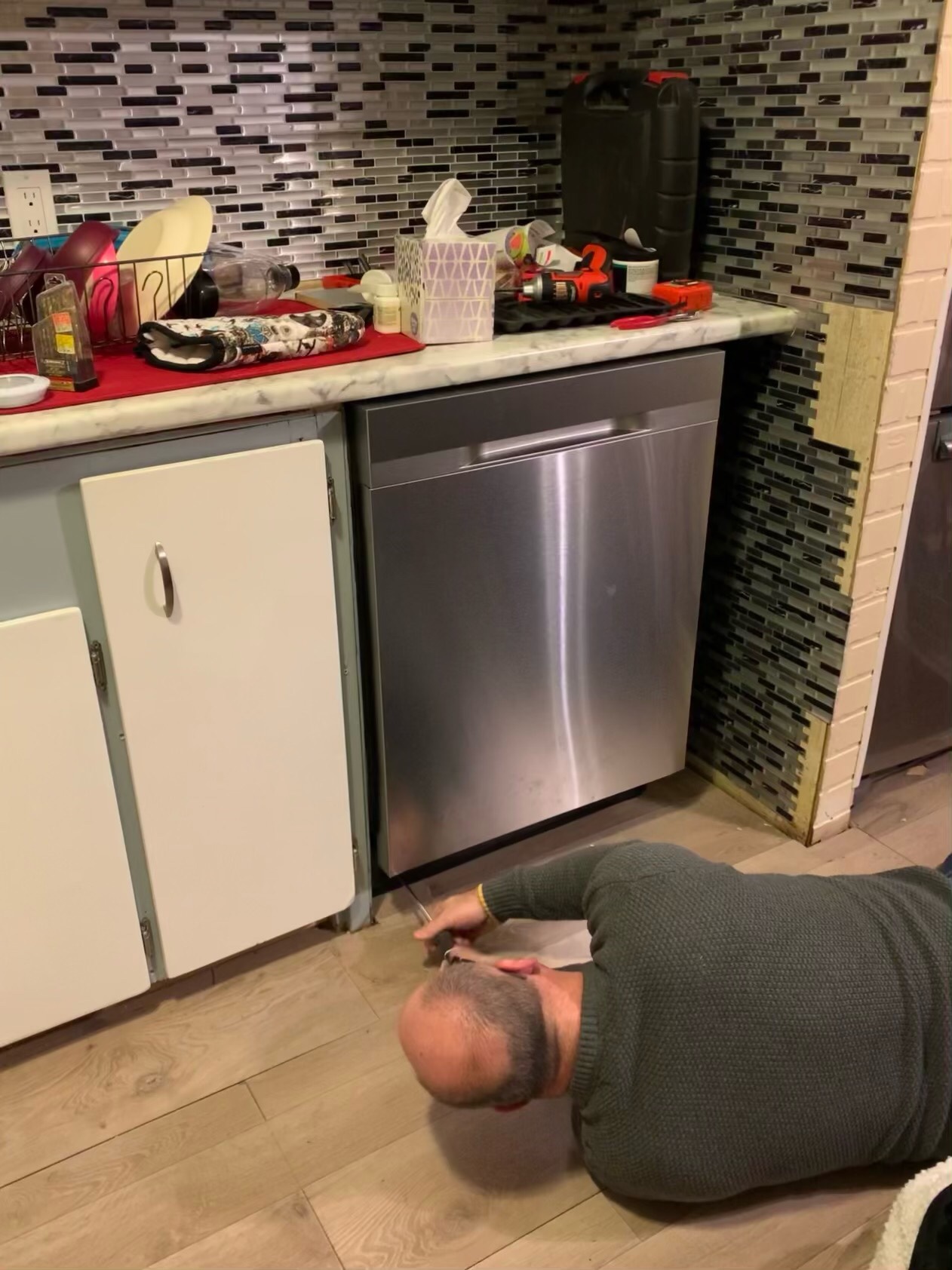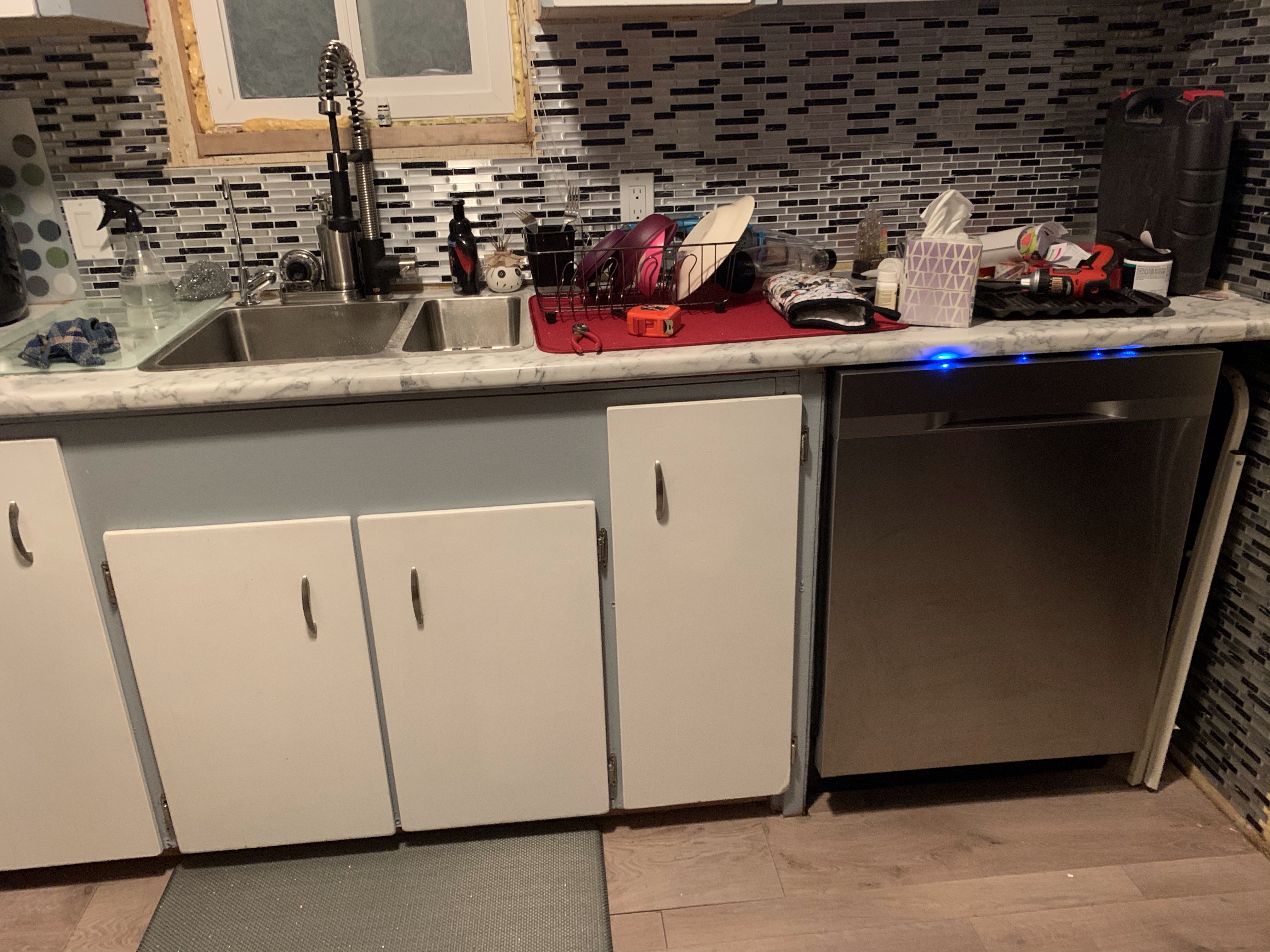 The project of the day was to get the dishwasher installed. It was not as easy as it should have been and I am super grateful Sean, the rent a husband, came to do it. I took three trips to Home Depot all together. The last only for a larger hose clamp. I did Flex tape the connection and put a container under the drain to give it a trial run tonight. It is very quiet even with one side basically exposed. It is so exciting to finally have all the appliances in place! Thank you Sean!
