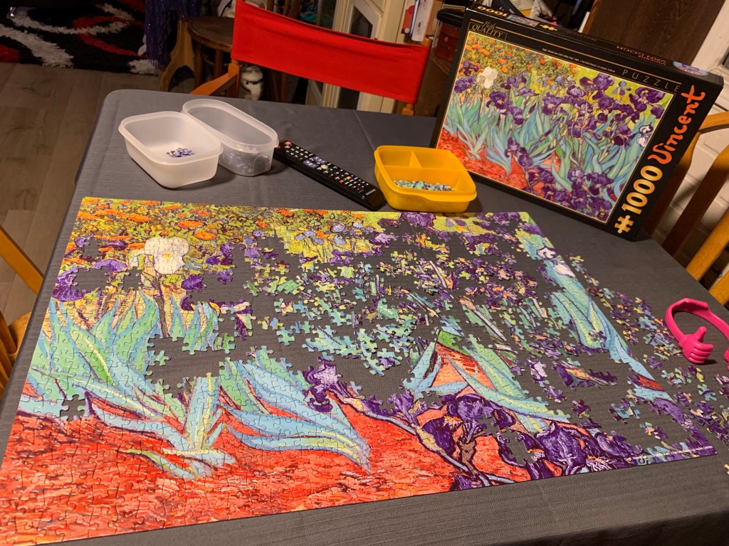 I started using the remedies the Naturopath sold me yesterday and my system is automatically over reacting to anything my guts are sensitive to. I am going to stick to it though. Otherwise, what’s the point. I am suffering a bit though and afraid to go lie down no matter how tired I am. I tried to watch my shows after dinner as I did more of the puzzle. I poured a glass of red wine and barely had any of it before the heart burn kicked in. I regret that choice. I suspect messing with my diet and meds during April may not have been the best choice but I am motivated to solve my health issues. I am as usual filling my days multitasking like a maniac.