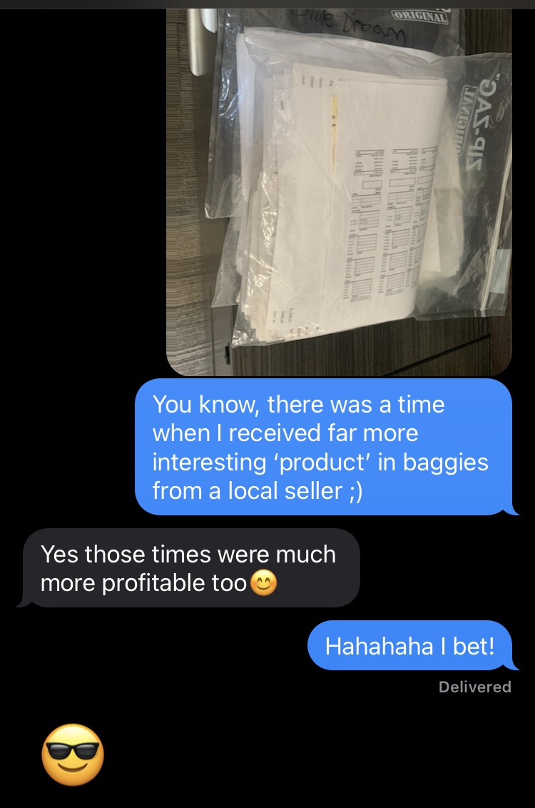 I had a good laugh when my Cannabis store client dropped her paperwork through the mail slot and we had a funny text moment.