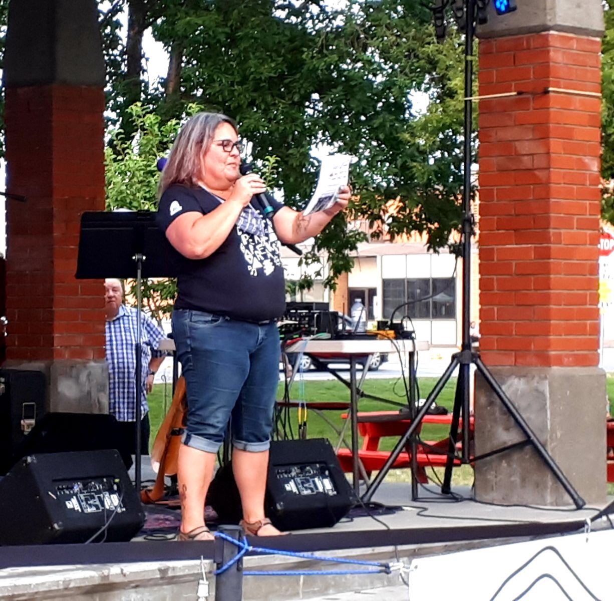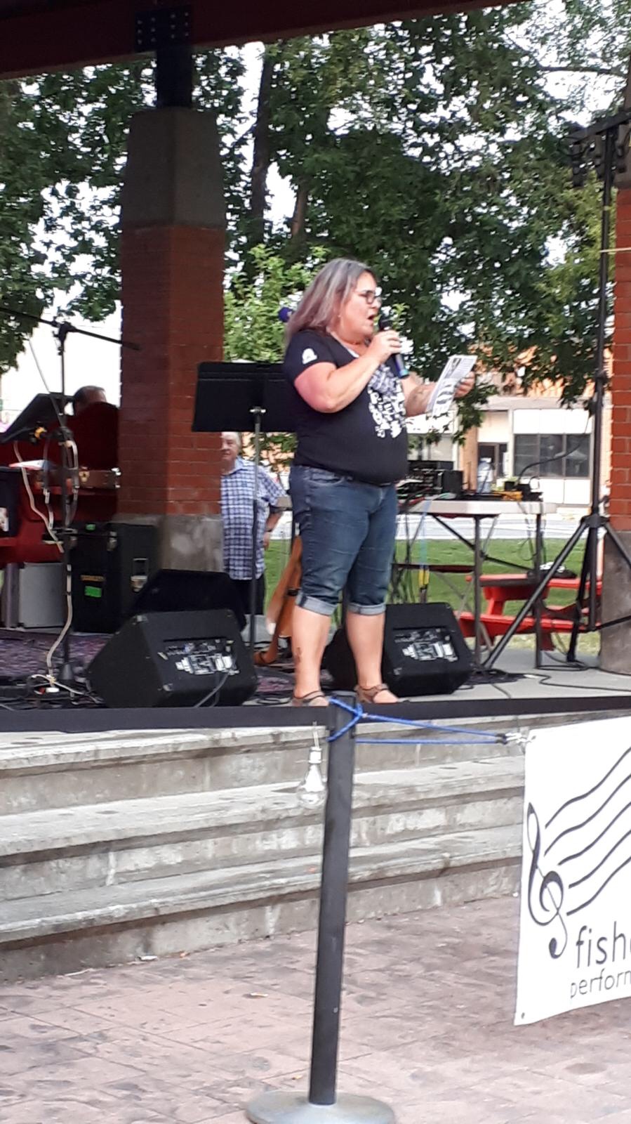 I did the money counting from last night in the park, we are doing well with our new memberships. Everyone is so happy to have live music back. Maureen sent me some pictures from when I was introducing who will be playing next week. I do love emcee gigs. Just need to dress more flatteringly… what a gut, sigh.