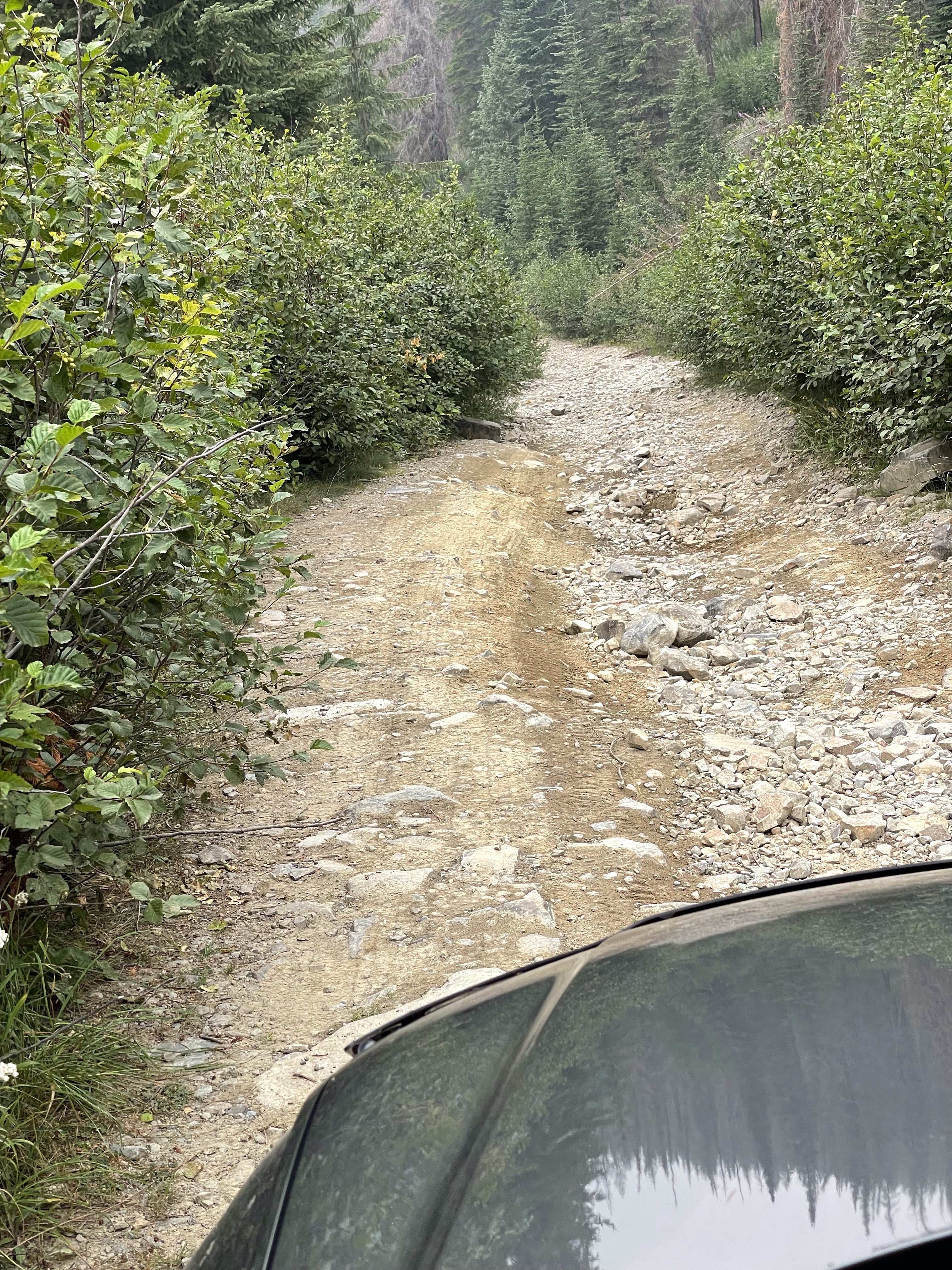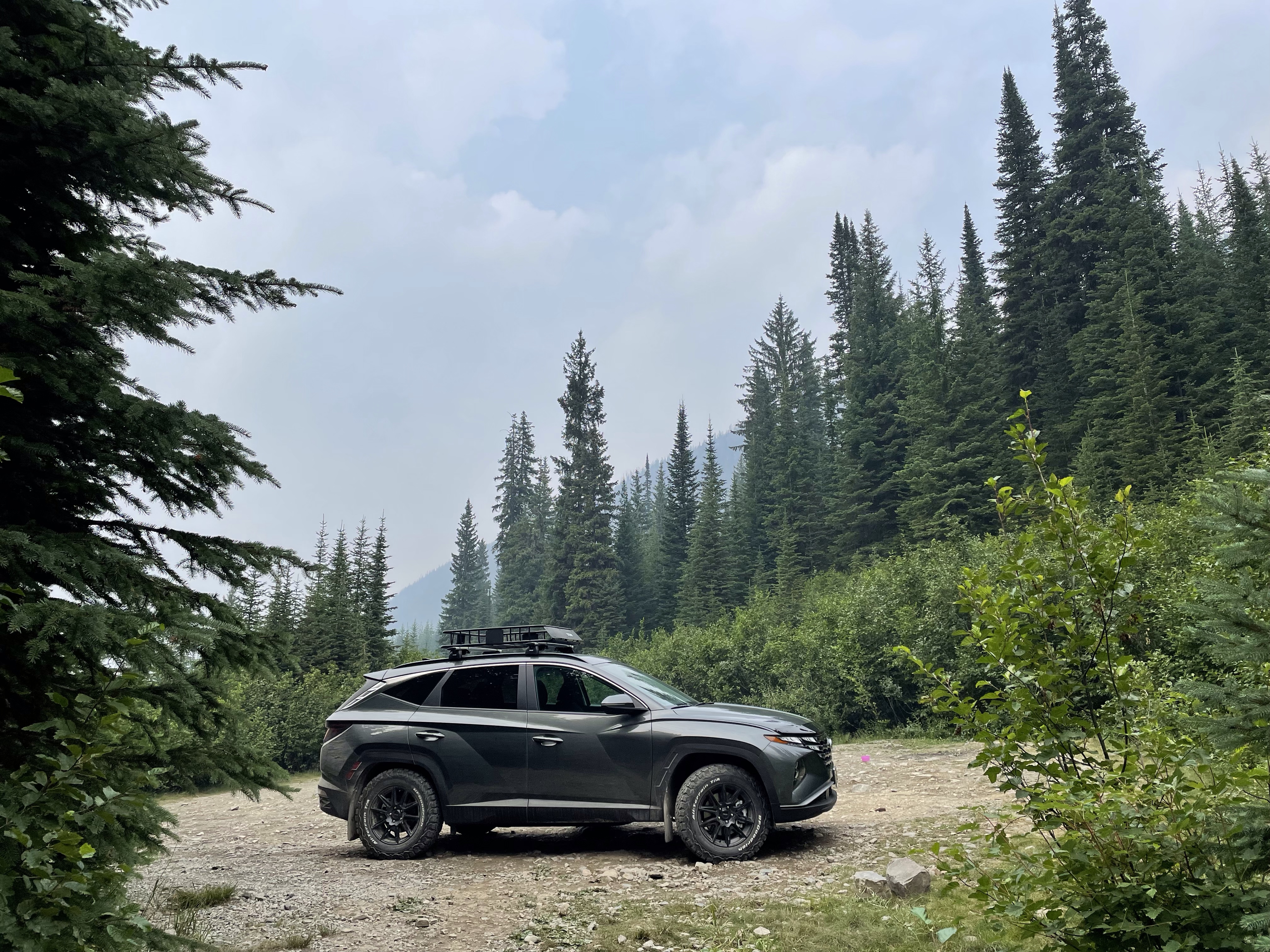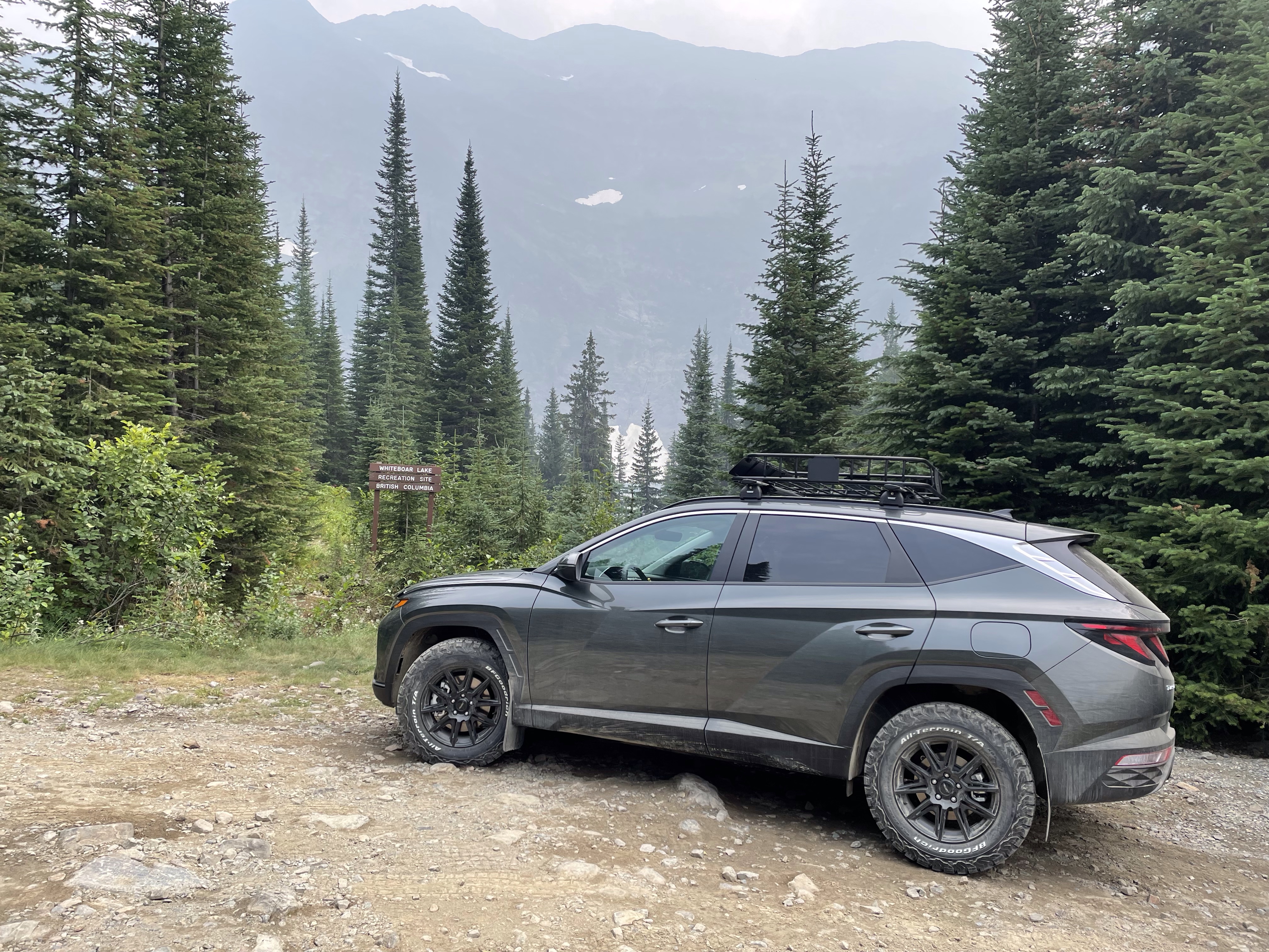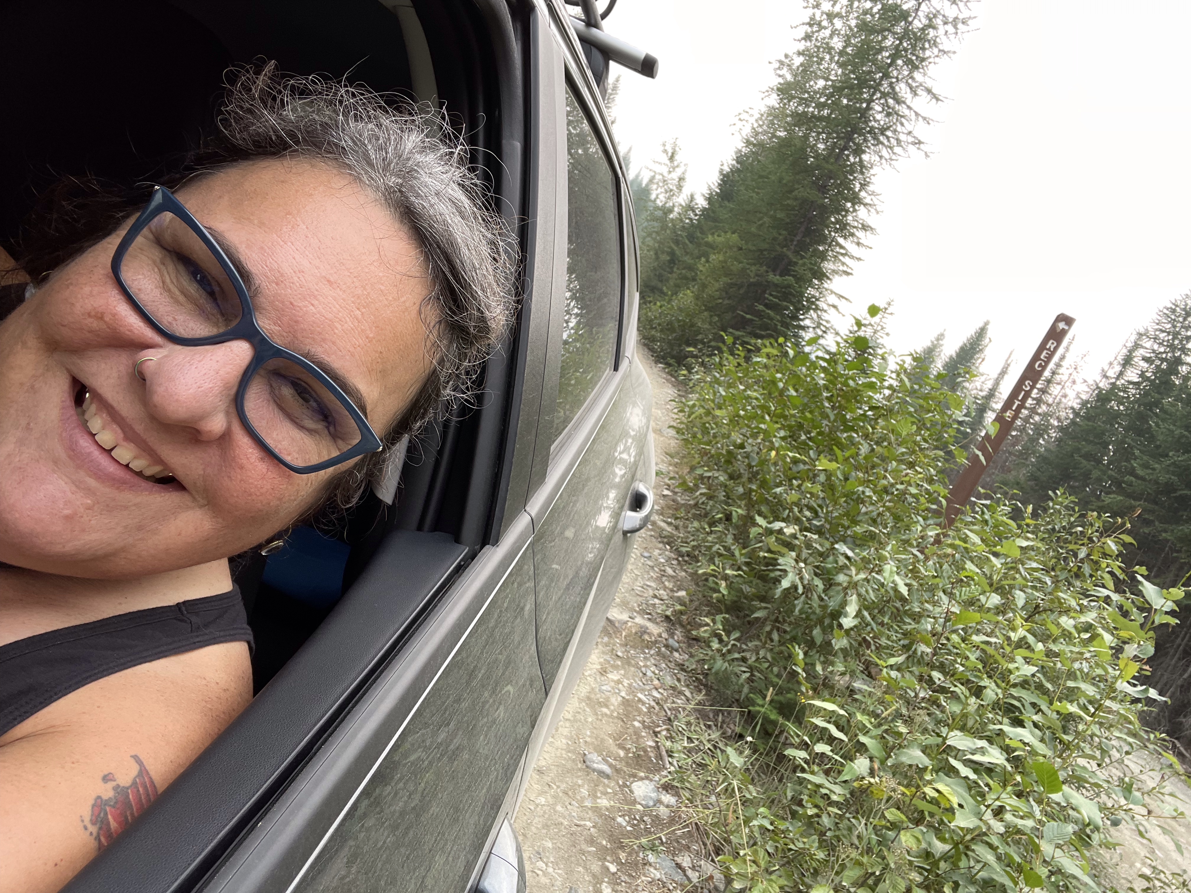 We headed out with the goal of driving up to the falls, taking it in and heading back. There was some confusion as to where exactly to stop and she had explained to me that the road continued on to White Boar Lake and glacier but the road to it was usually only usable by trucks so of course I had to prove that wrong…. I was already believing my Tucson was more like a truck than a car anyway, the way it is decked out so we kept going. 11 Km later we were at the Lake and it was the best decision ever!! So gorgeous and the road up was like a riverbed in several spot but I took it carefully and never once bottomed out or scraped the sides. At one point a pickup was coming down and I had to give right-of-way and back down for quite a ways around curves and all until there was finally a pull out wide enough for him so I could go by. Back up camera and nerves of steel for the win!! I have to say he must have been impressed. We parked and there was no one else up there so it was incredibly peaceful. There is a short hike down to the lake and it is stunning, even with the Smokey skies, I can’t wait to go back when it is clear again. We ate huckleberries and took photos and enjoyed stretching our legs. I need to buy bear spray and go back there to camp. No cell service, no crowds, just picnic tables and an extremely well kept, odour free, toilet paper stocked outhouse! I finally got to use my new to me walking stick which are perfect, especially for swiping the cobwebs out of the way in the forest. They are actually kid sized ski poles that I got at the second hand store for $10 and they work perfect for short me.