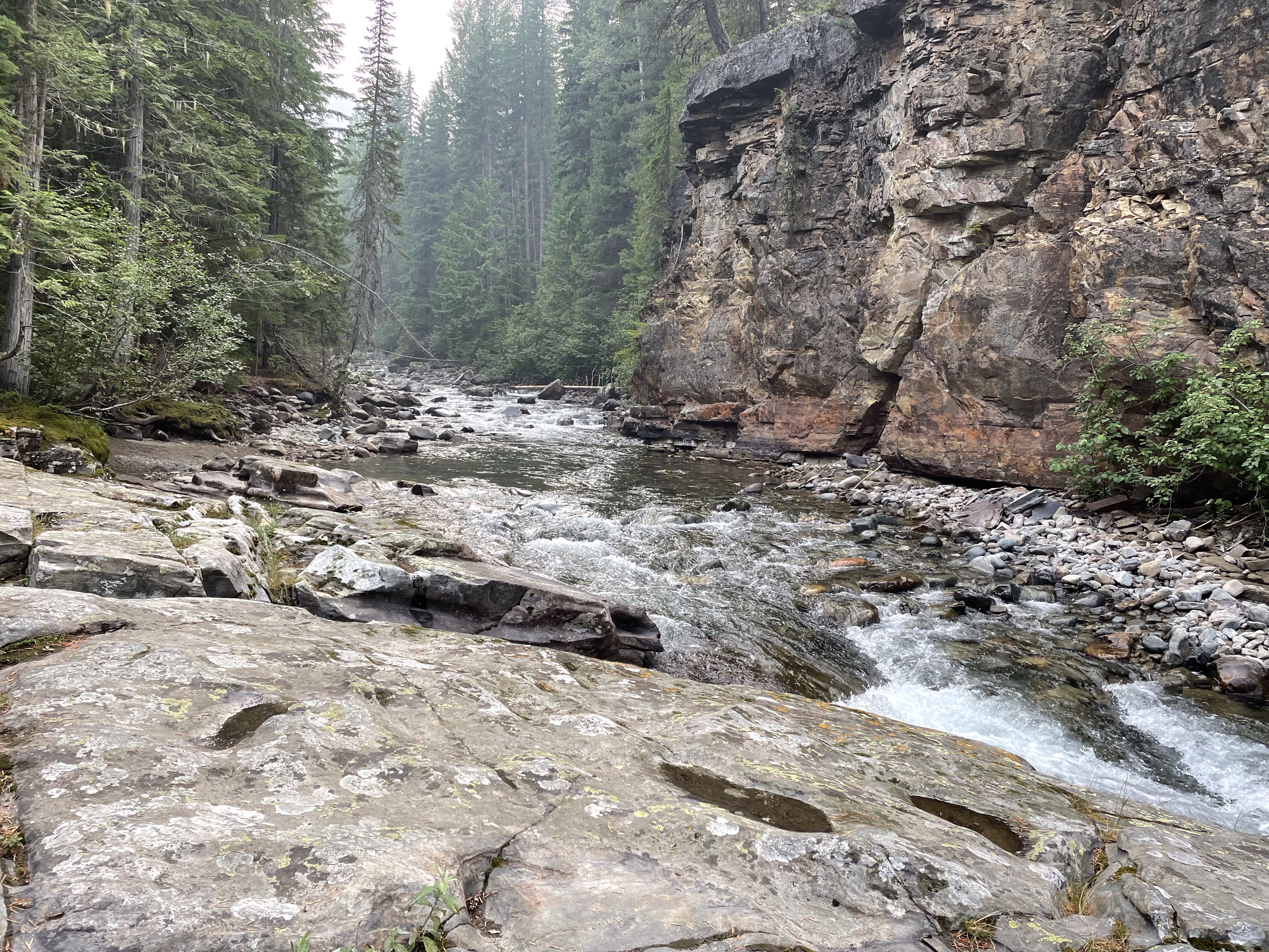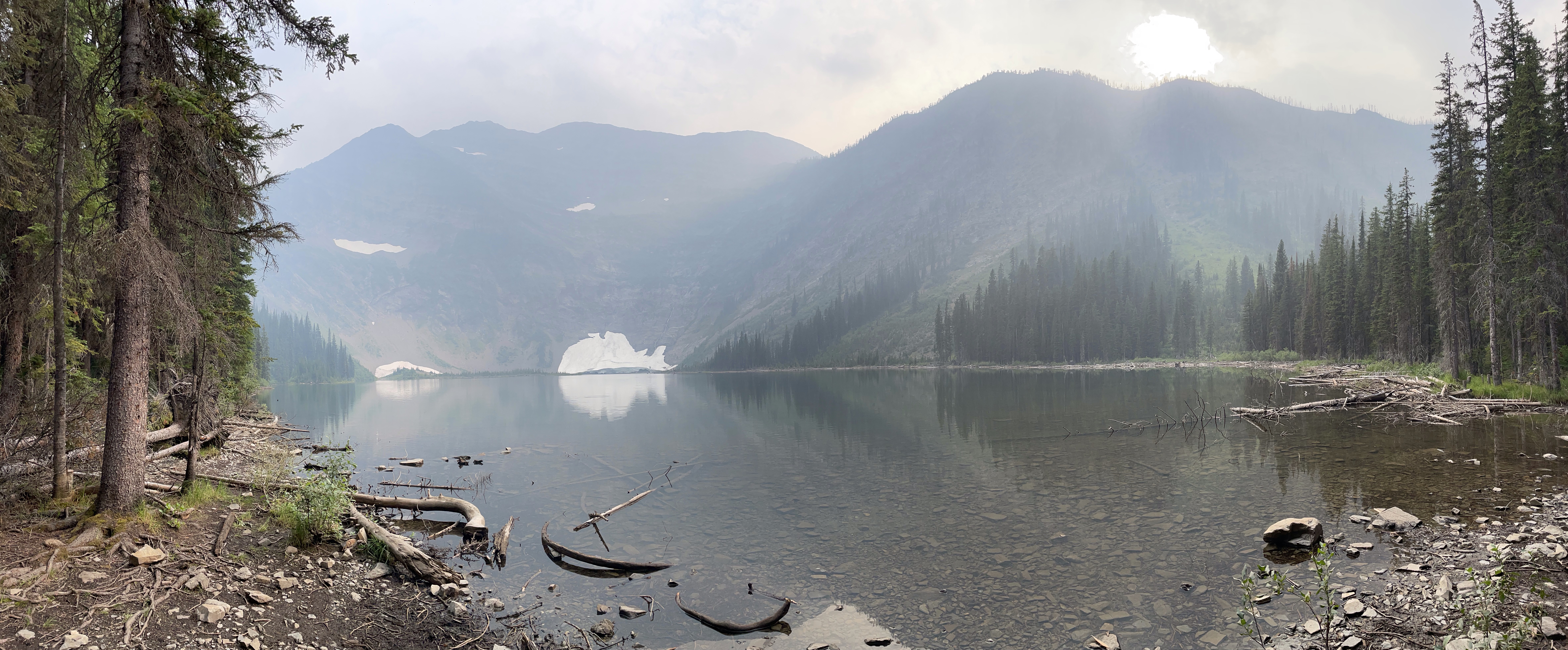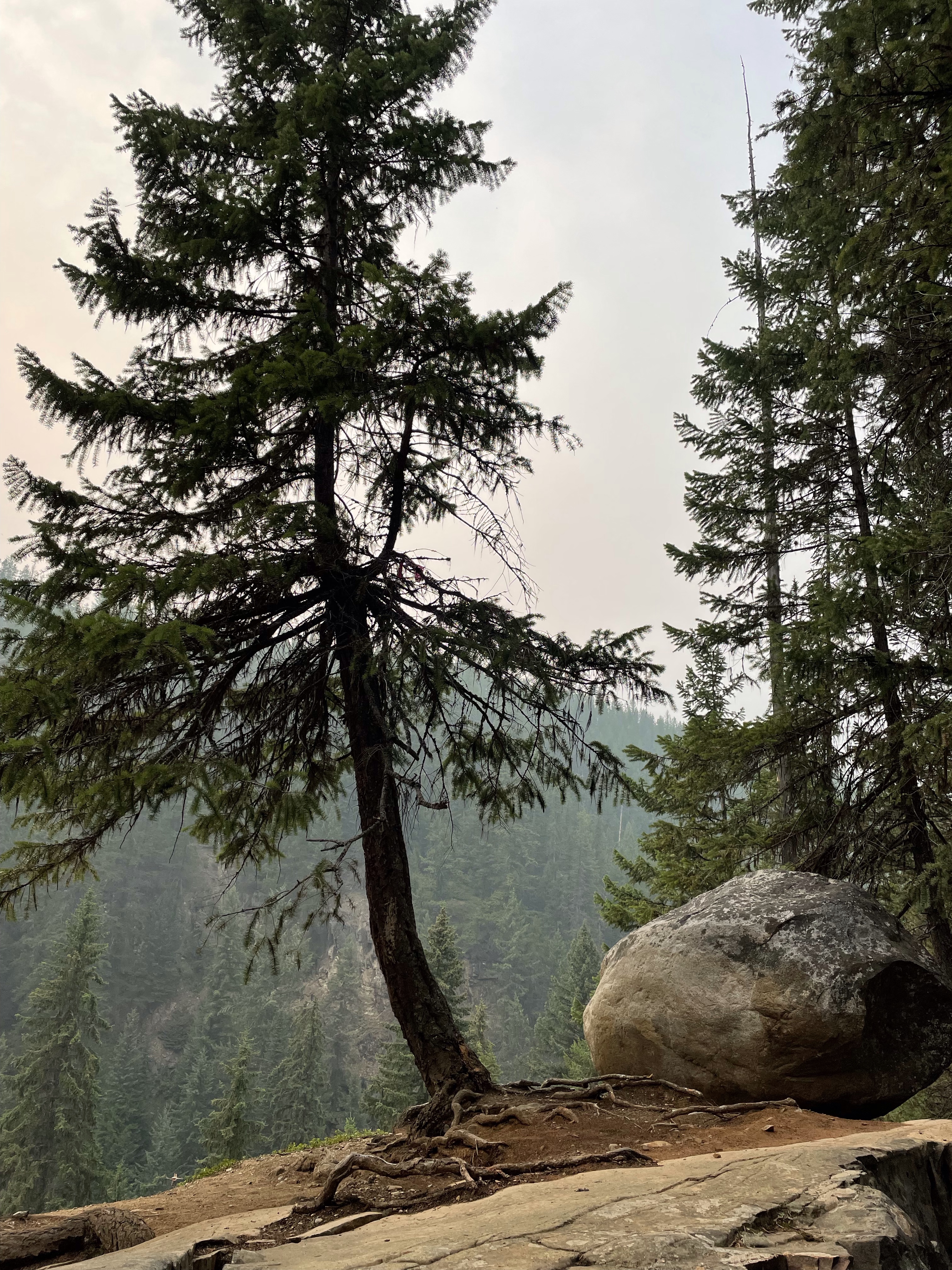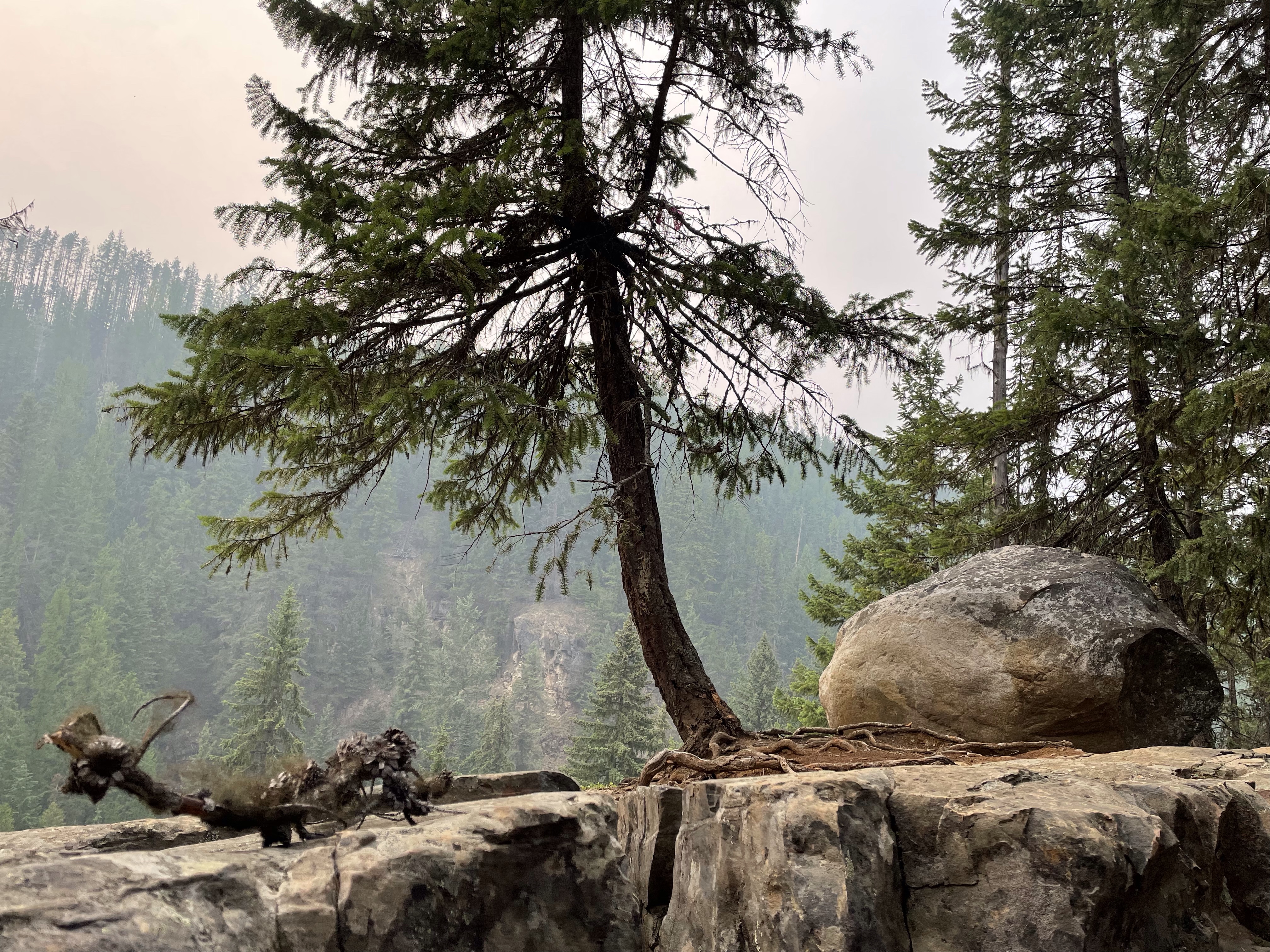 We headed out with the goal of driving up to the falls, taking it in and heading back. There was some confusion as to where exactly to stop and she had explained to me that the road continued on to White Boar Lake and glacier but the road to it was usually only usable by trucks so of course I had to prove that wrong…. I was already believing my Tucson was more like a truck than a car anyway, the way it is decked out so we kept going. 11 Km later we were at the Lake and it was the best decision ever!! So gorgeous and the road up was like a riverbed in several spot but I took it carefully and never once bottomed out or scraped the sides. At one point a pickup was coming down and I had to give right-of-way and back down for quite a ways around curves and all until there was finally a pull out wide enough for him so I could go by. Back up camera and nerves of steel for the win!! I have to say he must have been impressed. We parked and there was no one else up there so it was incredibly peaceful. There is a short hike down to the lake and it is stunning, even with the Smokey skies, I can’t wait to go back when it is clear again. We ate huckleberries and took photos and enjoyed stretching our legs. I need to buy bear spray and go back there to camp. No cell service, no crowds, just picnic tables and an extremely well kept, odour free, toilet paper stocked outhouse! I finally got to use my new to me walking stick which are perfect, especially for swiping the cobwebs out of the way in the forest. They are actually kid sized ski poles that I got at the second hand store for $10 and they work perfect for short me.