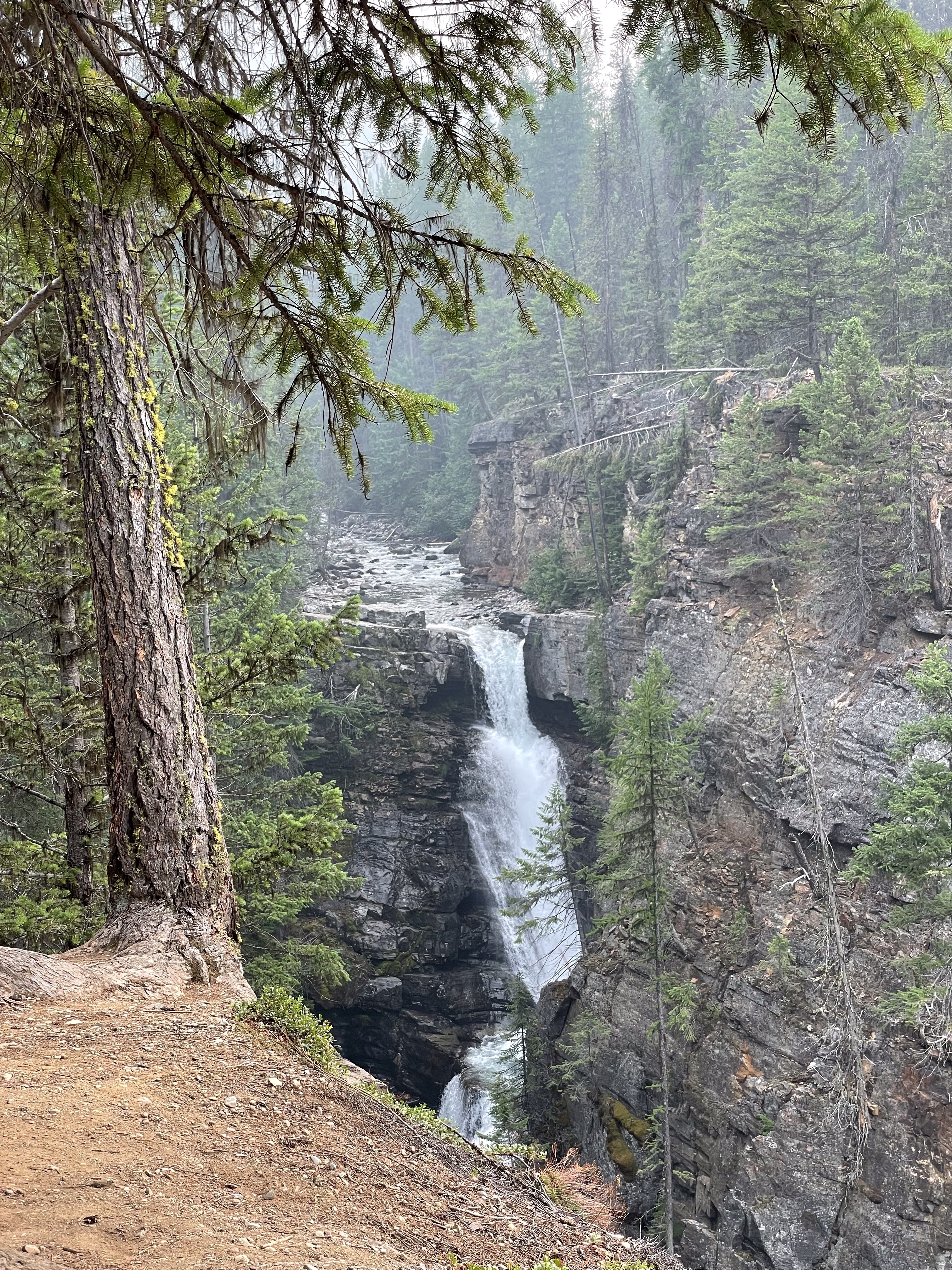 Jake and Emmy and my guests all left this morning so I spent time cleaning and sanitizing and doing loads of laundry. It was nearly 3 when I got a text from Diane asking if I wanted to go see Meachen Falls out near St Marys Lake where we had gone kayaking. Since it had gloriously pounded down rain for some time today I figured the sky would be clear and that would be awesome. I had also spent part of the day getting part way through the first of two thick manuals for my new SUV and new I needed to break in the engine with variable speed drives so that could be just the ticket. I finished throwing the last load in the dryer, threw on my hiking sandals and headed out to pick up D.