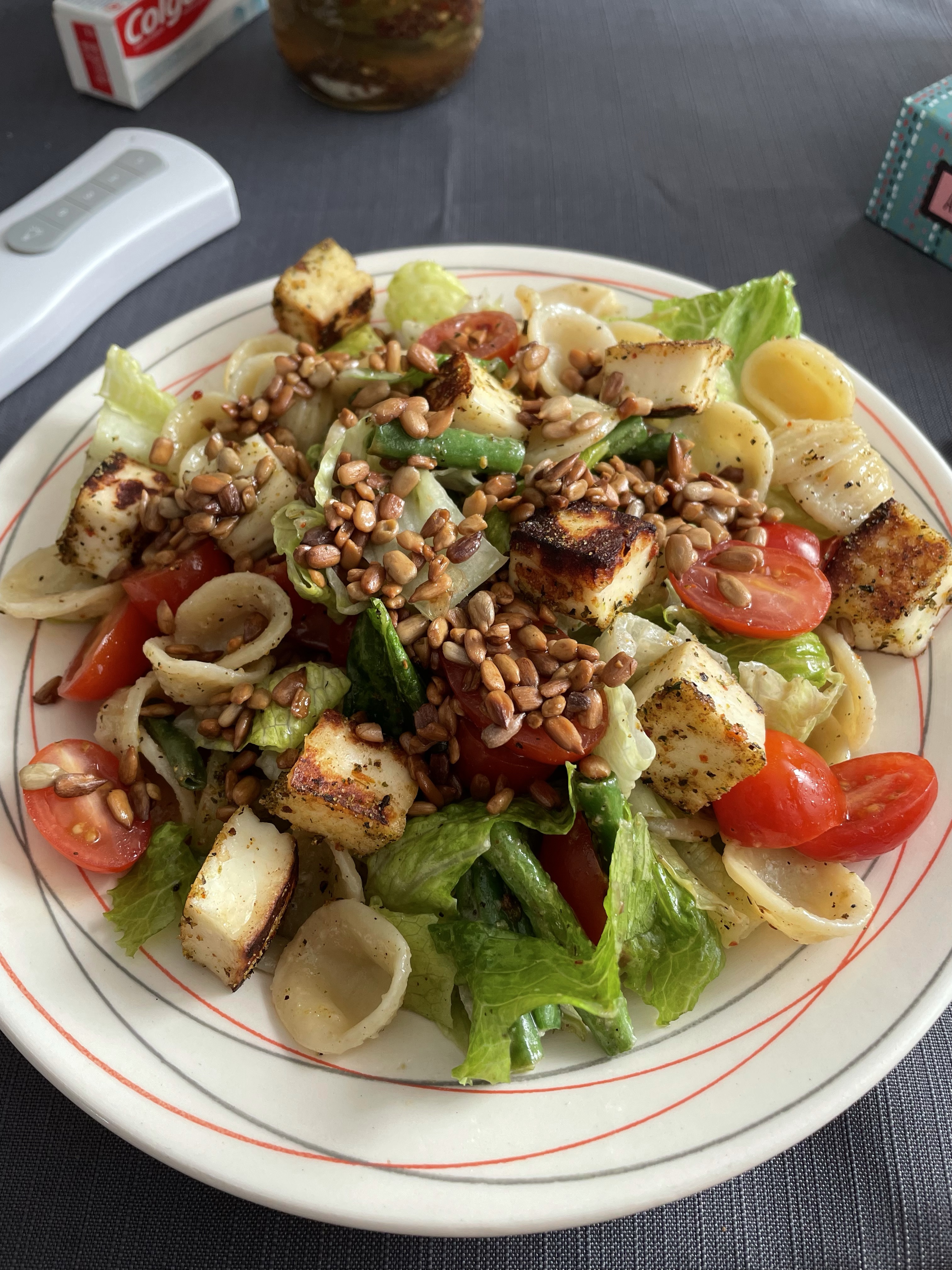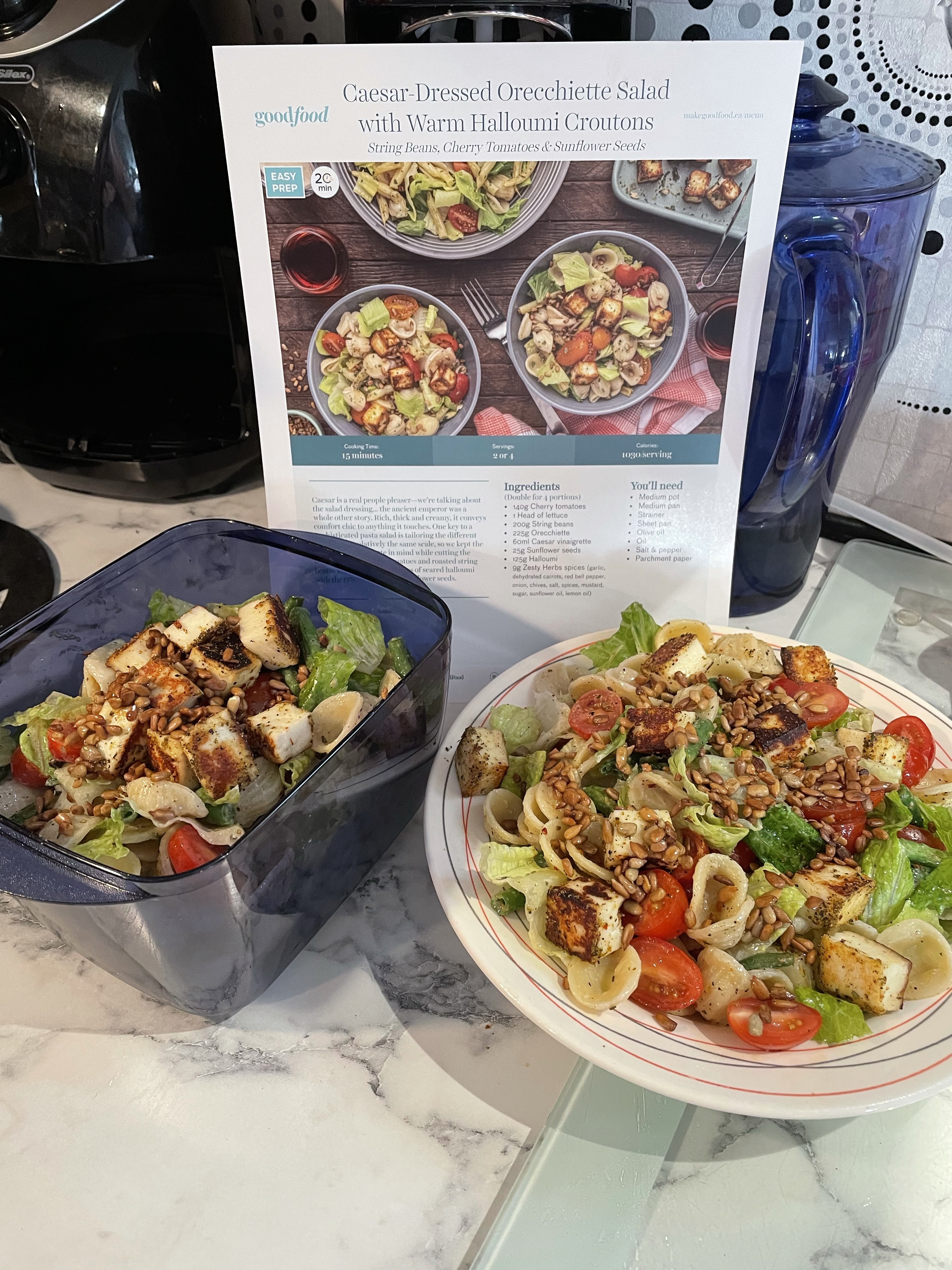My order of Good Food arrived. I only ordered smoothies this time. Enough breakfasts for a while and they fit in my fridge freezer. When I got home I made the last of my Good Food from last week. I had never heard of Halloumi before and it turns out to be a type of goat/sheep cheese that grilled up beautifully. The whole mix of pasta and veg, and salad was so delicious. I just managed to get it cooked and eaten before heading to my class