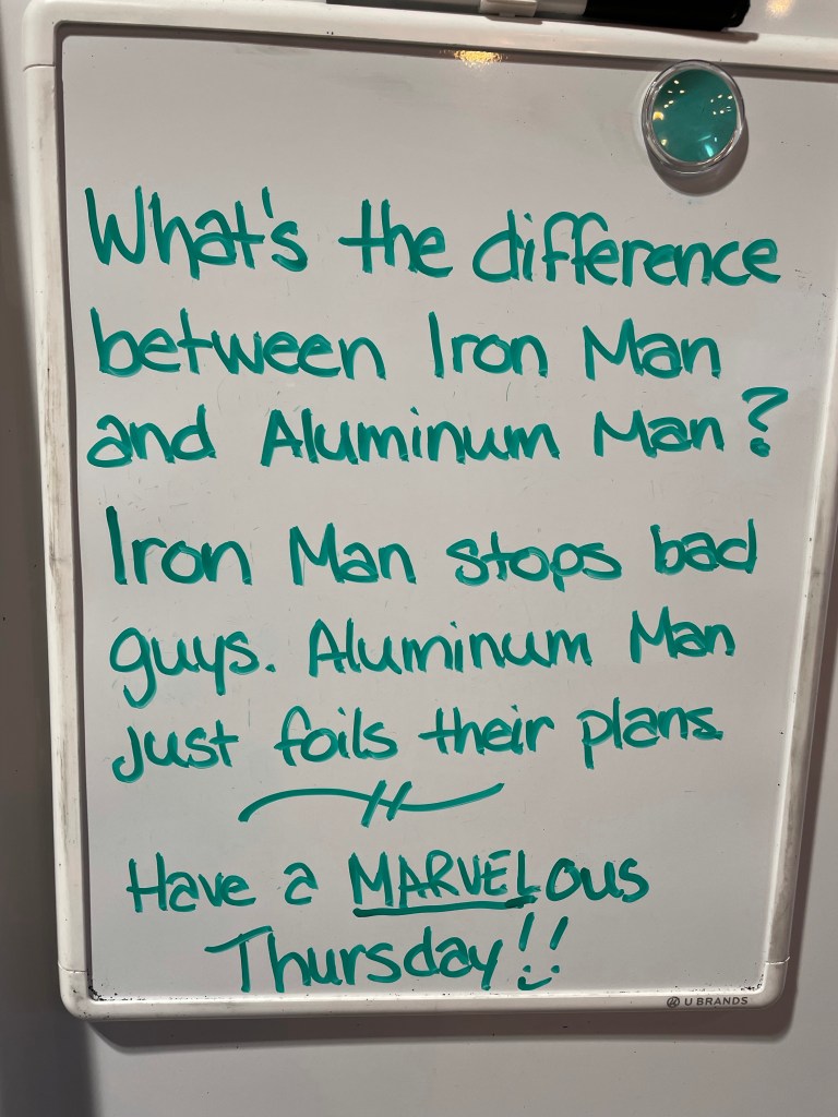 Nikki, the marketing person for the GroundFloor puts high level dad jokes on the fridge when ever she is there. I liked todays and shared it with my Grandsons and Besties.