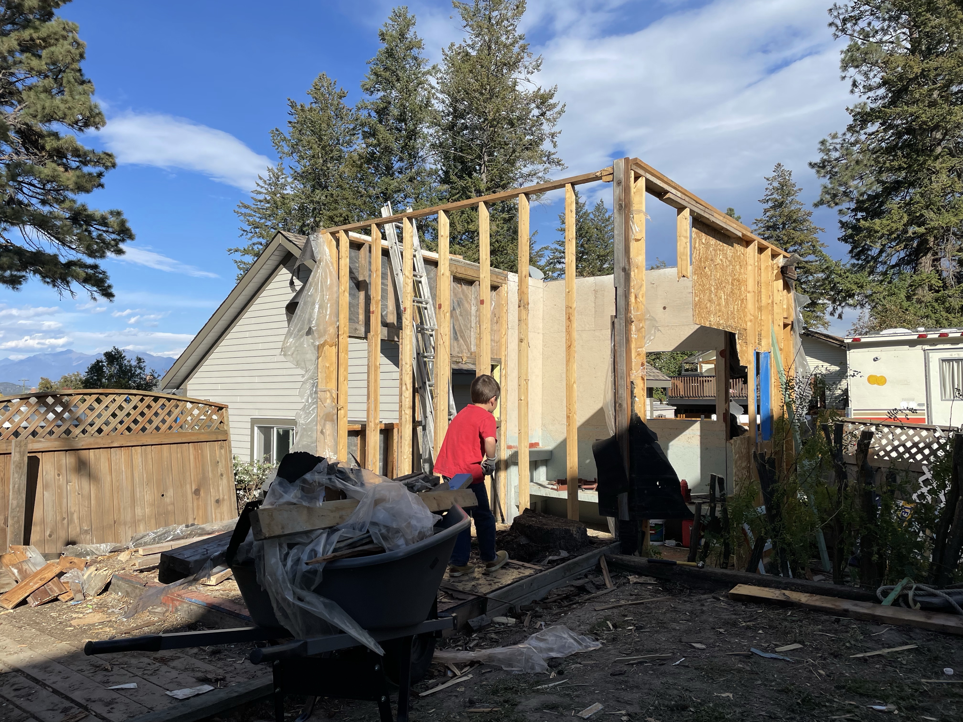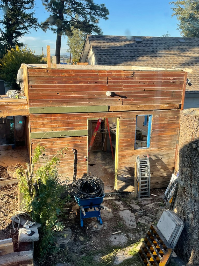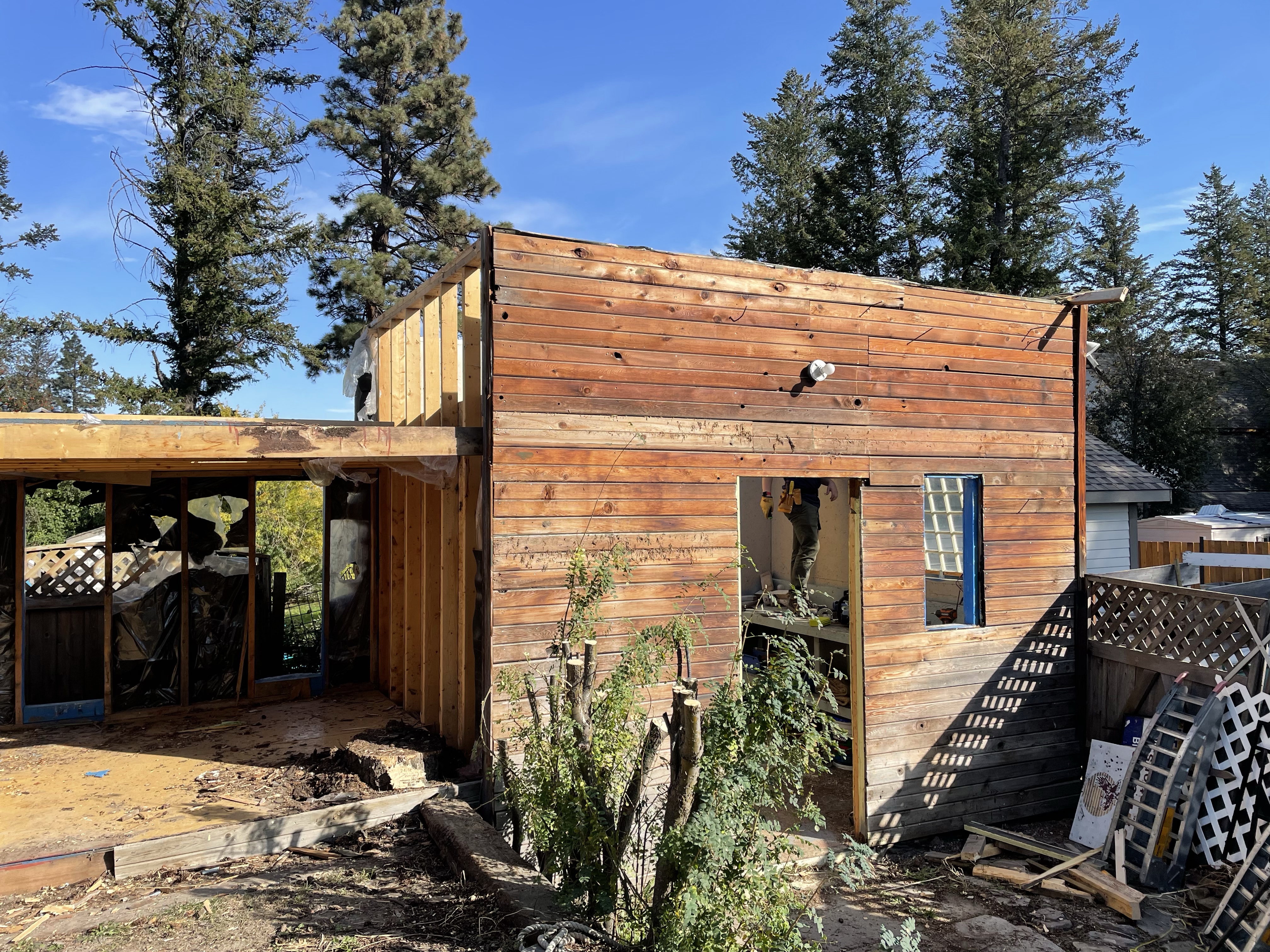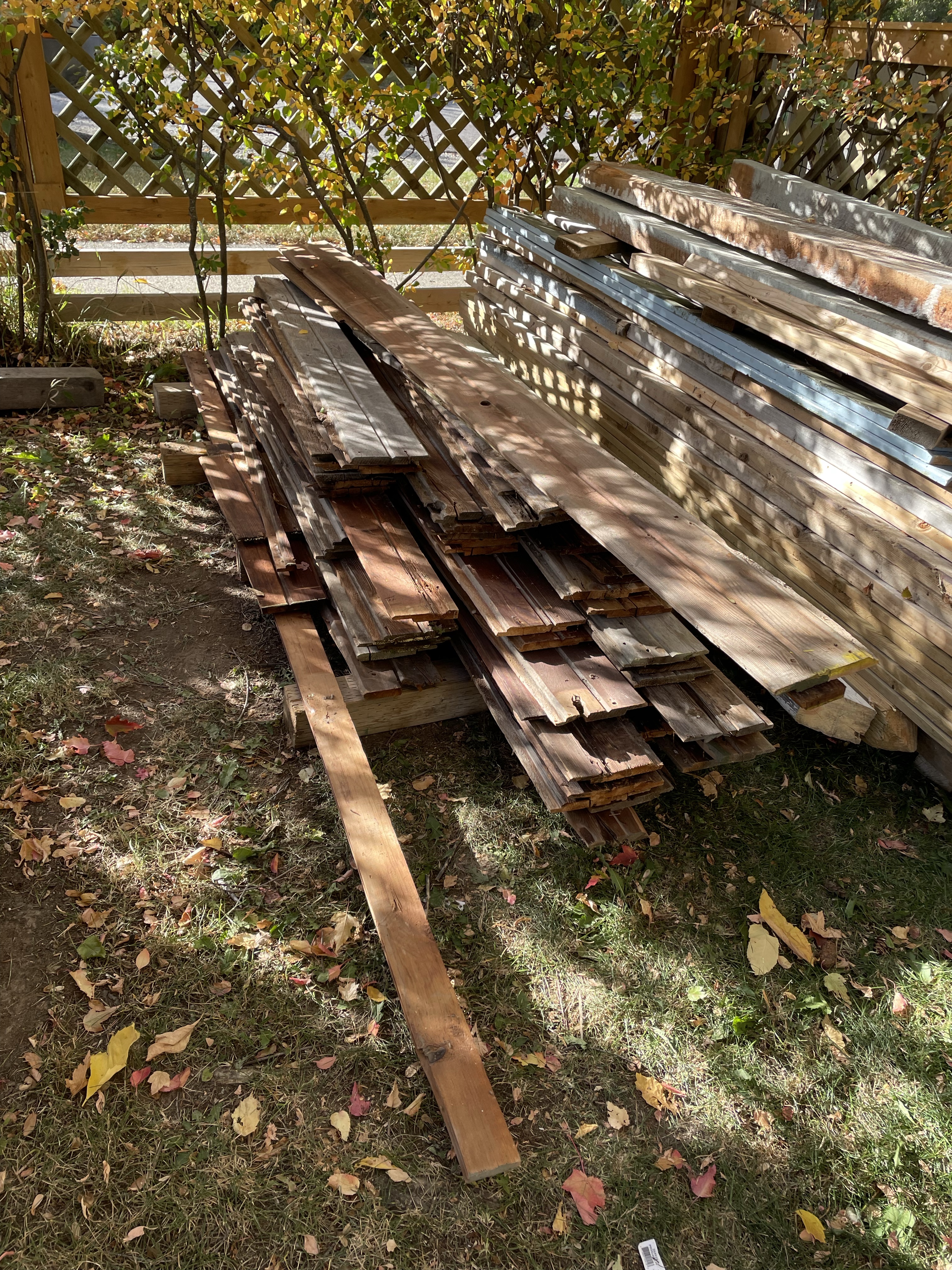When I arrived at Bill and Deannes I saw that they are tearing down their garage/shed/playhouse in anticipation of the builders starting on the new one. I instantly asked Duncan, the Director of the show in February that I am producing, if he thought we could use the siding for our set and he was down with that so we made a plan to meet at 10:30 in the morning to begin stripping and denailing. It feels so synchronistic!
