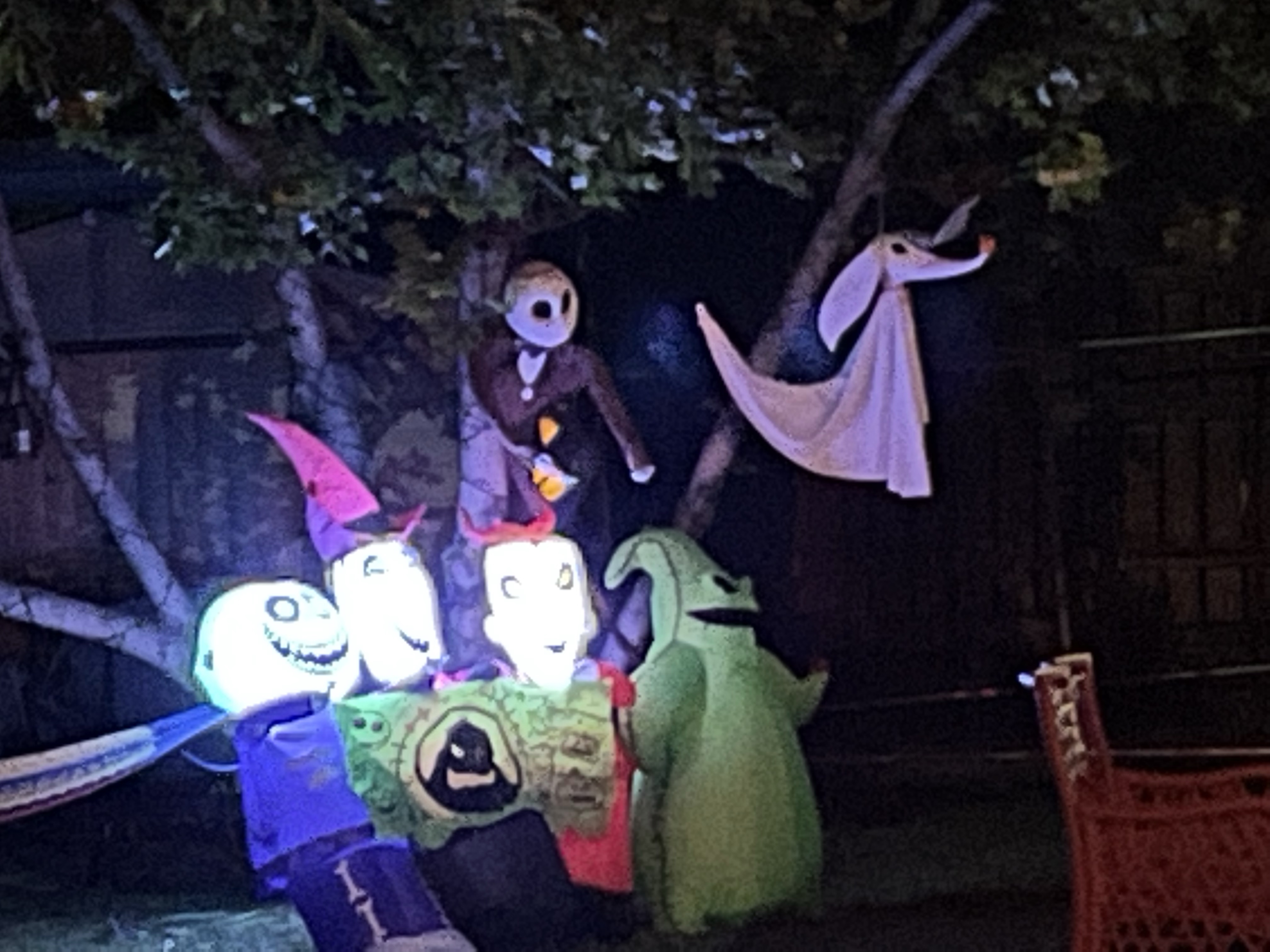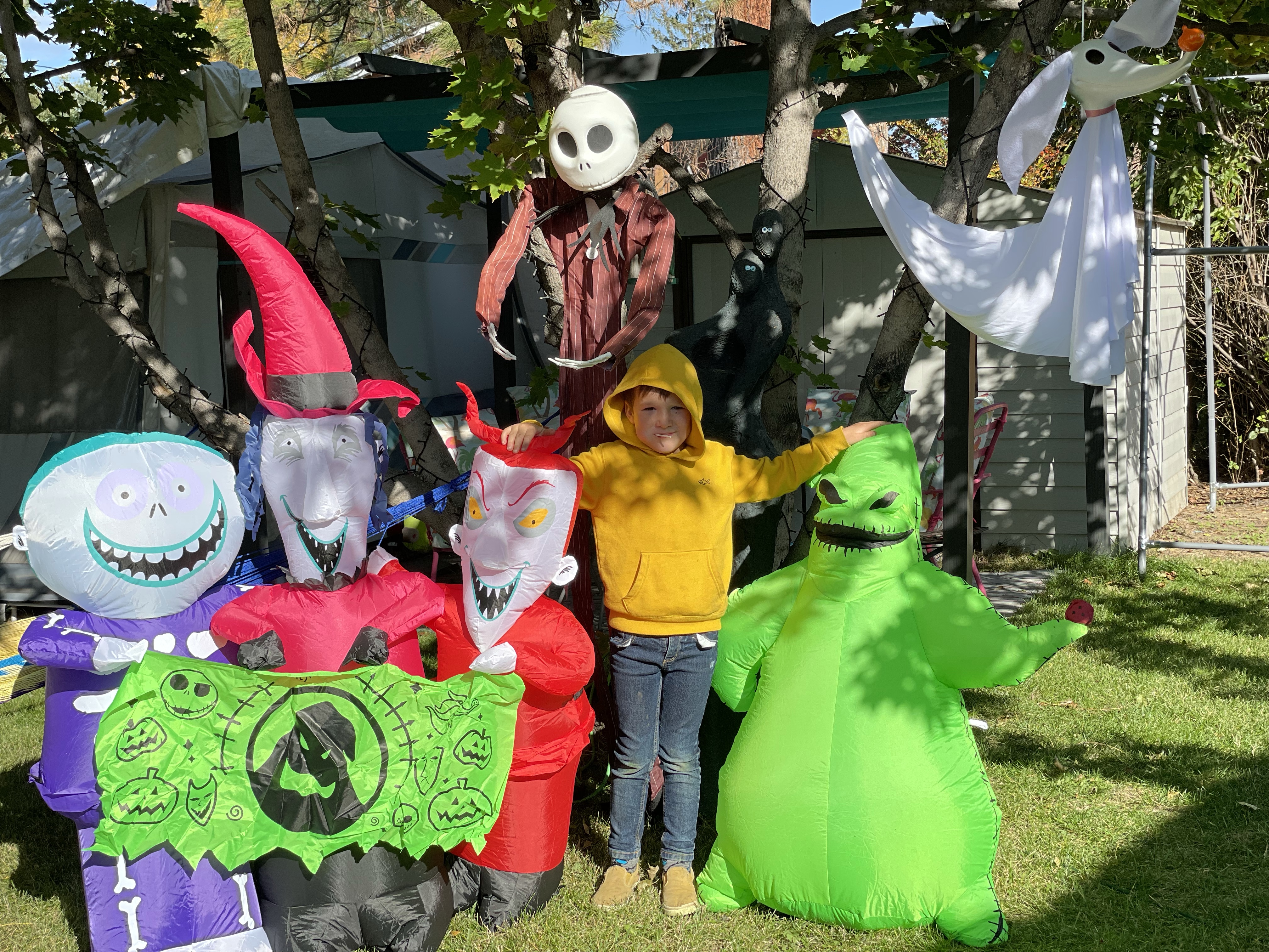 sawyer was the cutie patootiest kiddo. I heard little footsteps patter into my room and swung him up onto my bed. Google told me it was already 8:49! I was so happy he slept that long and was up setting him up with breakfast right away. I got dressed and settled in to play little big planet with him. We had fun and then it was time to leave. Just then I received a text from Duncan that he was running late. I decided to mow my lawn and begin setting up my Halloween inflatables, etc. Sawyer was very entranced with Lock, Shock and Barrel. He is also about the same size this year.