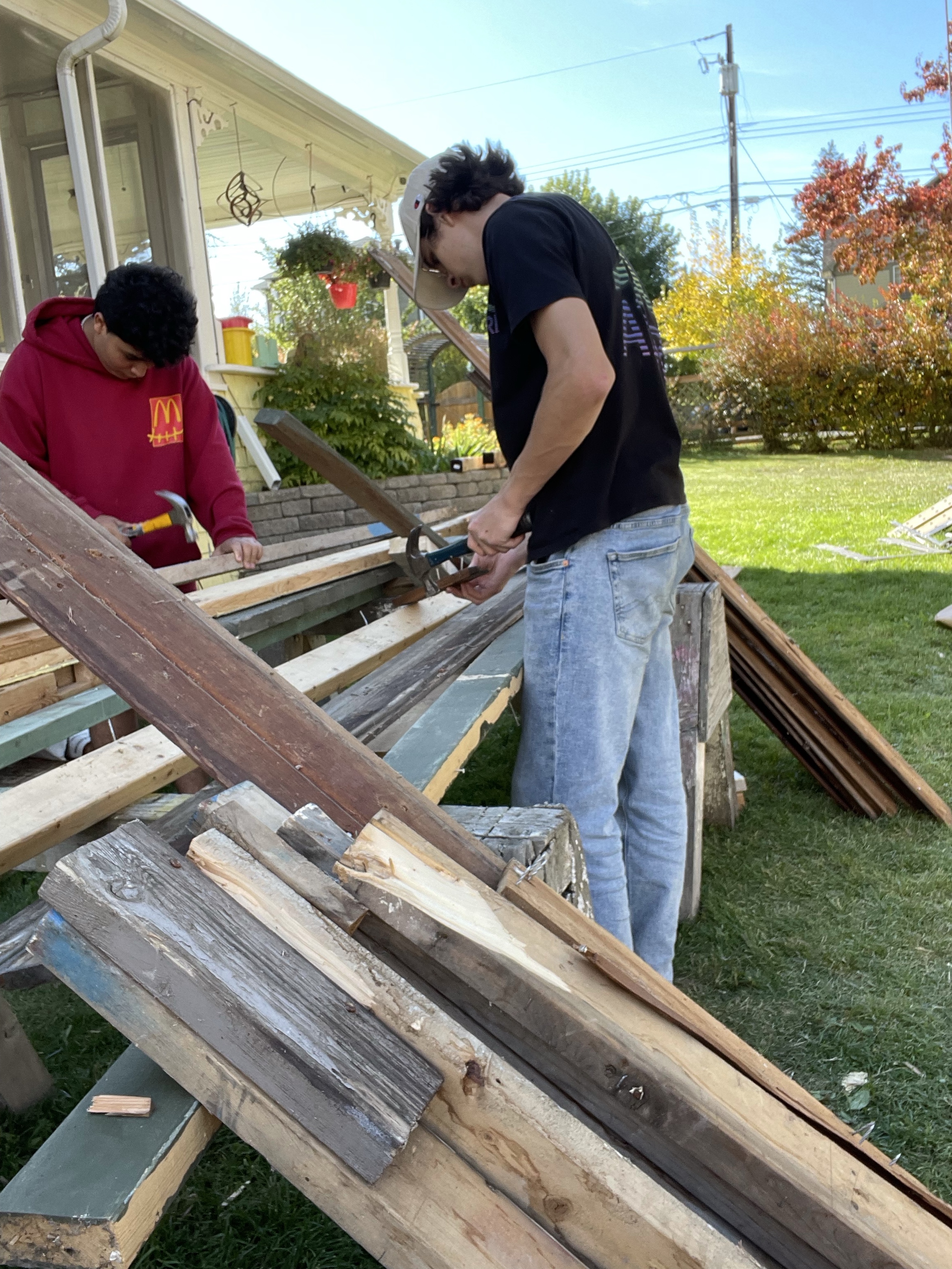 We arrived at the same time as Duncan and worked our behinds off until 4:30 or so, slowly removing cedar siding to use for the set for The Aliens. It was fun to work along with Duncan and learn more about him. Turns out he is born the same year as my son Jake! We had a stop for pizza and other than that just kept slogging. Deanne was pulling nails and later the international students took over which was awesome. We basically removed two sides of the building to a pile to be used for our show. I think it will look amazing. We also made a plan to have a first read-through social night,