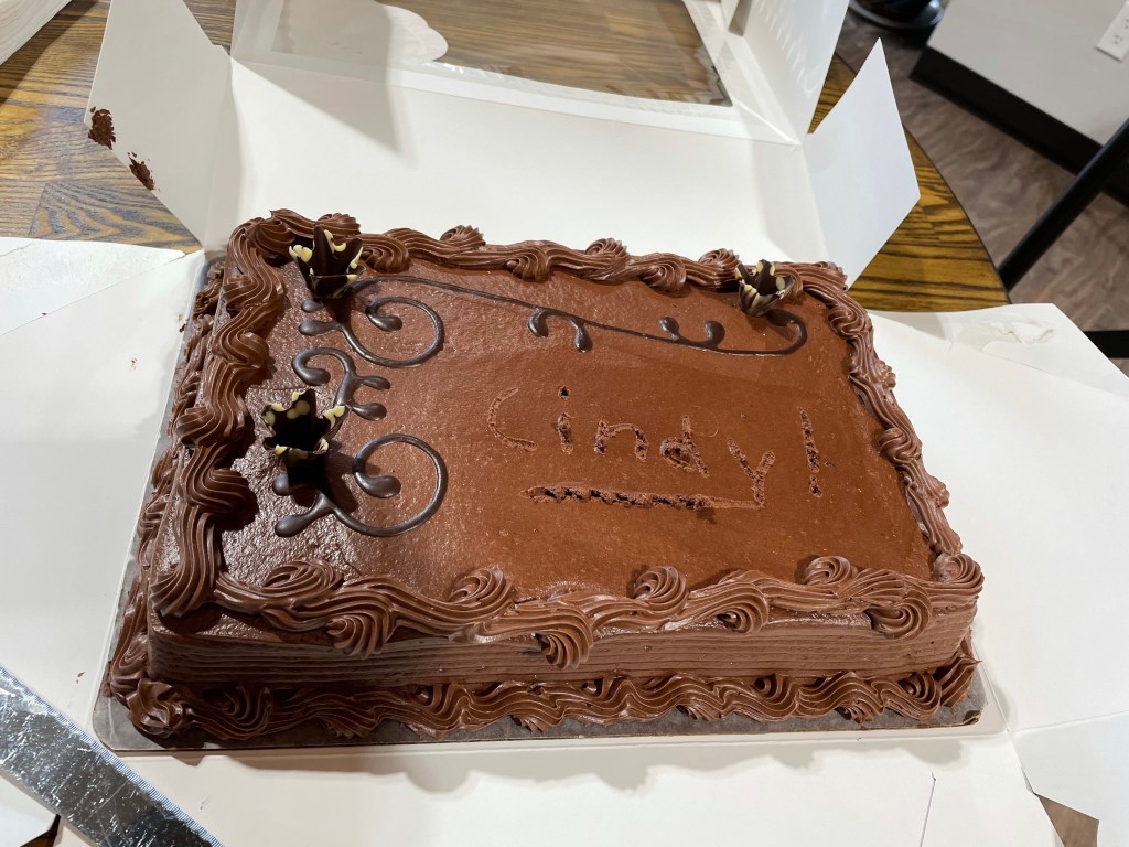 Back at the office I enjoyed my lunch and kept working on volunteer books. I reached out to the subs to confirm time frames for getting everything working back at the theatre. Then it was time to celebrate Cindy’s birthday. I saw the cake was plain so I carved her name into it with a fork before she saw it. I will admit the chocolate butter cream icing was delicious.