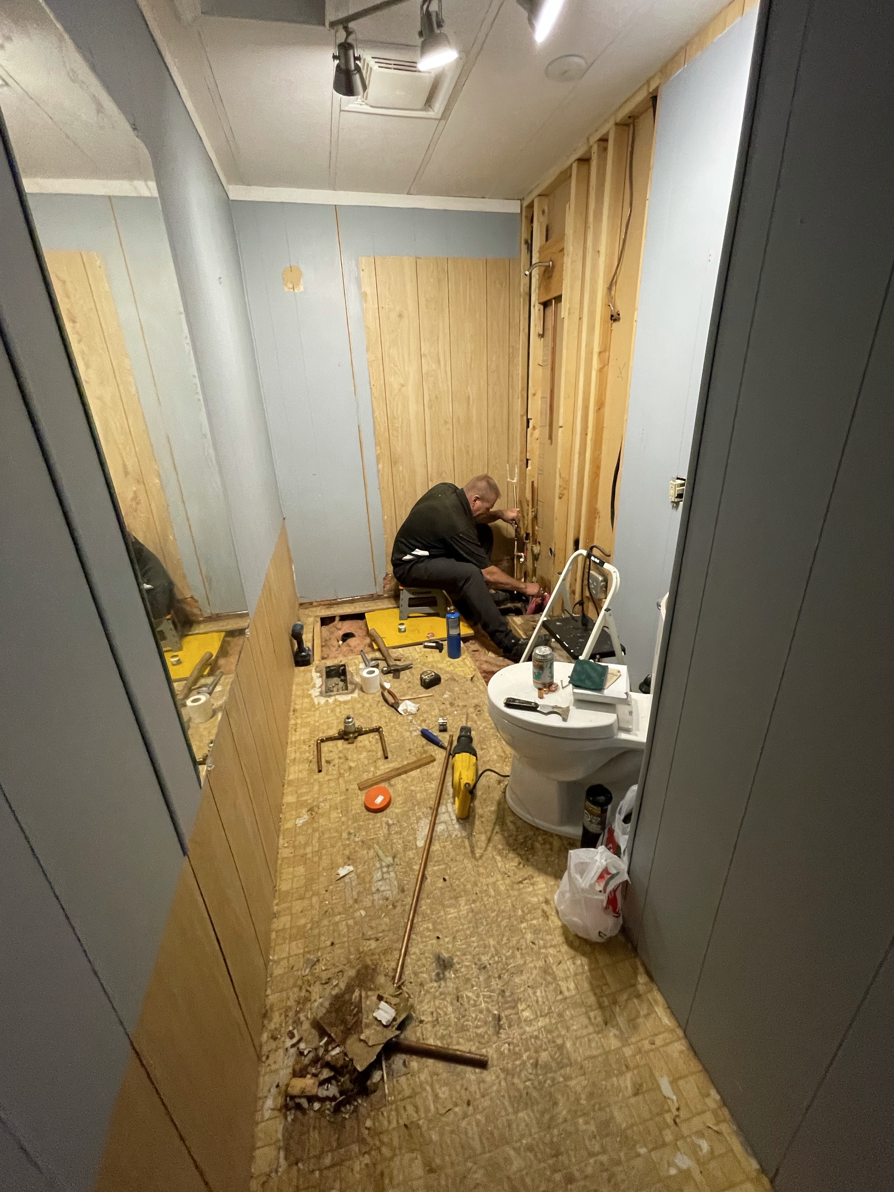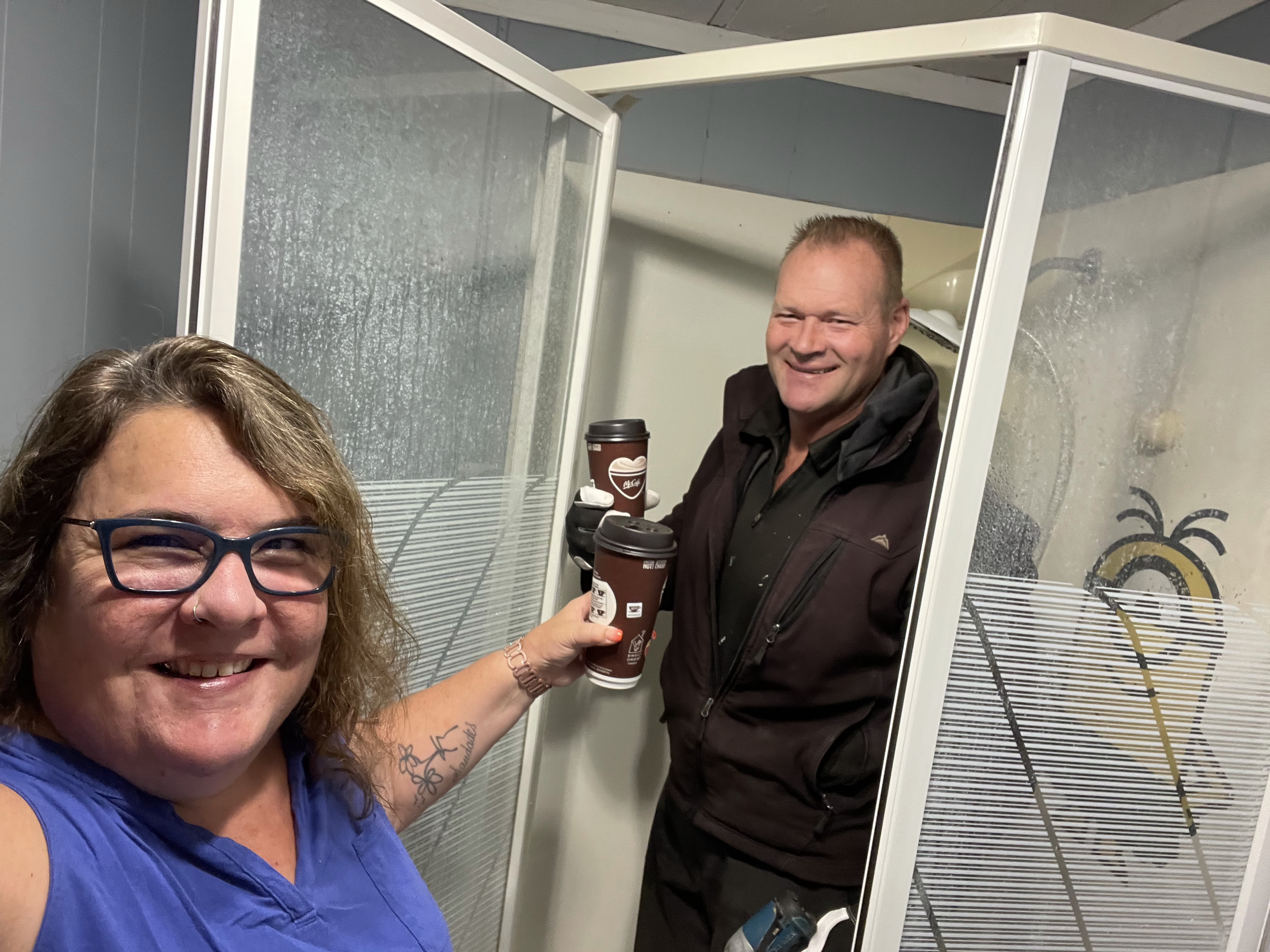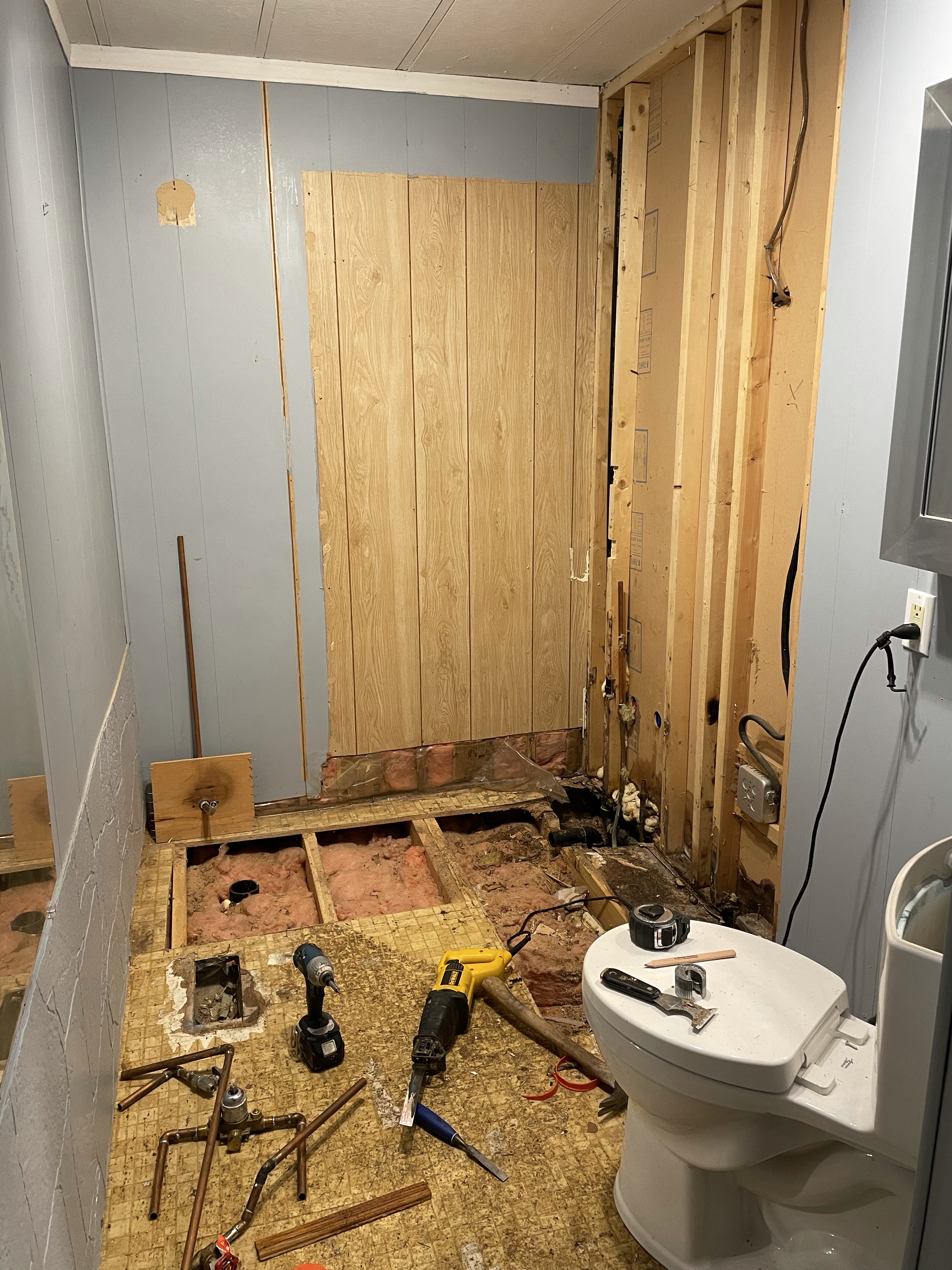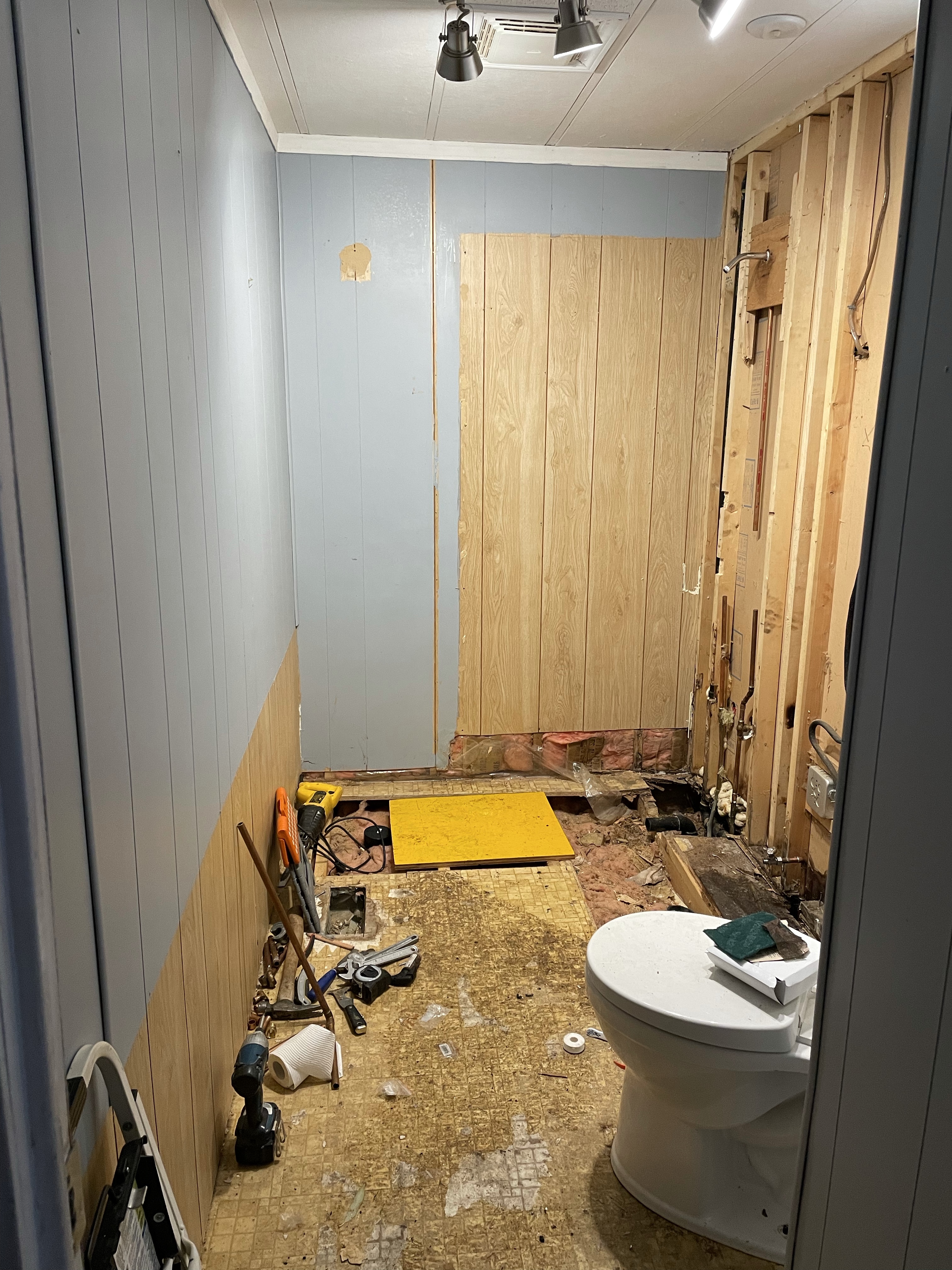 Gosh, the world is good when a friend shows up on time, coffee in hand for both of you and the back of his truck full of tools. I made a plan with Scott to pay him to work on my bathroom renovation and he stayed committed to it. He was great, worked hard and was a great problem solver when it came to the crazy we found under my shower once it was ripped out. I was so confident in him that I left to go to work for a few hours to run payrolls etc. I returned to so much done, I was doing a happy dance. I was the runner for parts and as always, it takes at least three trips to the Hardware store when one is doing plumbing. There were 4 layers of flooring! The shower had been installed over a big hole that went out to the crawl space without even vapour barrier, never mind insulation. By 5 it was time to call it a day. Unfortunately one leak hadn’t been solved so tomorrow that will be the first line of attack and for now, no water. I ordered a gorgeous wallpaper from Wayfair again. It won’t be here for a few weeks but it will match everything so well. On one of my runs to Home Depot I found my perfect vanity that is narrower than the current one and will allow more room for the toilet in its new position. It was about 300 more than I intended to spend but I think it is gorgeous. When I got out to the parking lot I couldn’t help but take a picture of the truck a couple spaces over. It was so Cranbrook.