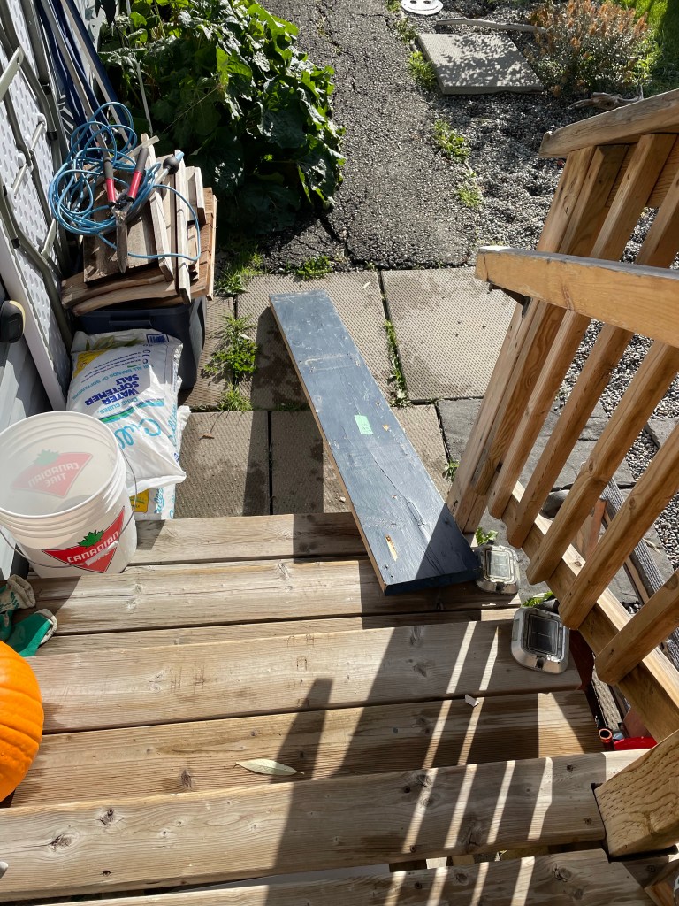 The wind kicked up and I heard a loud bang. I looked out the door to discover a big plank had blown over. There seems to be a good share of leaves on the ground now which I will have to deal with soon.