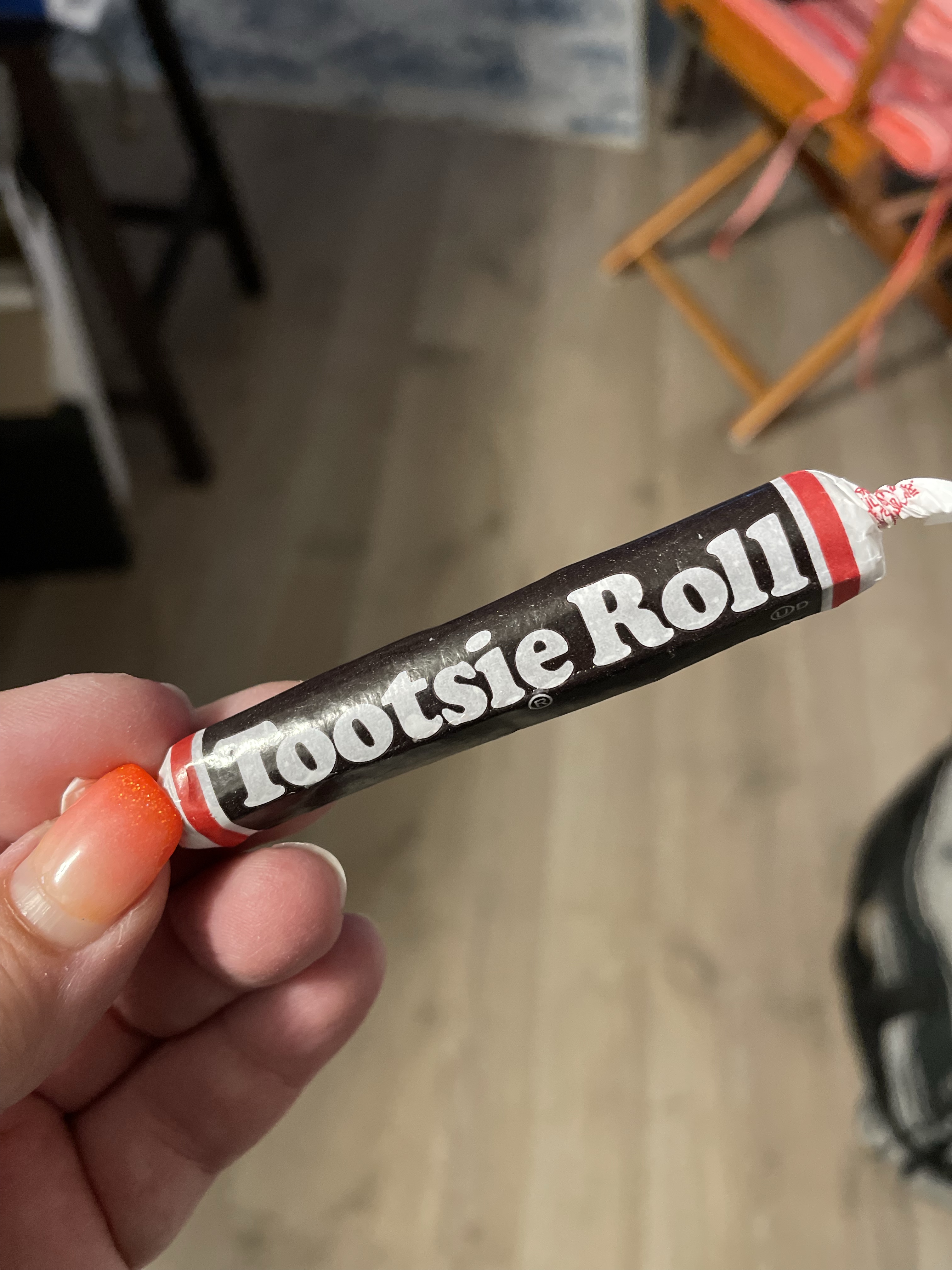 Tootsie roll in my pocket, you keep me going. I find you in the early hours of my day, you cause me to pull up my big girl panties, today has many hurdles yet to come. I keep reaching to see if you are still there, anticipating the moment I will need your comfort the most. The day slogs on, living up to its anticipated nightmare, you lurk in the shadows. I deal with others, trying hard to get things done with out placing blame. Steps forward, trips back, over and over and over. Technical difficulties, bulbs blown, people to disappoint, disappointment in others and still you wait. Missed hockey game, computer updates, how to find a bulb…. Argh. Home again, English lamb stew made, Hendrick’s G&T drank, 10:15, too late, no room for you.