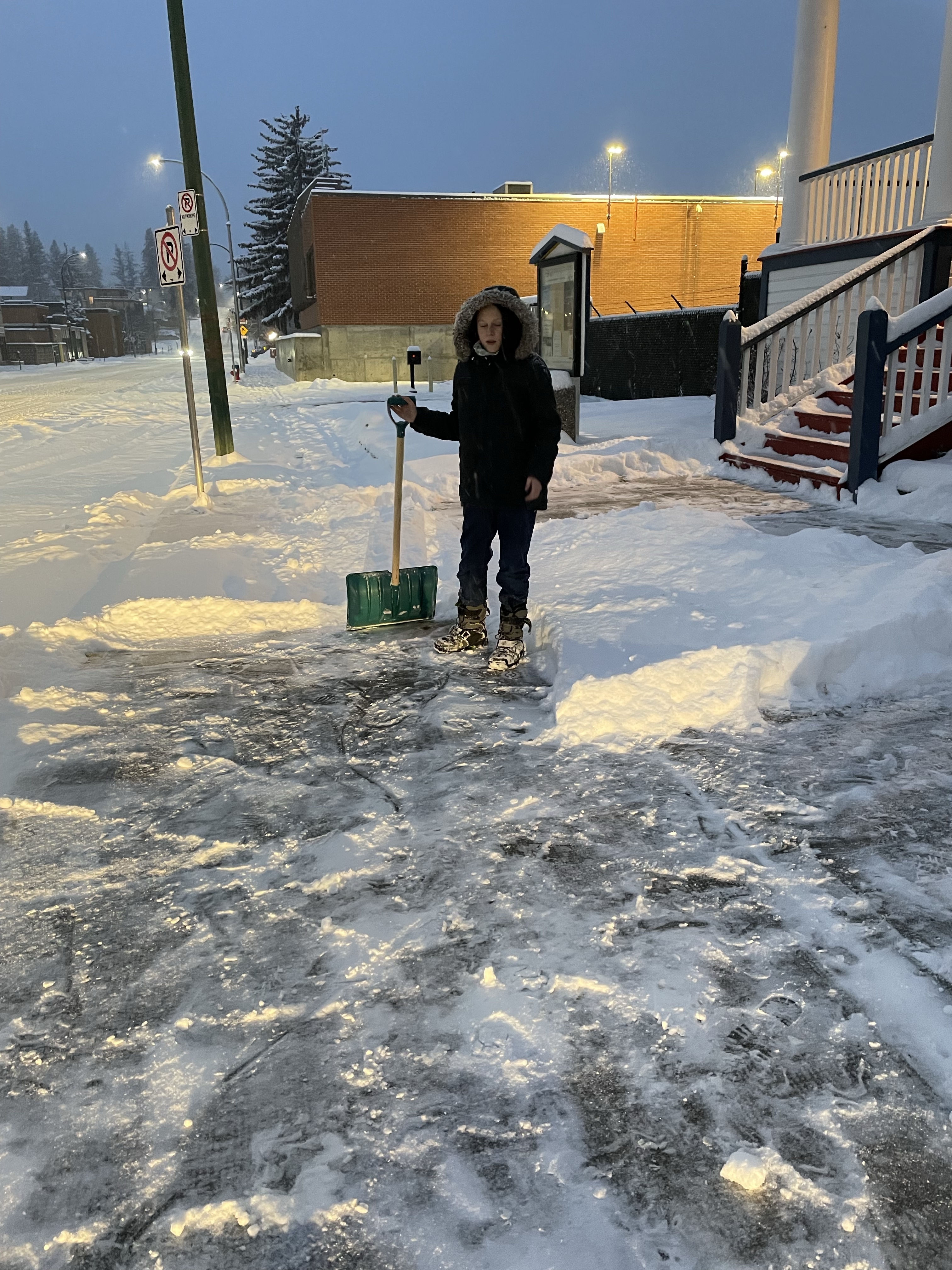 I had told the board of the theatre that I would ask my grandsons to shovel snow from the walkways and sidewalks. Since there was a winter snow warning I realized I had better make a plan. I will be away the next two days so it was even more imperative to make a plan. I talked to Rae first and she agreed Lukas would be the perfect one to take it on. I texted him and made a plan for when he would be back from sledding and I would be there at the end of the show run through I was invited to. He is such a good boy!