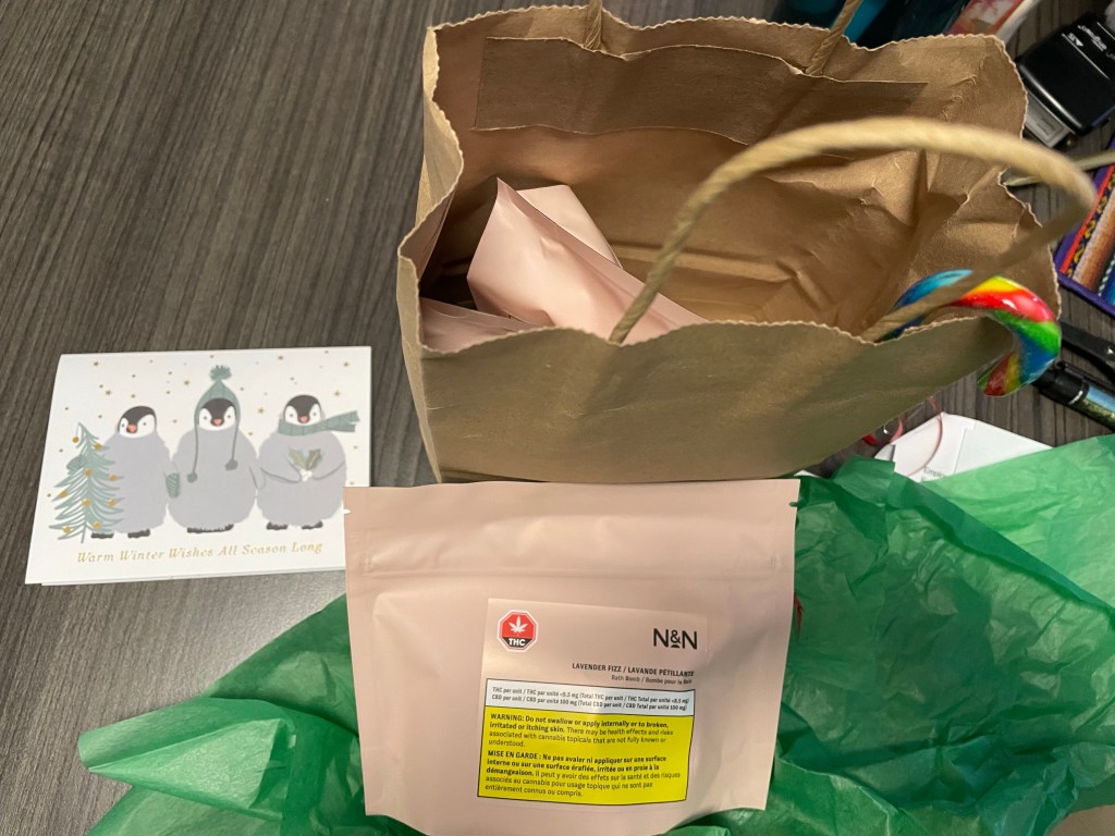 Lots of full focus things to do in an interrupted day but I was grateful for the nice breakfast start care of Nikki ordering for us from Hot Shots. After that it was full on. Clients in and out for assistance and to drop off a gift. Laurie brought me bath bombs to try from her store, Earth’s Own Naturals, which I am about to do when I finish this. Stacey stopped in previous to that and I gave her some I had bought for her to try. Funny timing. She invited me to come out and visit with them over the holidays, stay over if I like. I may just try to make that happen.