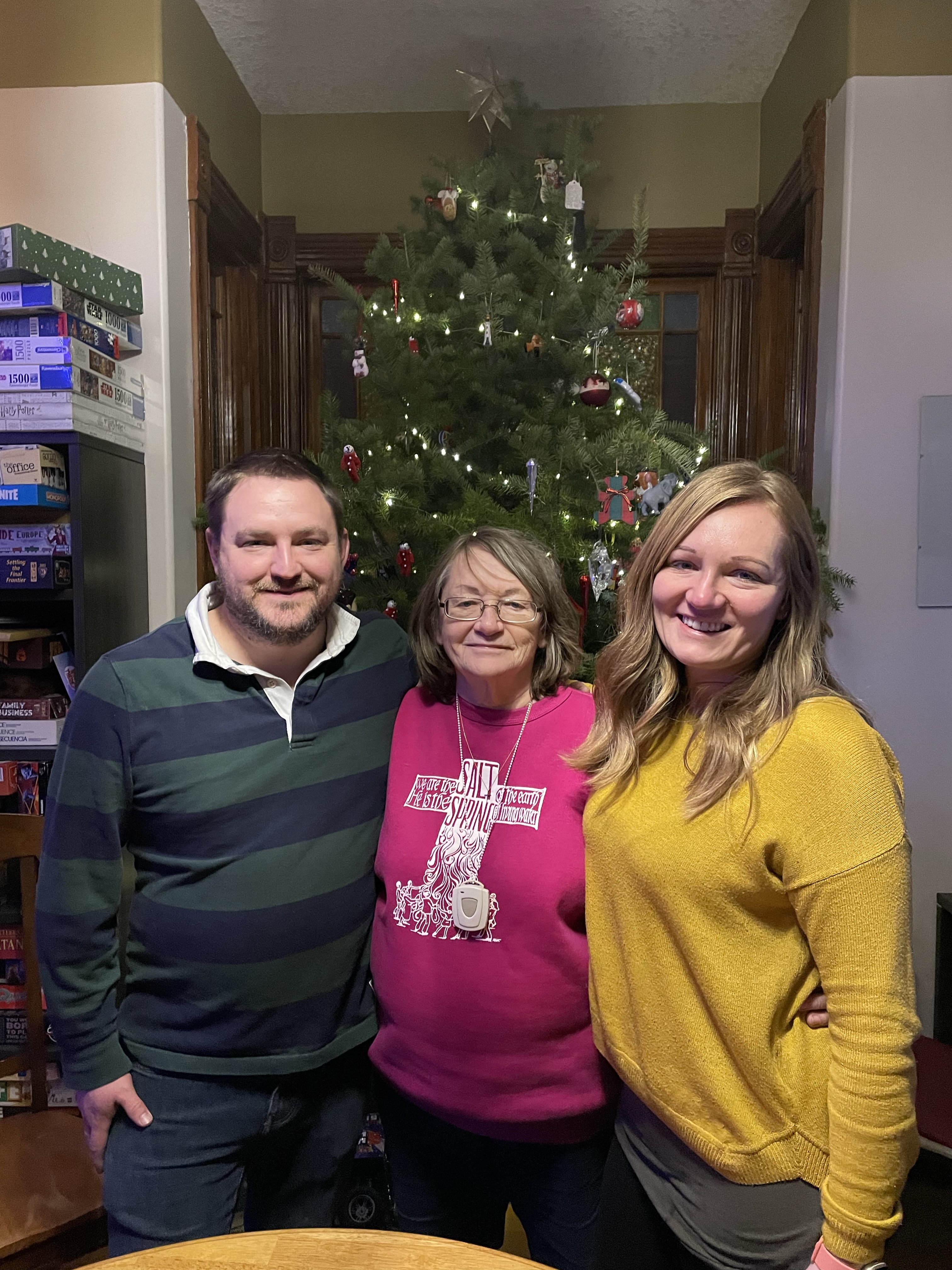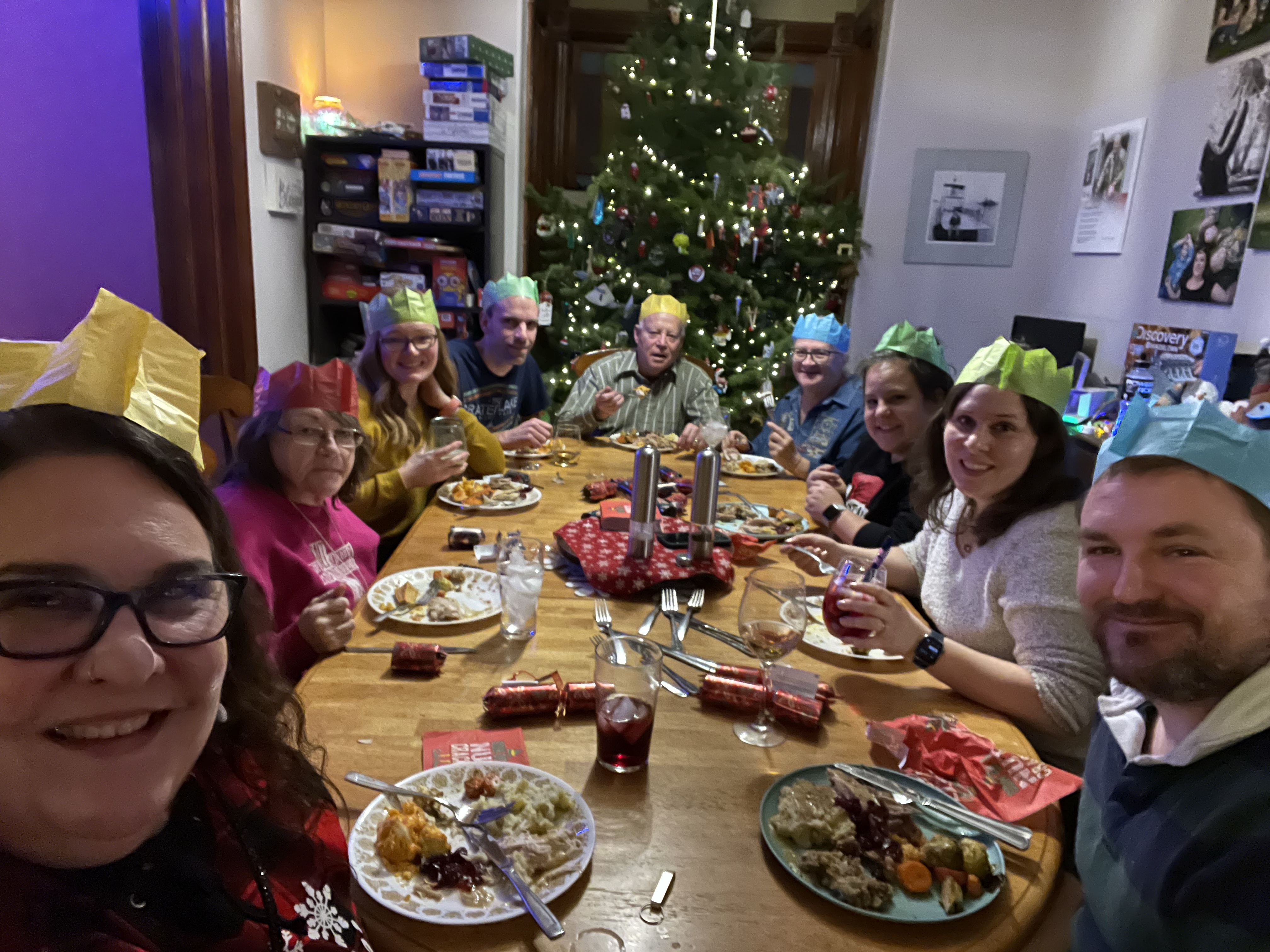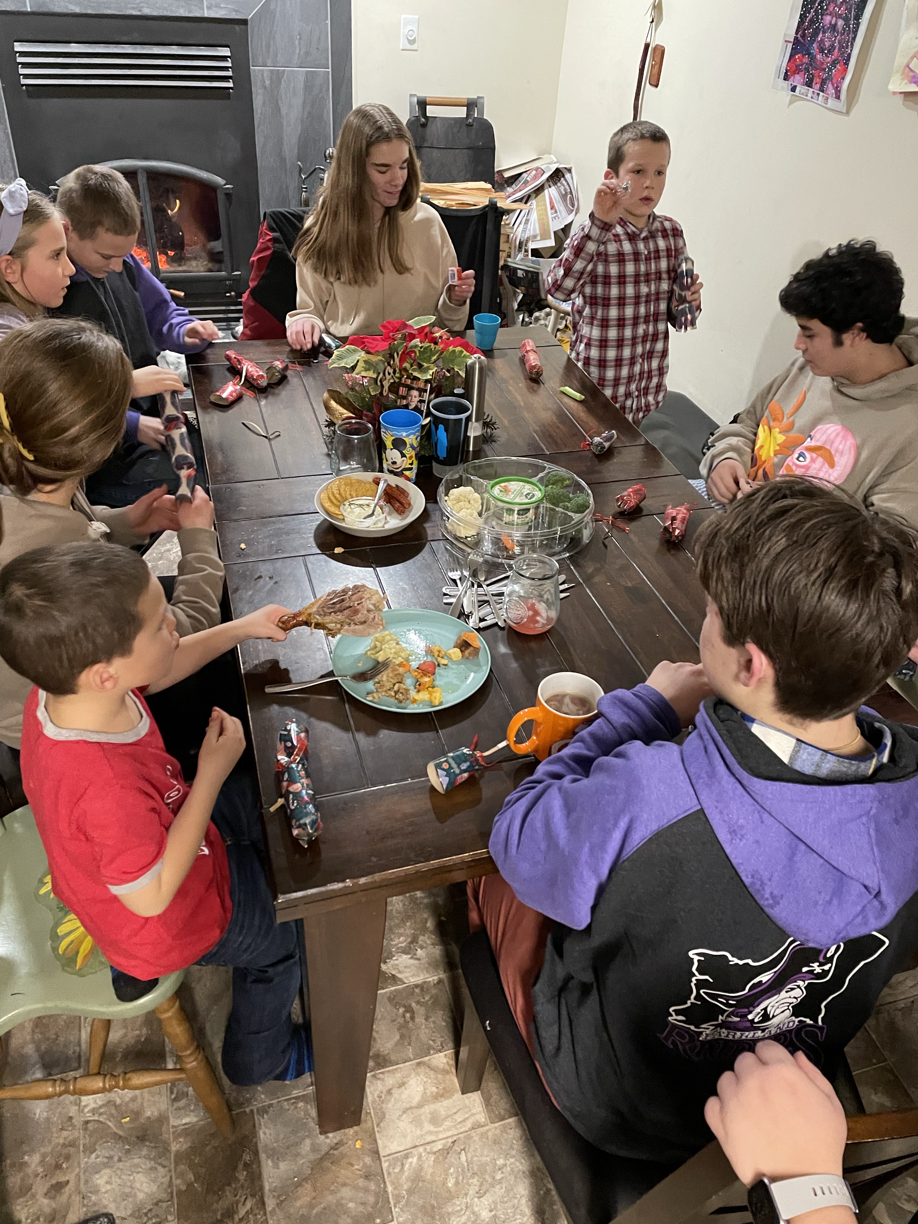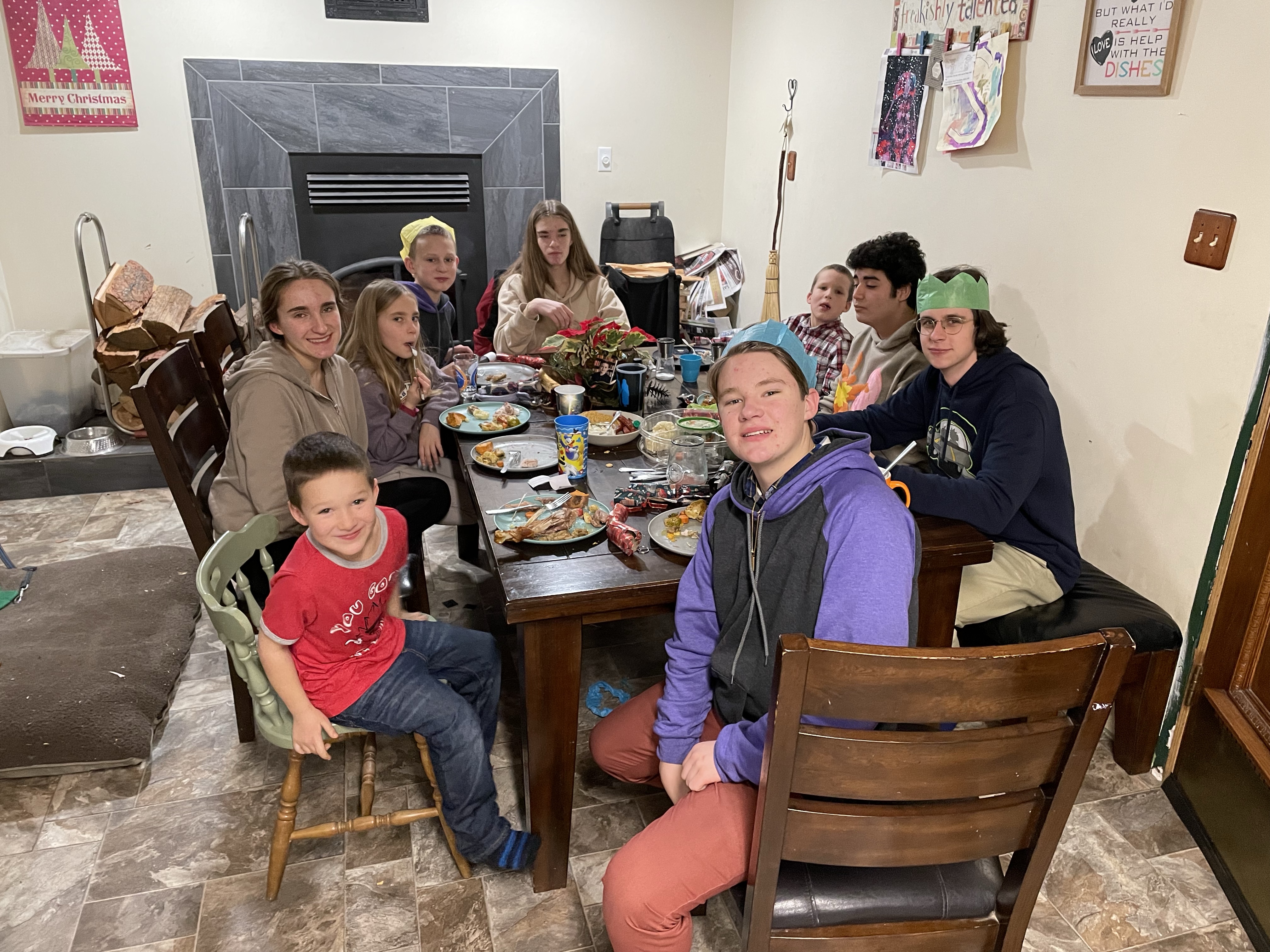 First thing on the schedule was to go with Ashlée so she could purchase a big screen TV on a Boxing Day Sale. Lukas tagged along and we headed to The Brick. There were some good deals and she found one she liked. Roger came to pick it up with the truck. Once back at the house we unloaded it and then hopped in his truck to head to Walmart. I need a new Keurig as mine is starting to fail.Ashlée was looking for a dog bed. I found a screaming door crasher deal on the coffee maker and a half price cat to match my Christmas dog as well as a few other 50% off items. No dog bed unfortunately. I headed home after that to drop off all my stuff, clear the drive and walks and take a shower. It was a bit harder shoveling as it was cold and the berm from the plow was heavy and hard. I really just wanted to crawl into a bath but had promised Will that I would be back to watch the second Harry Potter with him. I did go back and we took a long time to get through it as there were chores interrupting and then the Knights arrived. They are Roger’s sister, Margo, and her husband Rob and three girls, aged 8-16. They live in Olympia, Washington and went through all the tests and protocols to cross the border where they didn’t even ask for them! Bill and Deanne cooked a turkey and we all had a wonderful dinner together at Rae’s. After dinner some of us played the game I got for Christmas, Exploding Minions. It was fun but we are all so tired… I have much to clean as I have just been popping in and dropping things off. I enjoyed myself very much but am peopled out. And all those people in the house are loud!! It was a blessing to get a picture of Judy with her kids.