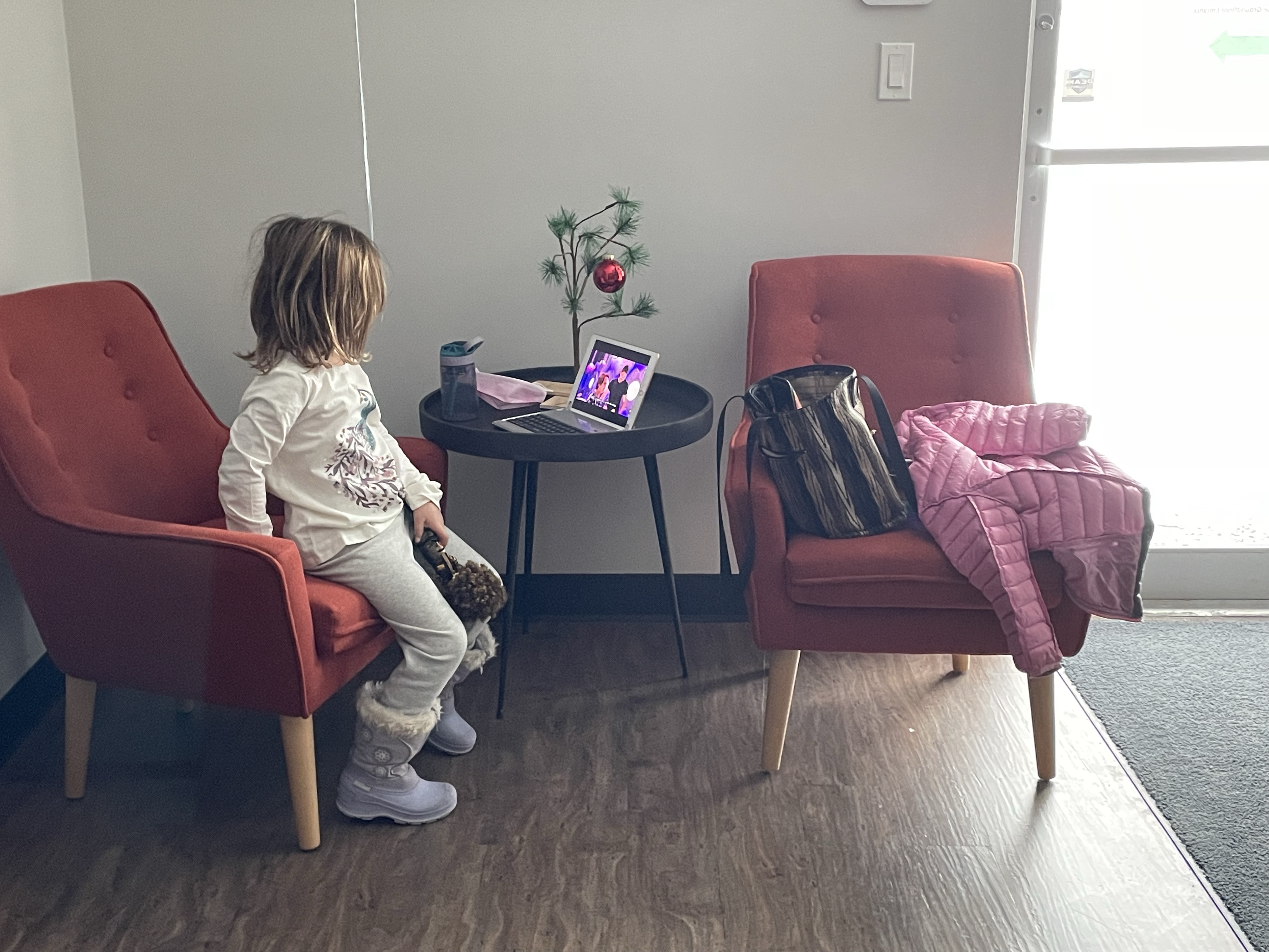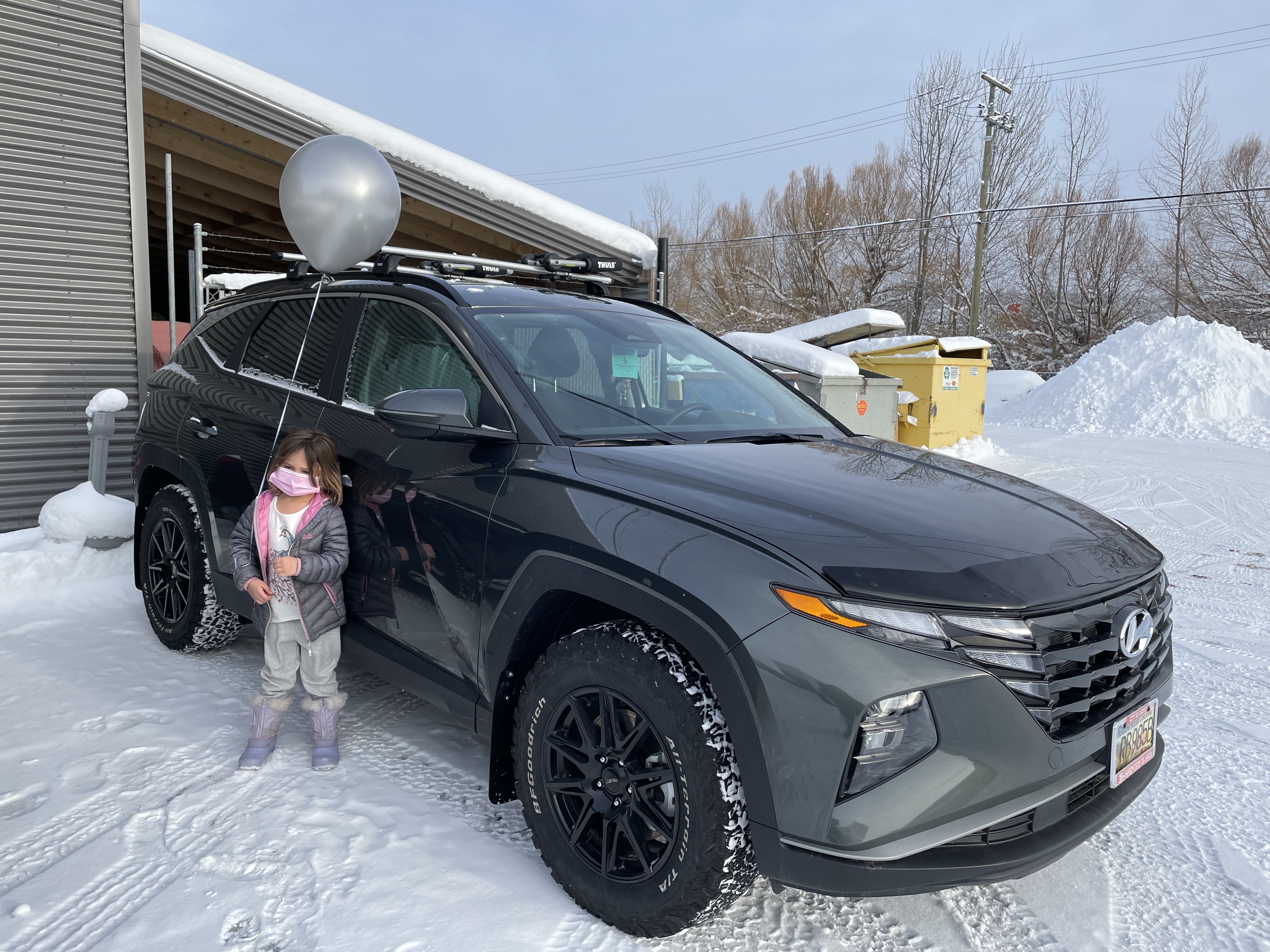 3:30 am was when Emmy climbed in with me and then at 5:40 she was fully awake. The therapists who say you shouldn’t have a TV in the bedroom don’t have kids in their lives. Thank goodness for Netflix, bought me a little more rest. Up and having breakfast, we watched the JoJo Siwa special who Emmy says she is the big fan of. It was interesting and I can say she is a good influence. Her hard working, happy, age appropriate style is a good role model for young girls. Thankfully we were done breakfast when my watch buzzed one hour until my car was to be in the dealership. I had forgotten. We got ready and headed out and it took a bit to warm up the car as it was -23! The plan is to install my trailer hitch and wiring, the decals and software update for my all terrain tires. Sean, the person I have been dealing with since the original sale was very sweet and got Emmy a blue balloon. She was thrilled. We were driven to work with a promise to get us back as soon as possible.