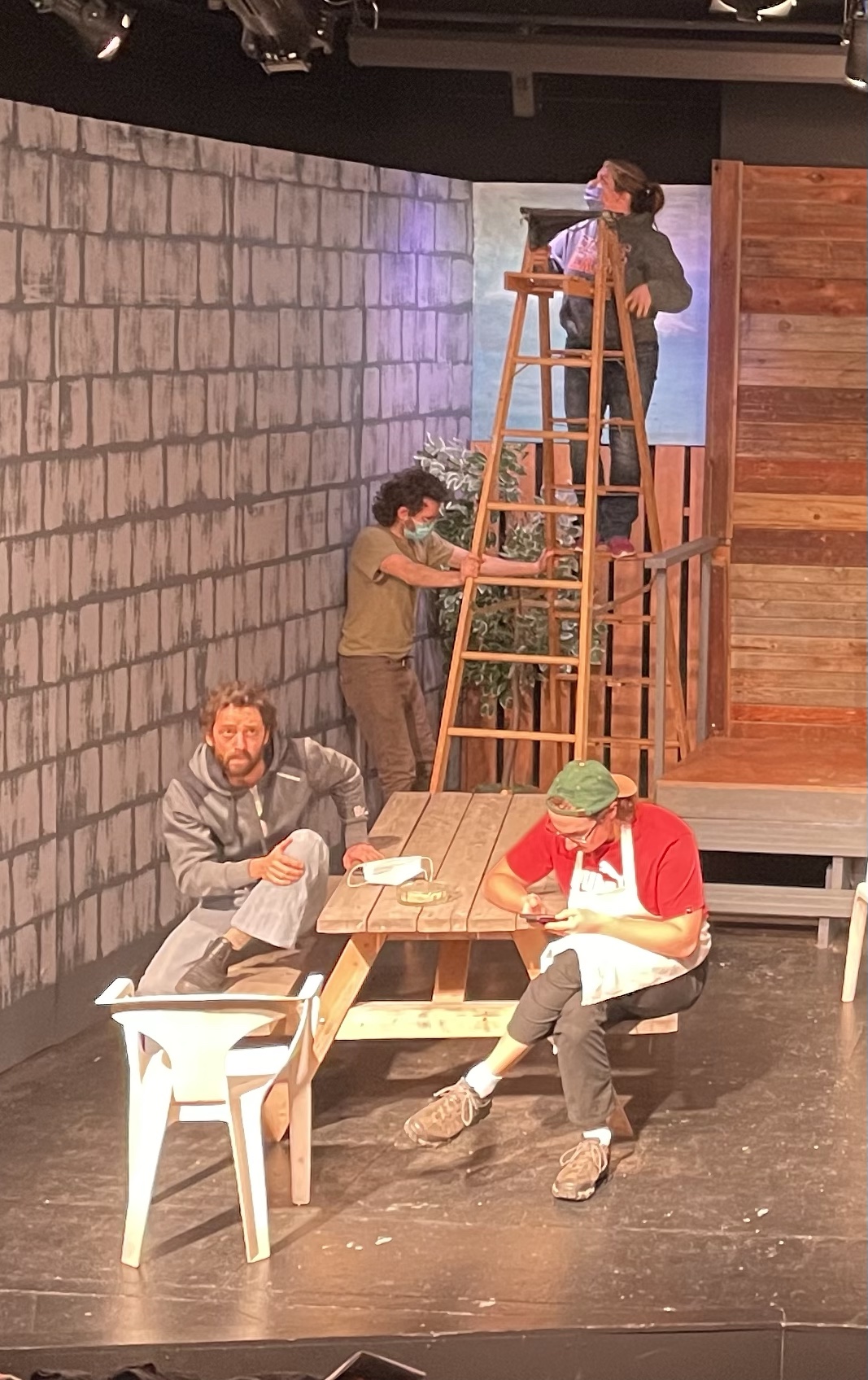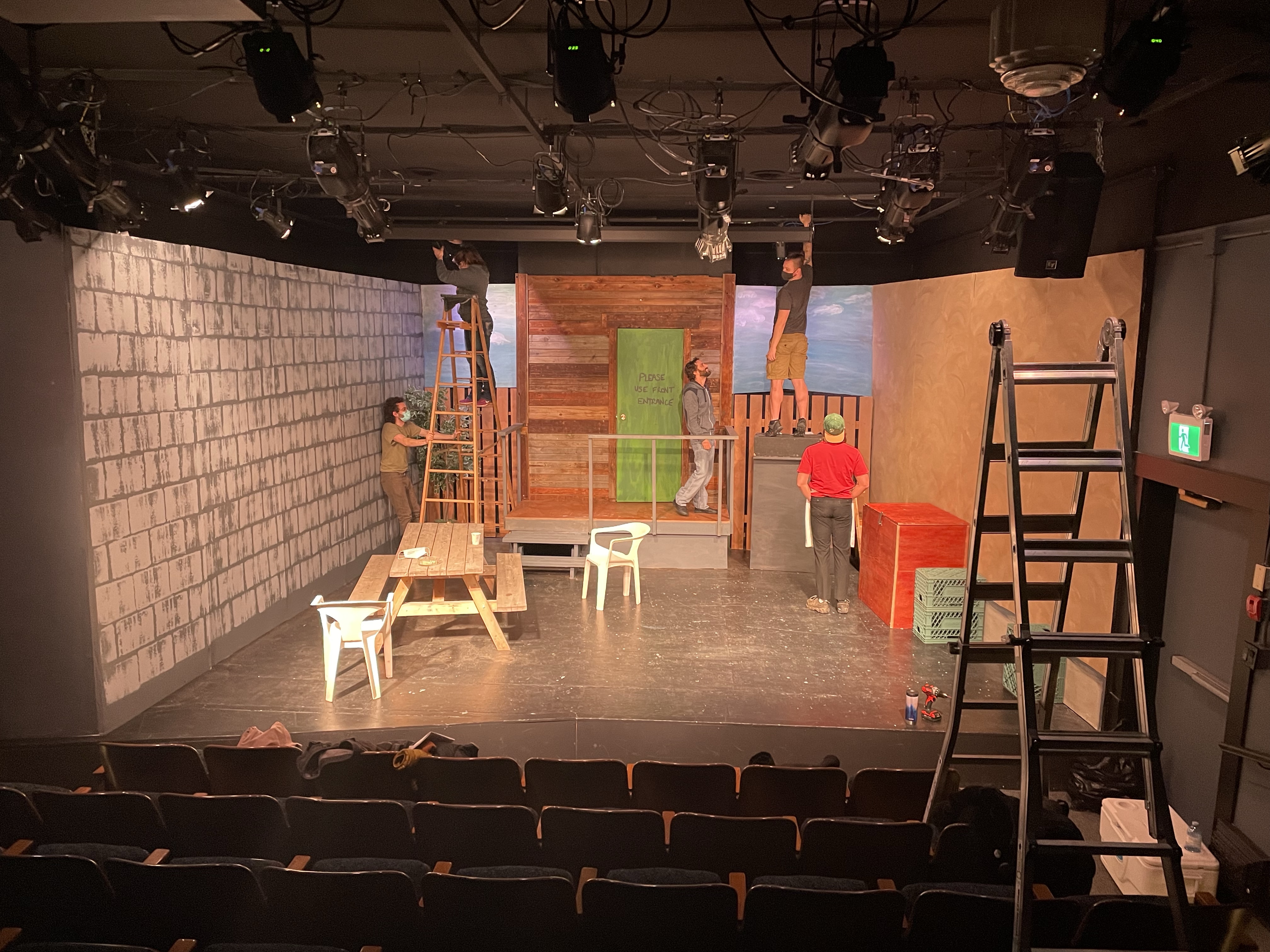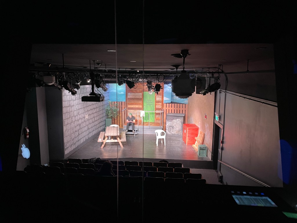 Today was a blur of books followed by media preview night at the theatre. And WOW, the guys knocked it out of the park. I am so dang proud of this whole team. Months of work have culminated in a piece of art. I only wish Annie Baker, the playwright of The Aliens could see how they brought her vision to life. The first audience, albeit a small one can be daunting and they pulled it off. Tomorrow is dark Thursday and then Opening Night on Friday. I admit there is a part of me that wishes I were running the tech for the whole run as I am so enjoying doing it. For the first time tonight after adjusting a few things before the show, I was able to hit all the marks. I guess you can teach an old broad new tricks. It has been decades since I ran lights and sound back on Salt Spring Island. The gear is so much better and the options to create effects are splendid.