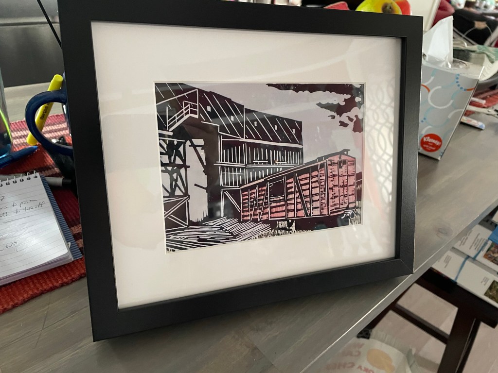 I decided I had better get my laundry done so I have something to wear to the Comedy workshop I am attending tomorrow. I forgot how long the washer takes and waited until it was done so I could throw it in the dryer. In the meantime I decided to frame the card I purchased at the Atlas Coal Mine in the frame I picked up at IKEA. It looks lovely and now I just have to find wall space for it.